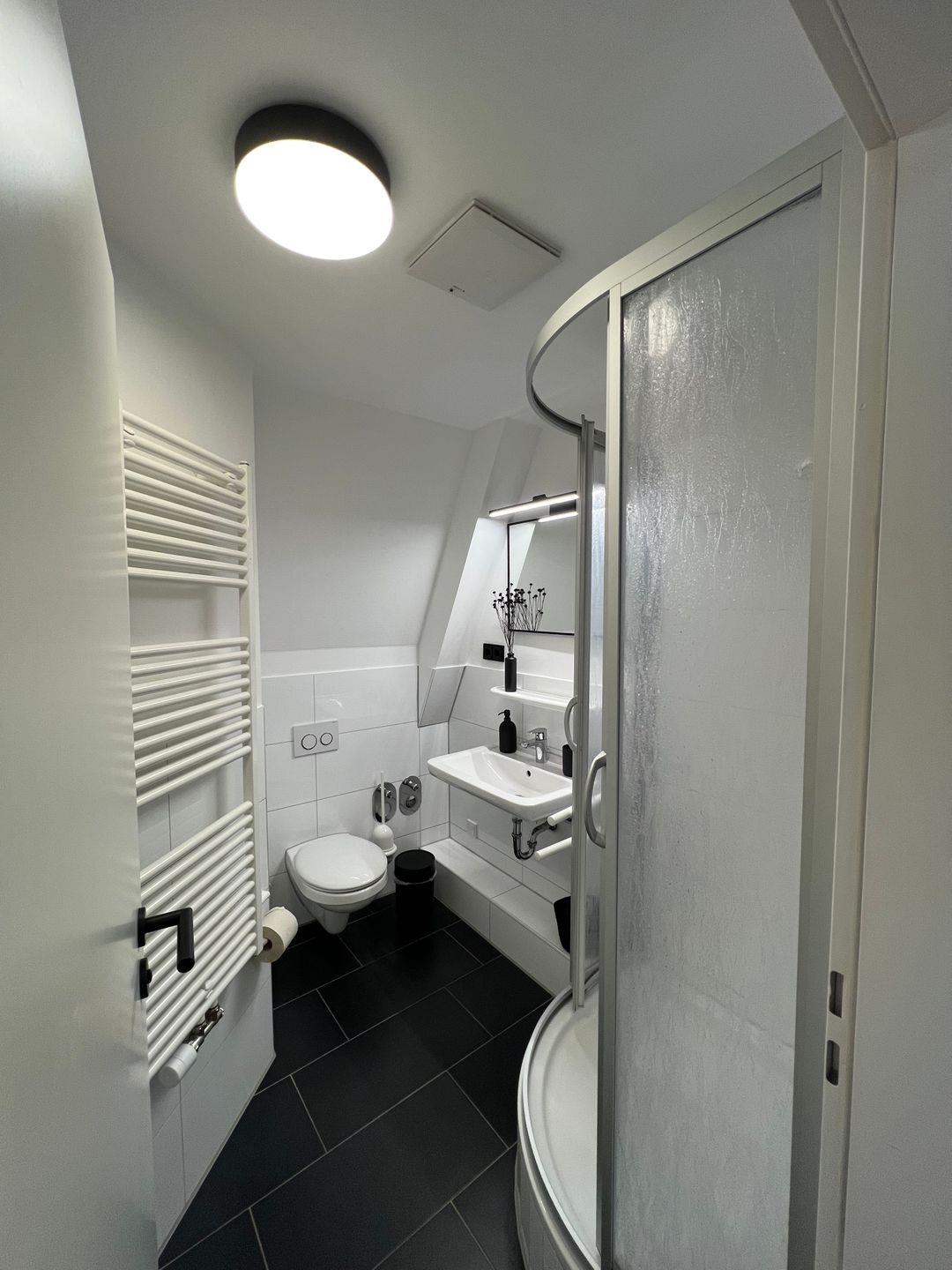 Das moderne Badezimmer mit Dusche hat eine Handtuchheizung und ausreichend Ablagemöglichkeiten für deine persönlichen Kosmetikprodukte. Handtücher, einen Haartrockner und Körperpflegeprodukte bekommst du von uns gestellt.