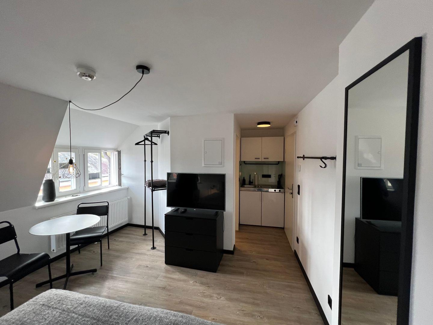Das 20 qm große 1-Zimmer Apartment (Nichtraucher) befindet sich im 3. Obergeschoss eines 2014 renovierten denkmalgeschützten Gebäudes und bietet Platz für zwei Personen. Öffentliche Stellplätze (teilweise kostenpflichtig) sind fußläufig erreichbar.