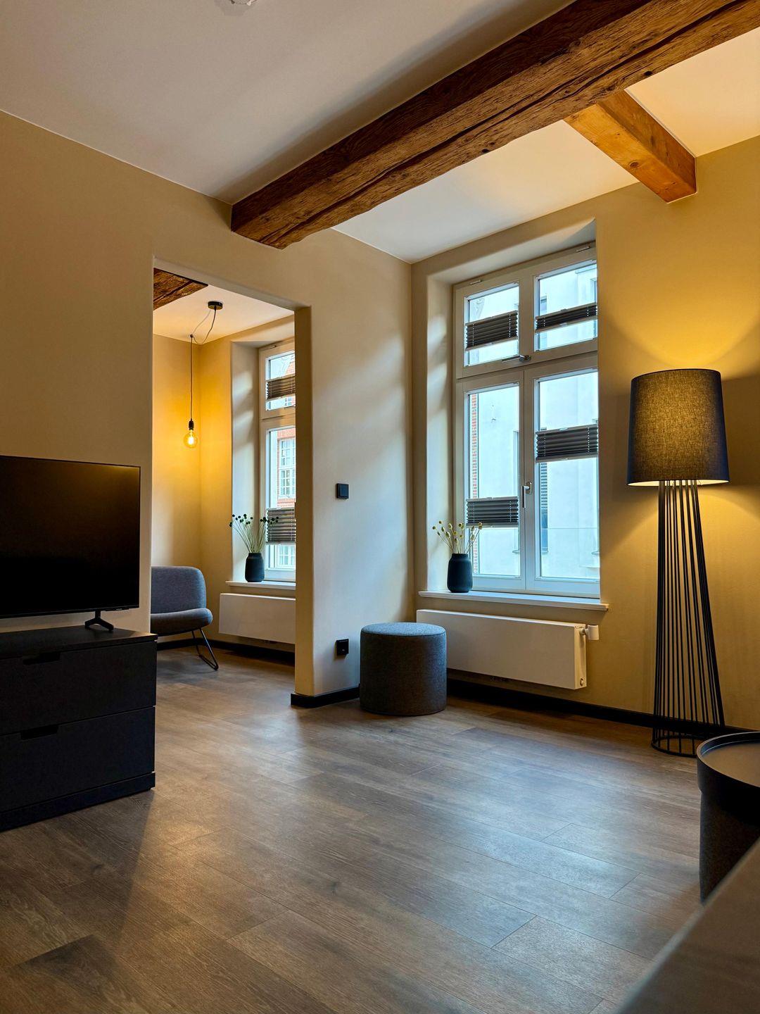 Das 46 qm große 3-Zimmer Apartment (Nichtraucher) befindet sich im 1. Obergeschoss eines 2025 renovierten denkmalgeschützten Gebäudes und bietet Platz für zwei Erwachsene und zwei Kinder. Öffentliche Stellplätze (teilweise kostenpflichtig) sind fußläufig erreichbar.