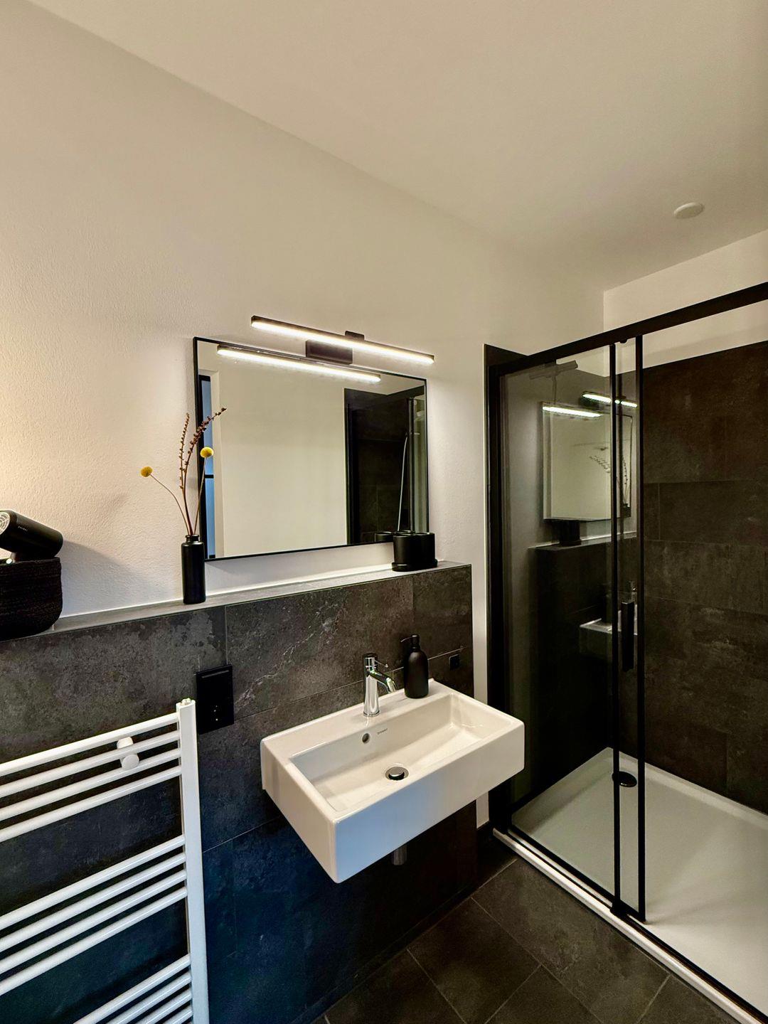 Das moderne Badezimmer mit Dusche verfügt über eine Handtuchheizung und ausreichend Ablagemöglichkeiten für deine persönlichen Kosmetikprodukte. Handtücher und einen Haartrockner bekommst du von uns gestellt.