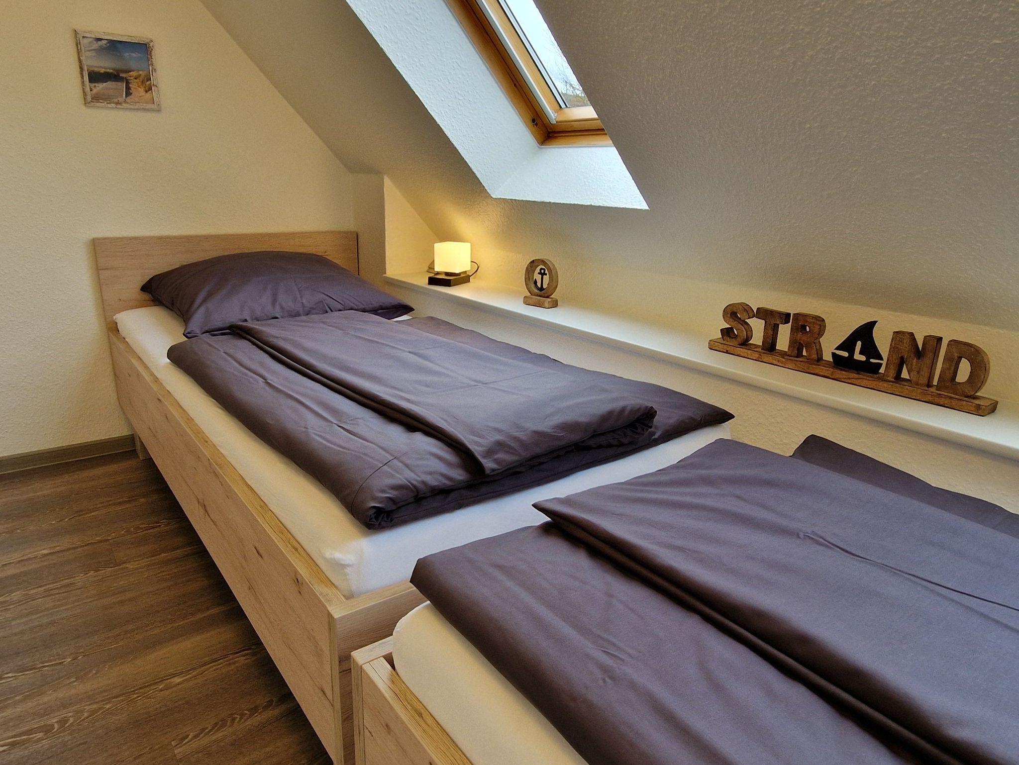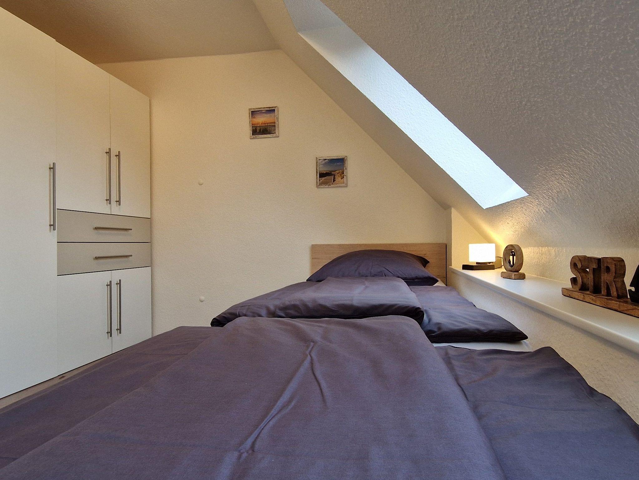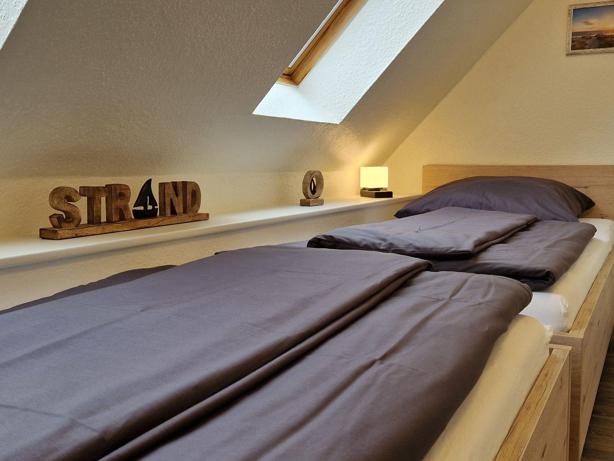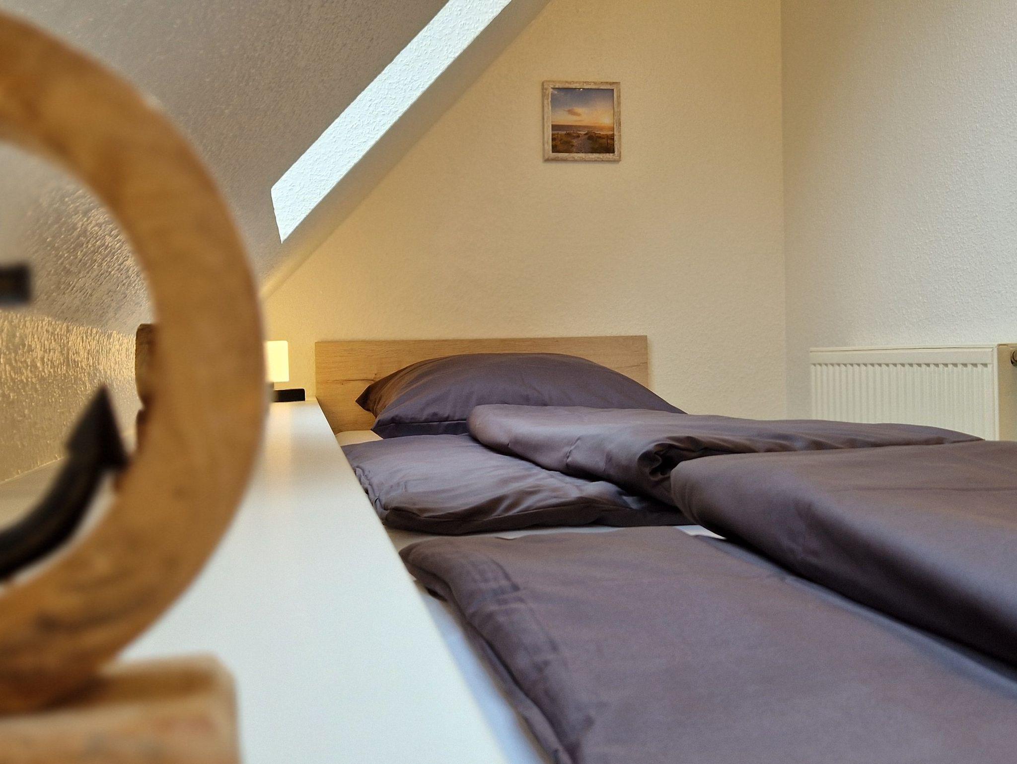 Im Erdgeschoss dieses geräumigen 4-Zimmer-Reihenhauses befindet sich ein großzügiger Wohnraum mit Essbereich und eine offene Küche, sowie ein Gäste-WC. Vom Wohnraum gelangen Sie zur Terrasse und zum Gartenteil. Eine Steintreppe führt vom Flur ins Obergeschoss, indem sich ein Schlafzimmer mit einem Doppelbett und Kinderbett (1,40m x 0,70m), ein Schlafzimmer mit zwei Einzelbetten und ein Duschbad mit WC befinden. Ein weiteres Einzelbett steht im ausgebauten offenen Dachstudio zur Verfügung. Das Ferienhaus bietet somit Platz für bis zu 5 Personen und ein Baby/Kleinkind.