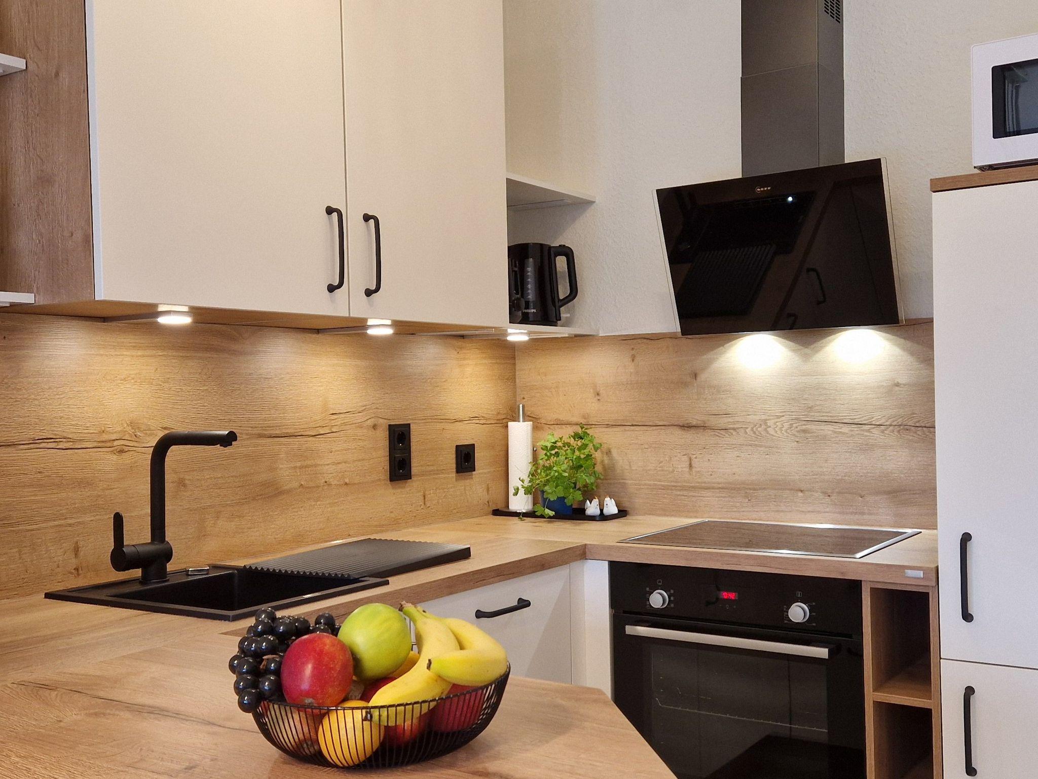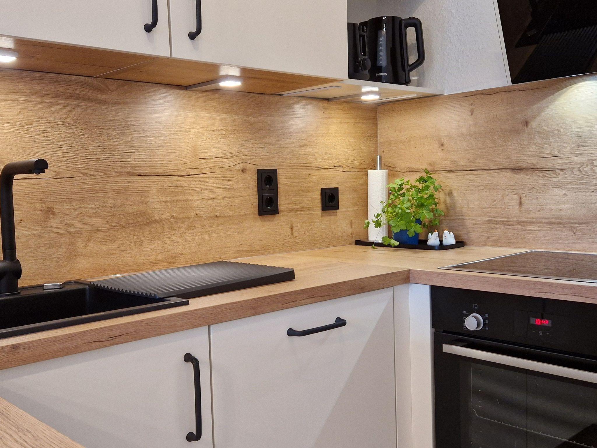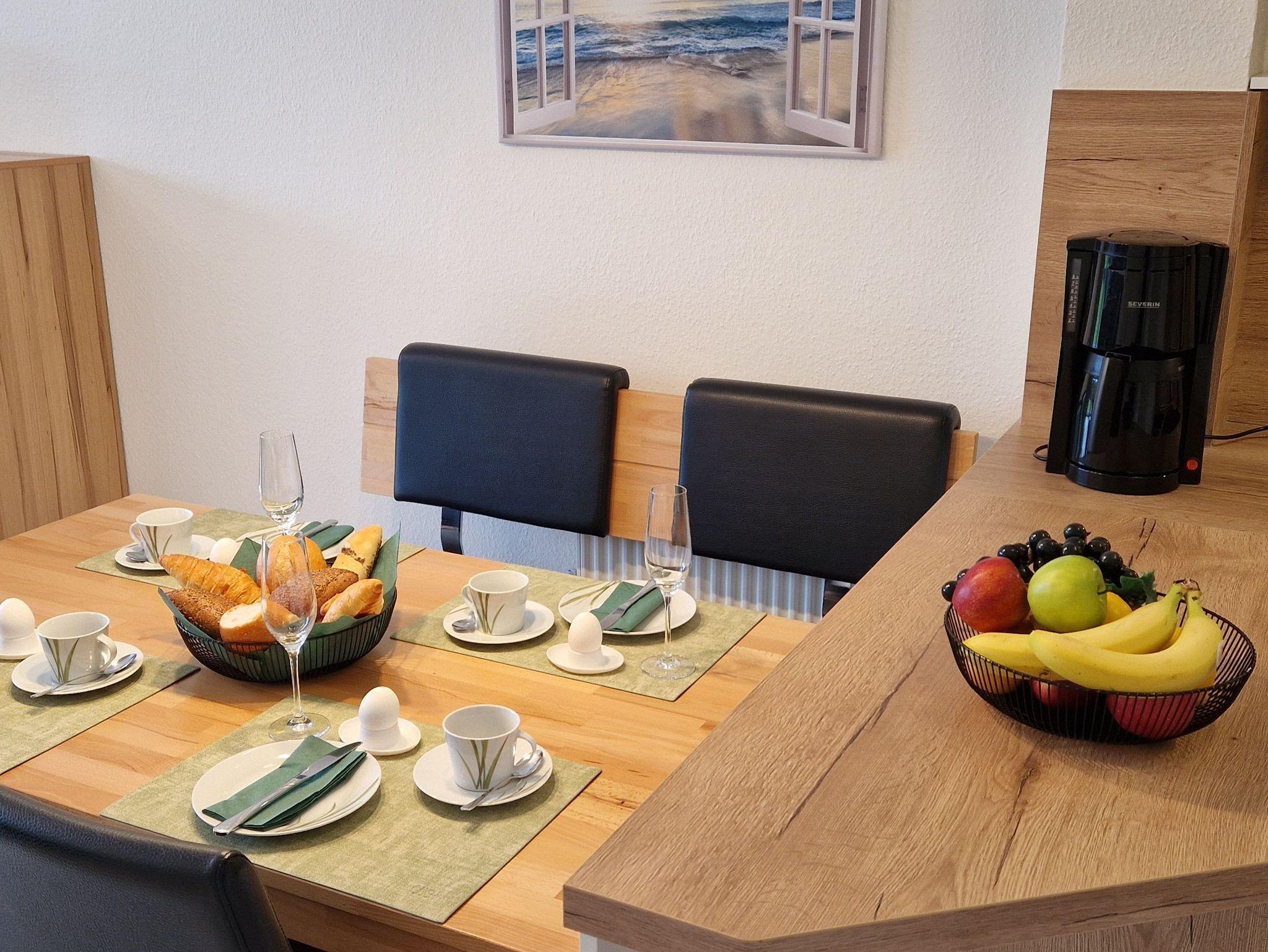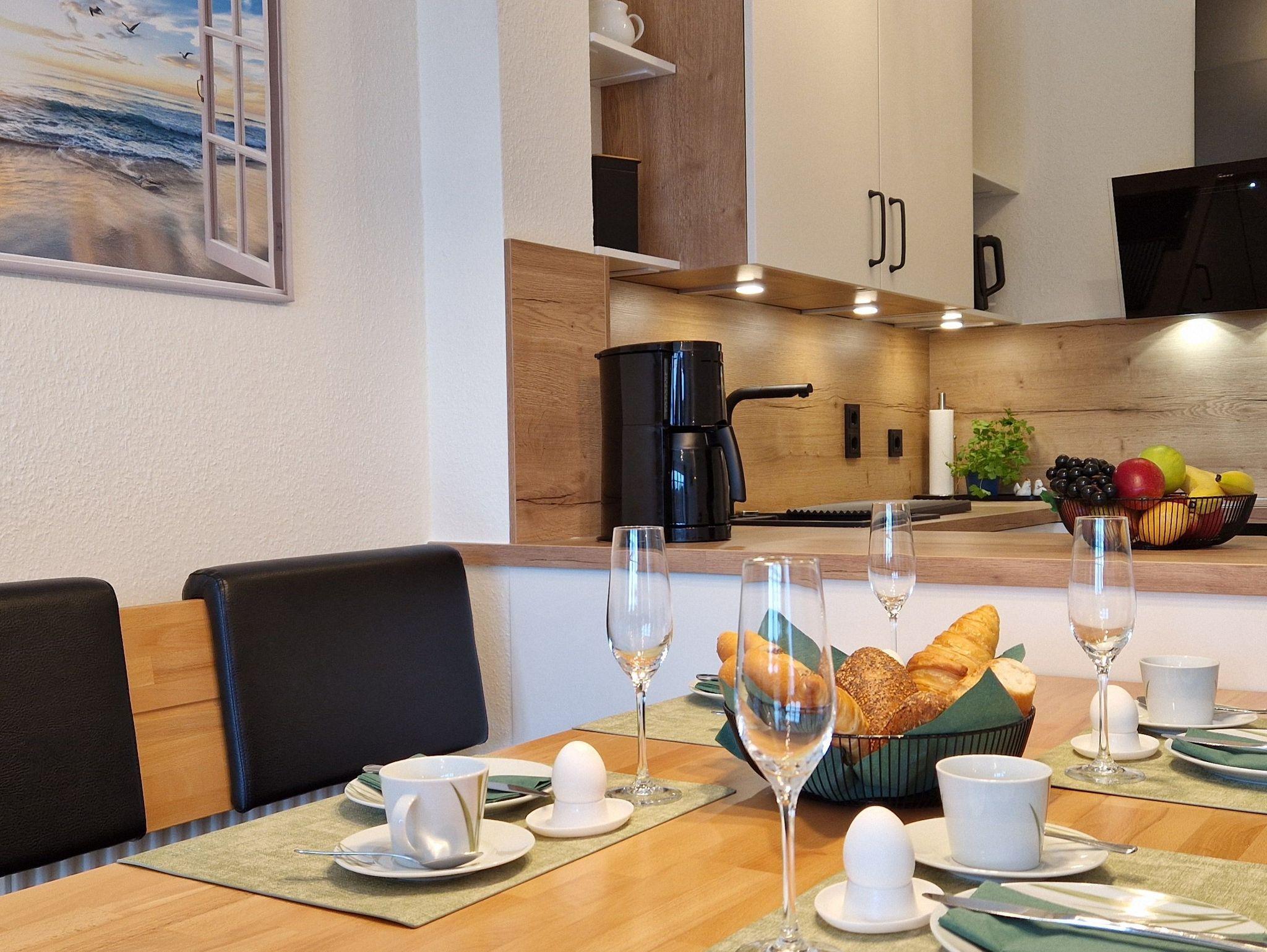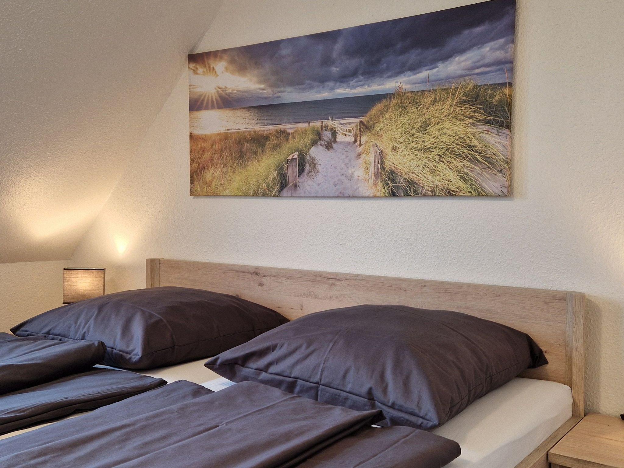 Im Erdgeschoss dieses geräumigen 4-Zimmer-Reihenhauses befindet sich ein großzügiger Wohnraum mit Essbereich und eine offene Küche, sowie ein Gäste-WC. Vom Wohnraum gelangen Sie zur Terrasse und zum Gartenteil. Eine Steintreppe führt vom Flur ins Obergeschoss, indem sich ein Schlafzimmer mit einem Doppelbett und Kinderbett (1,40m x 0,70m), ein Schlafzimmer mit zwei Einzelbetten und ein Duschbad mit WC befinden. Ein weiteres Einzelbett steht im ausgebauten offenen Dachstudio zur Verfügung. Das Ferienhaus bietet somit Platz für bis zu 5 Personen und ein Baby/Kleinkind.
