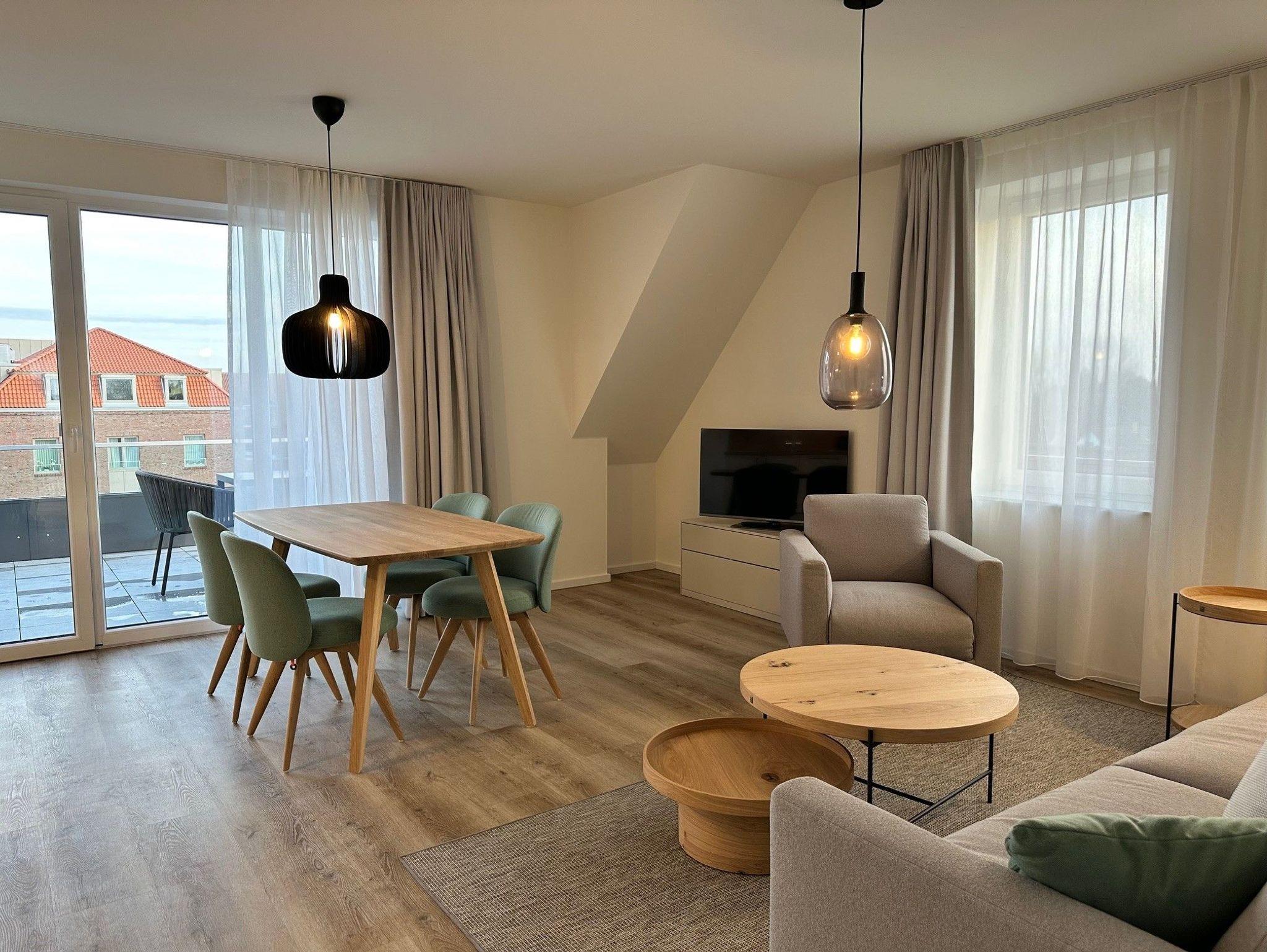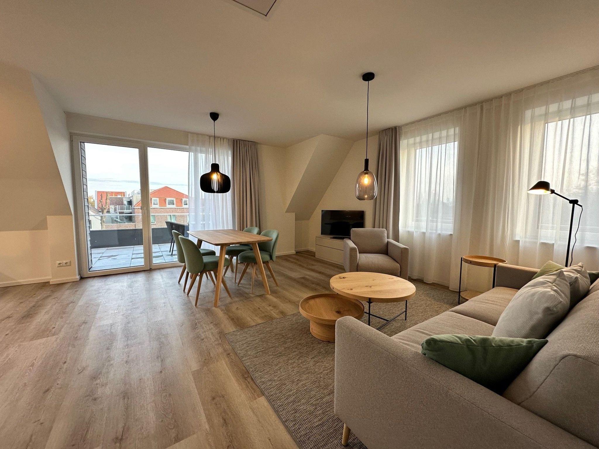 Auf ca. 105 m² erwartet Sie diese exklusive und großzügige Dachgeschosswohnung mit offenem Wohn- und Essbereich und voll ausgestatteter Küche. Die große Dachterrasse, zugänglich vom Wohnbereich und einem der beiden Schlafzimmer, bietet einen traumhaften Blick auf die Harle und den Museumshafen. Hier können Sie ungestört entspannen oder mit der gesamten Familie frühstücken.
