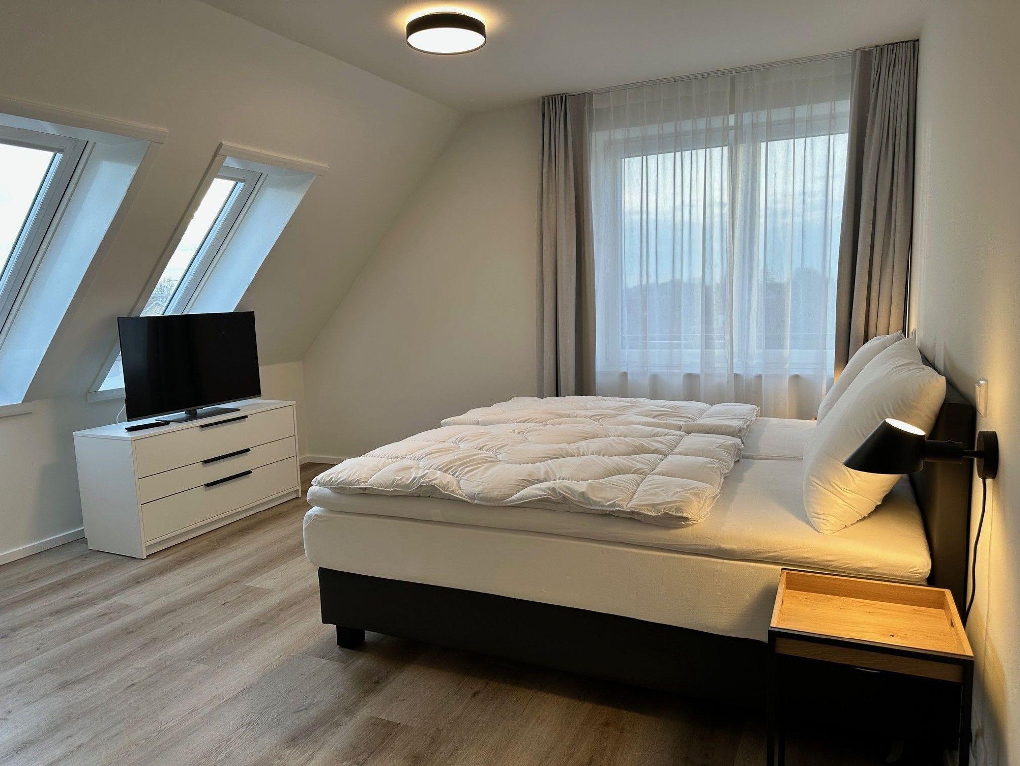 Die Ferienwohnung verfügt zudem über zwei Schlafzimmer mit Boxspringbetten (180x200 cm) sowie über zwei moderne Badezimmer mit Dusche. Eines der Badezimmer ist direkt an eines der Schlafzimmer angeschlossen.