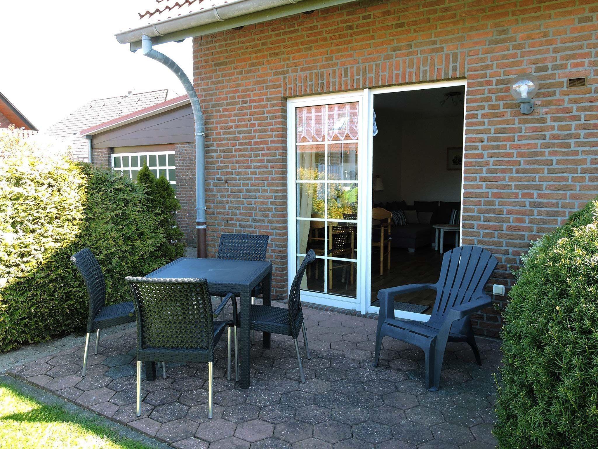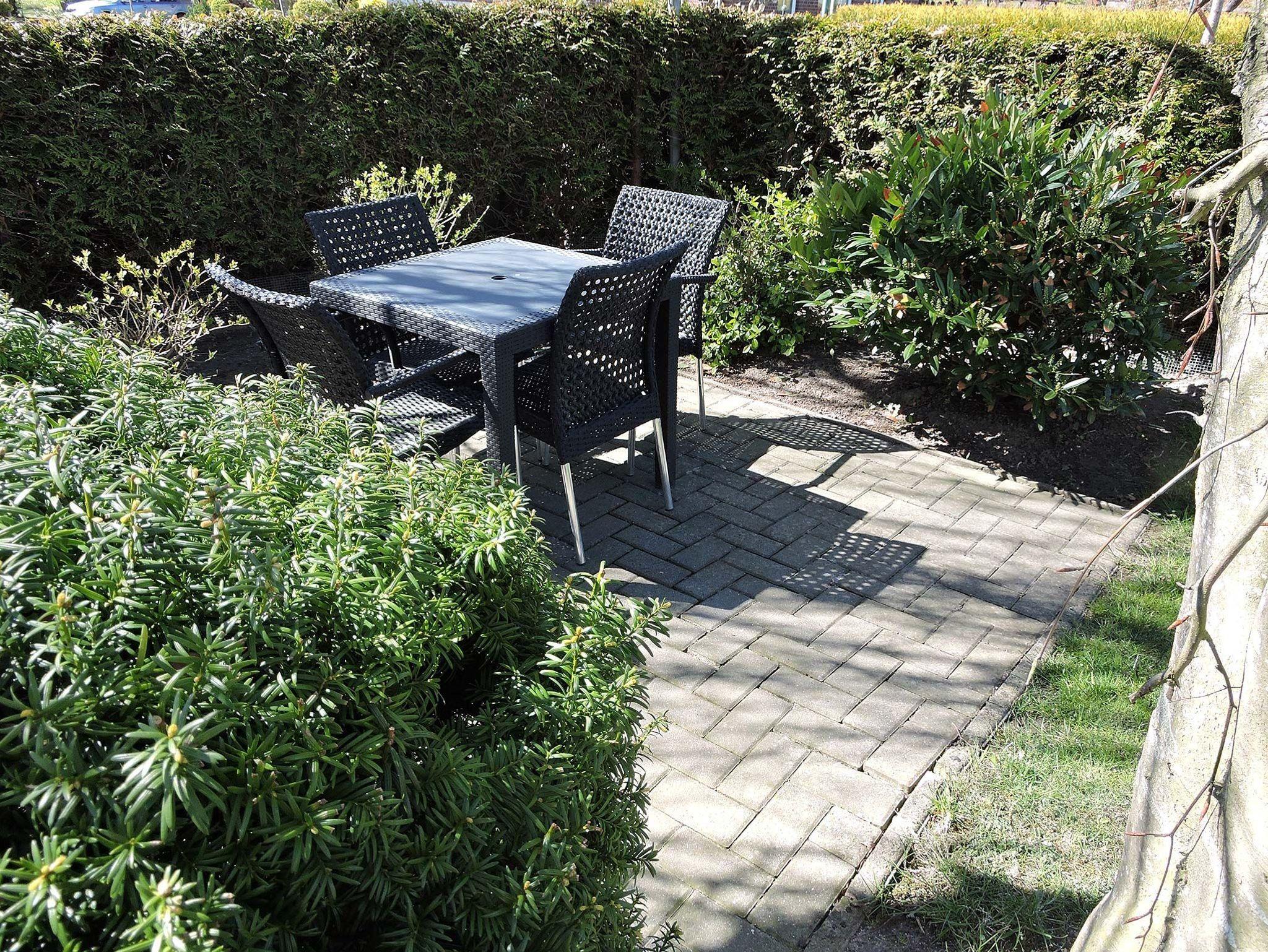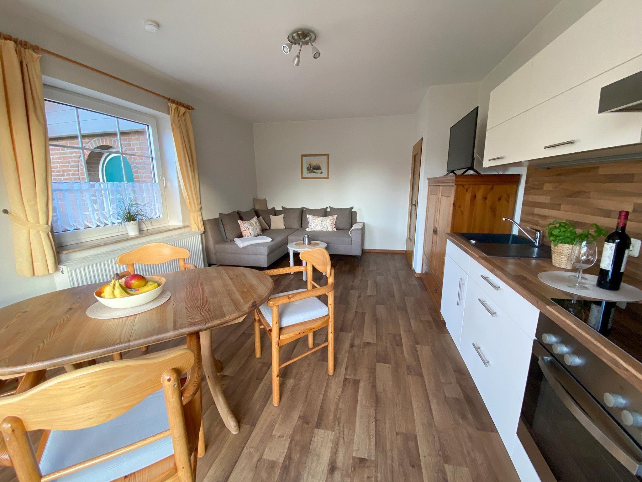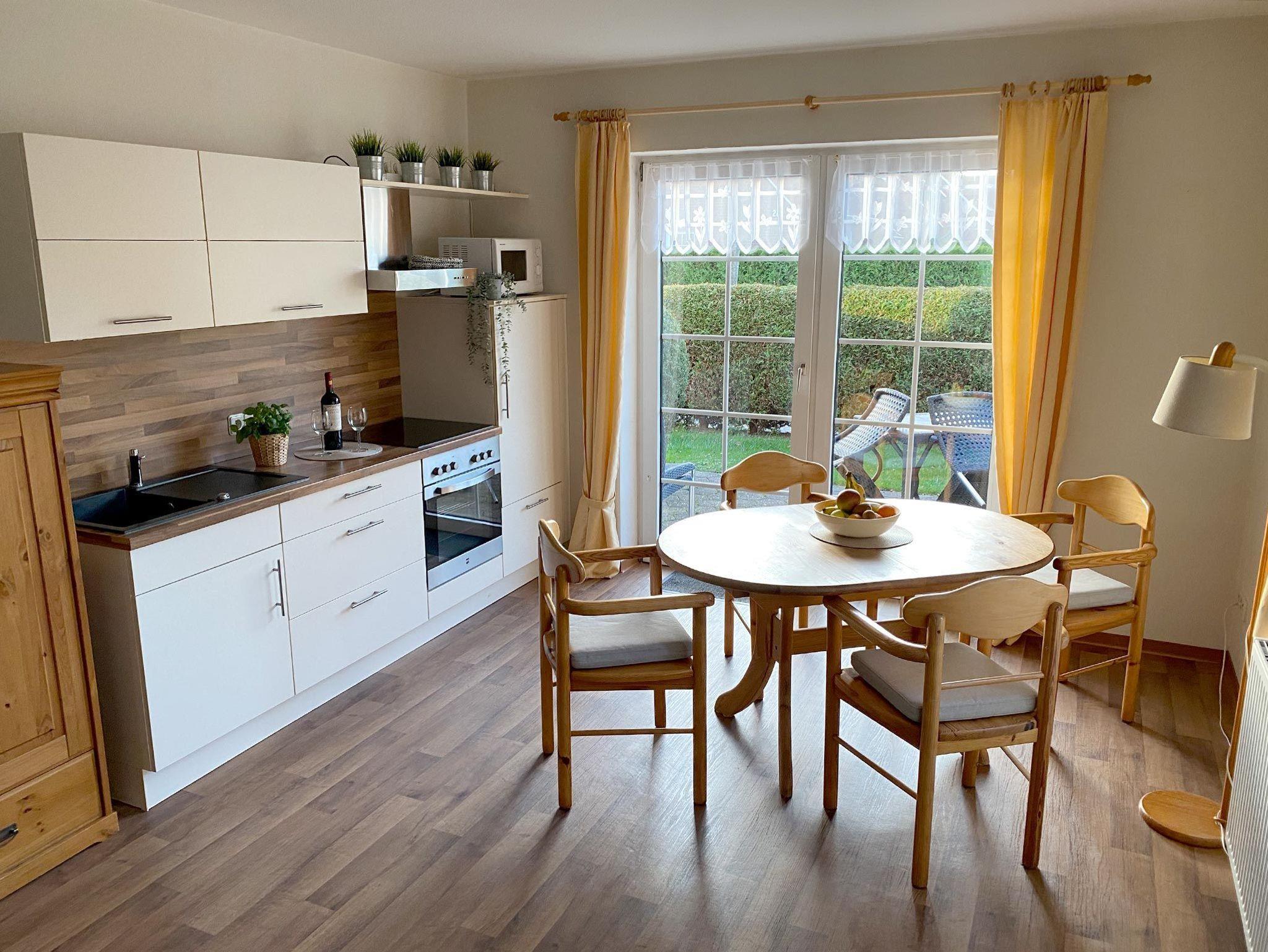 Ferienwohnung für 2 Personen mit Wohn-/Esszimmer und einem Schlafzimmer mit Doppelbett. Die offene Küche ist komplett ausgestattet. Bad mit barrierefreier Dusche und WC. Terrasse mit Gartenmöbeln und Grillmöglichkeit.
