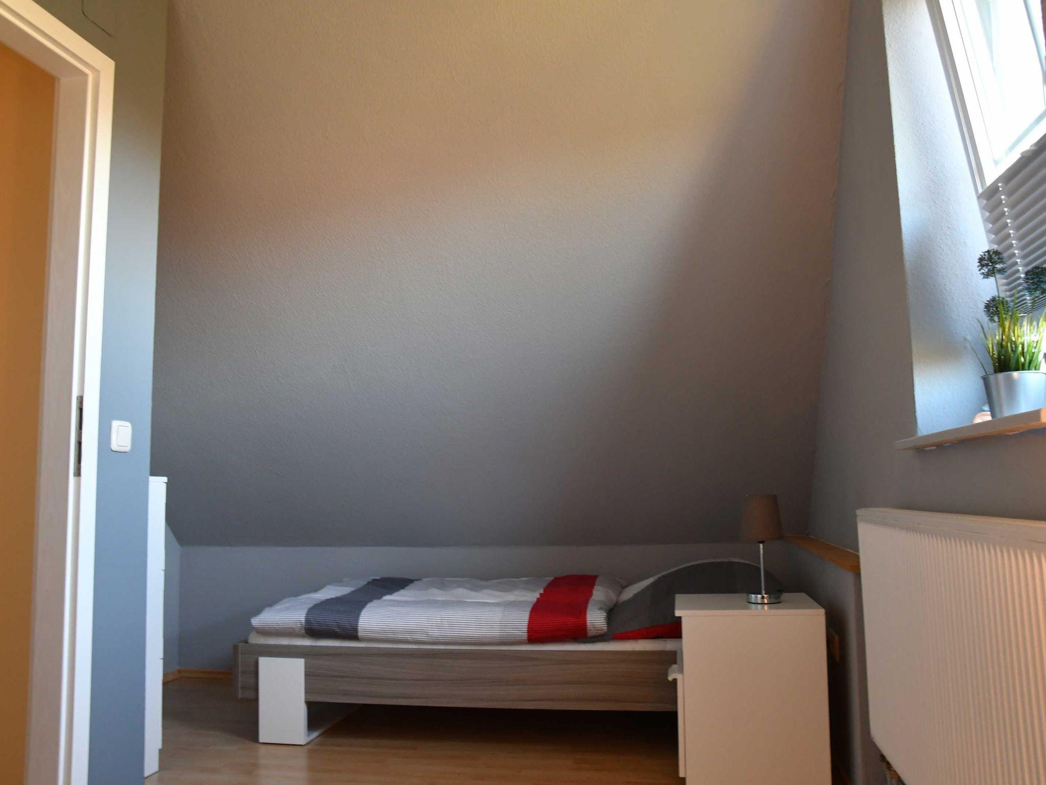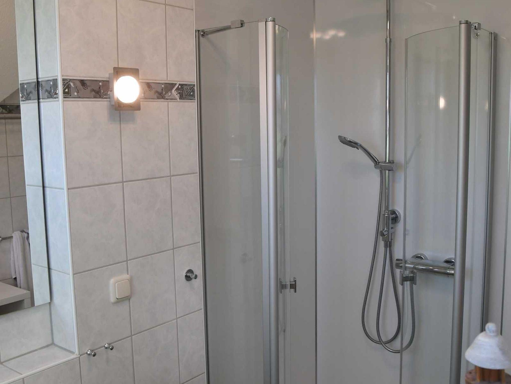 Im 1. OG sind das Dusch-Bad, zwei Schlafzimmern mit zwei Einzelbetten (0,90*2,00 m, bzw. 1,00*2,00m) sowie ein Schlafzimmer mit einem Doppelbett (1,90*2,00 m) zu finden.