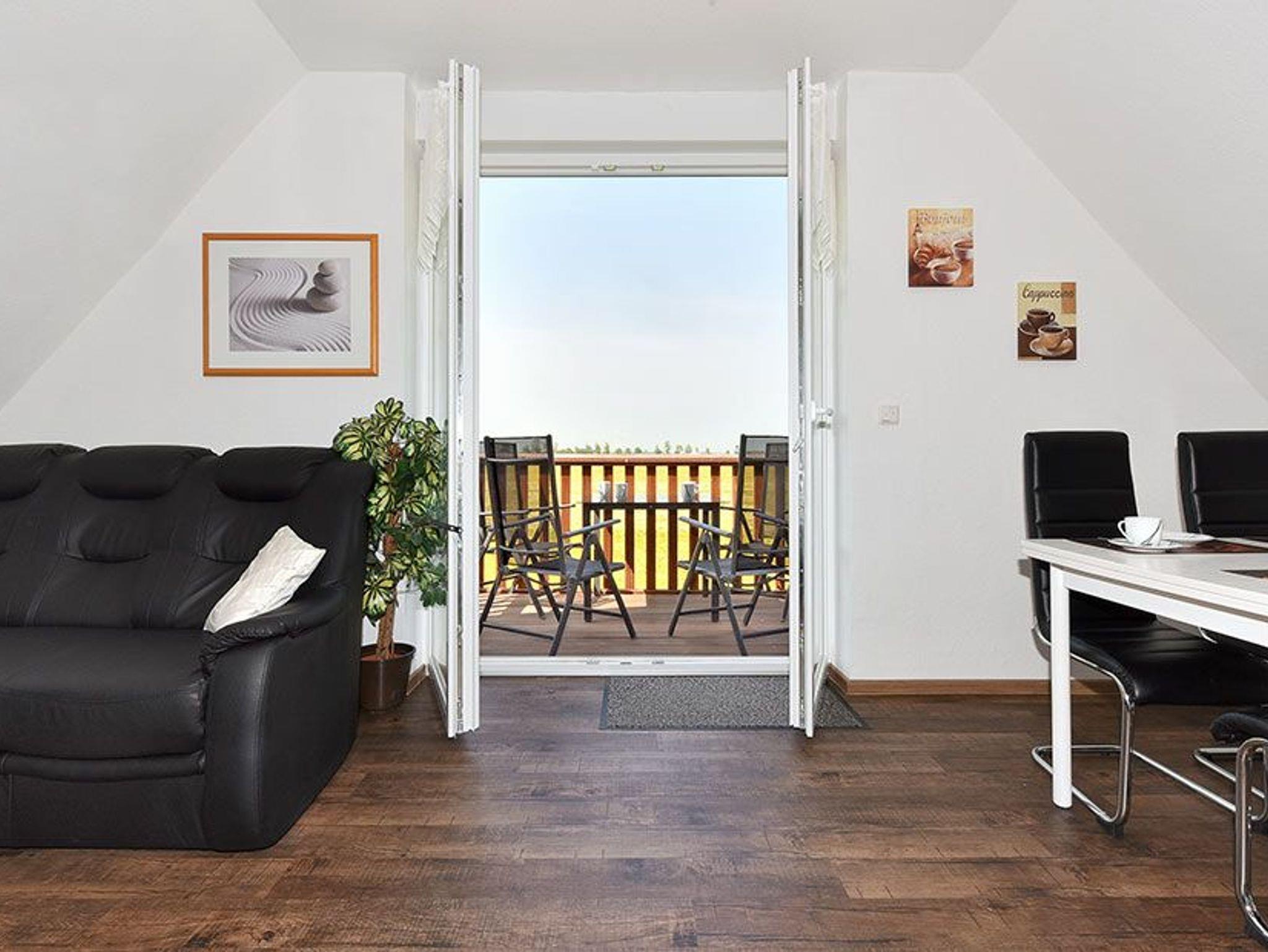 Größe ca. 58 Quadratmeter, Wohnraum mit integrierter Küche, Schlafzimmer, zweites separates Schlafzimmer, Badezimmer mit Dusche, Waschtisch und WC, Obergeschoss, Balkon, überdachte Terrasse (am Garten, kein direkter Wohnungszugang), optimal für 2 bis 4 Personen und zusätzlich ein Kleinkind.