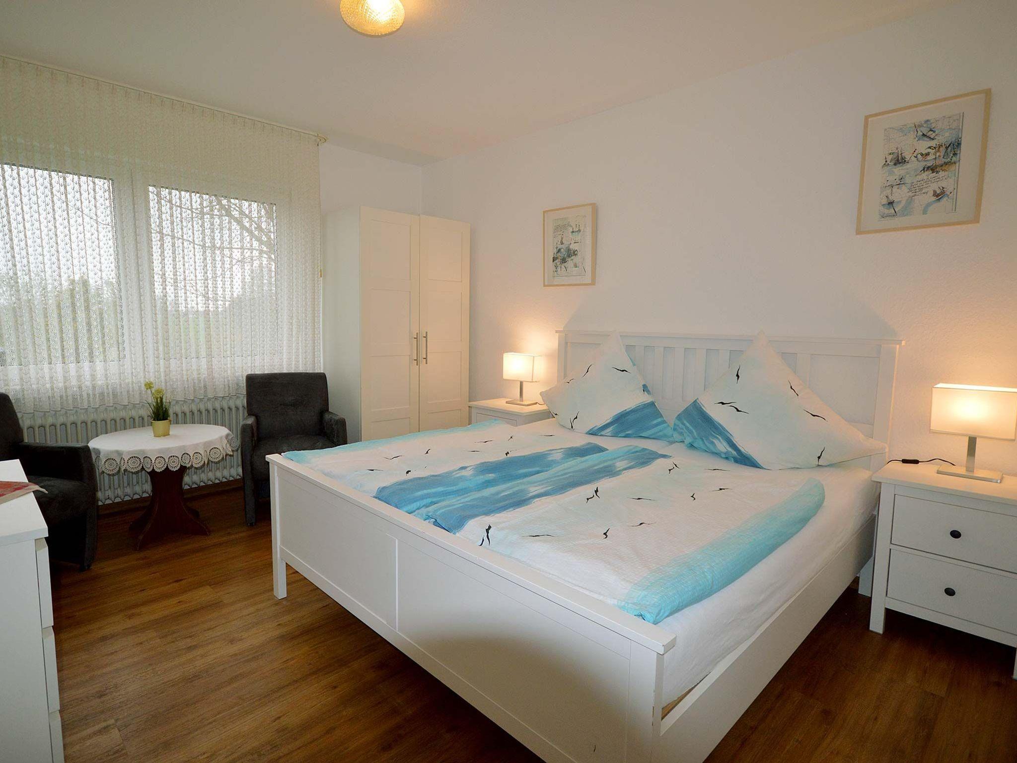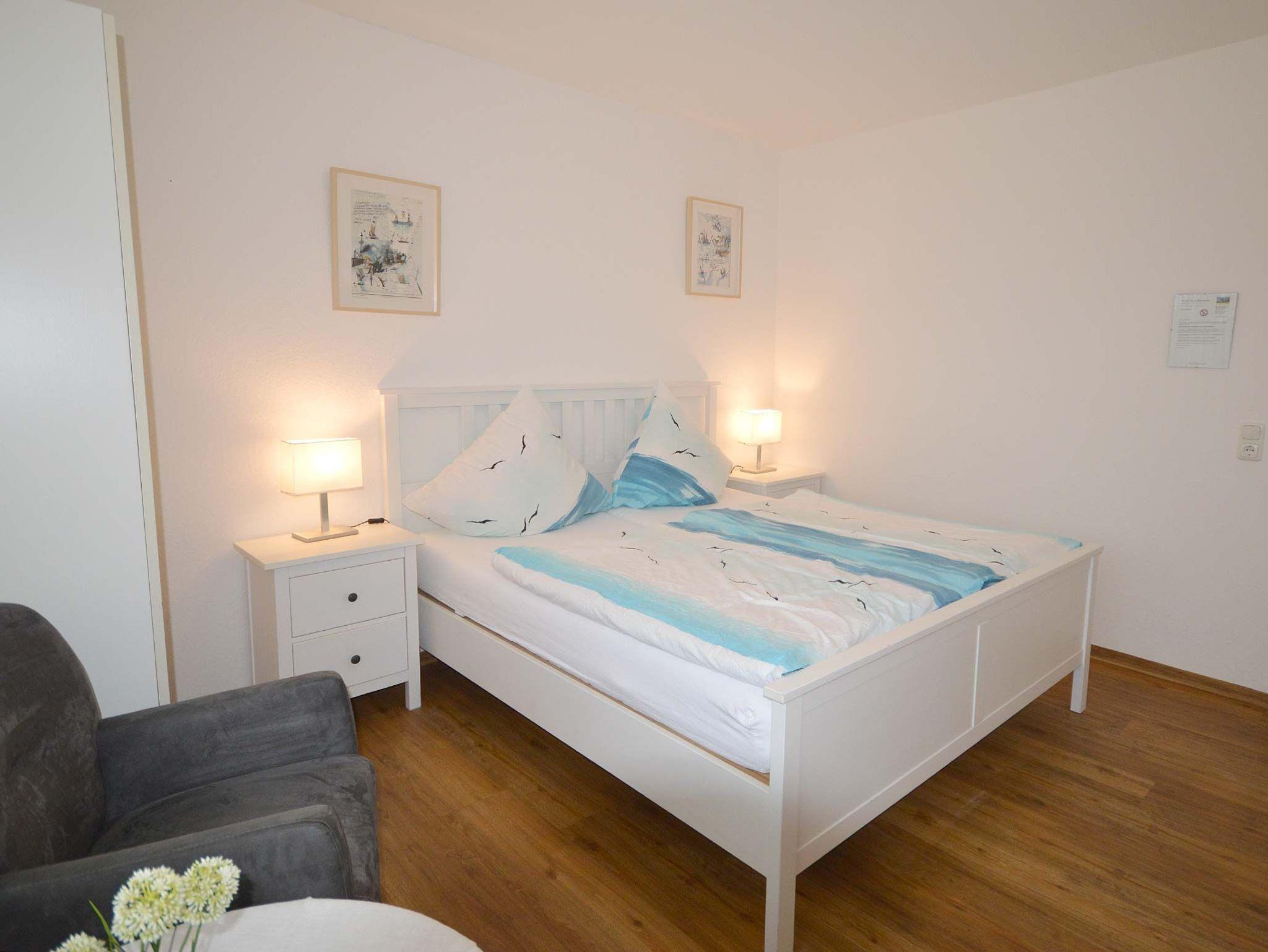 Der Wohnbereich mit Sitzgarnitur, WLAN, SAT-TV Flachbildschirm und Radio, Ein Schlafzimmer miteinem bequmen Doppelbett.