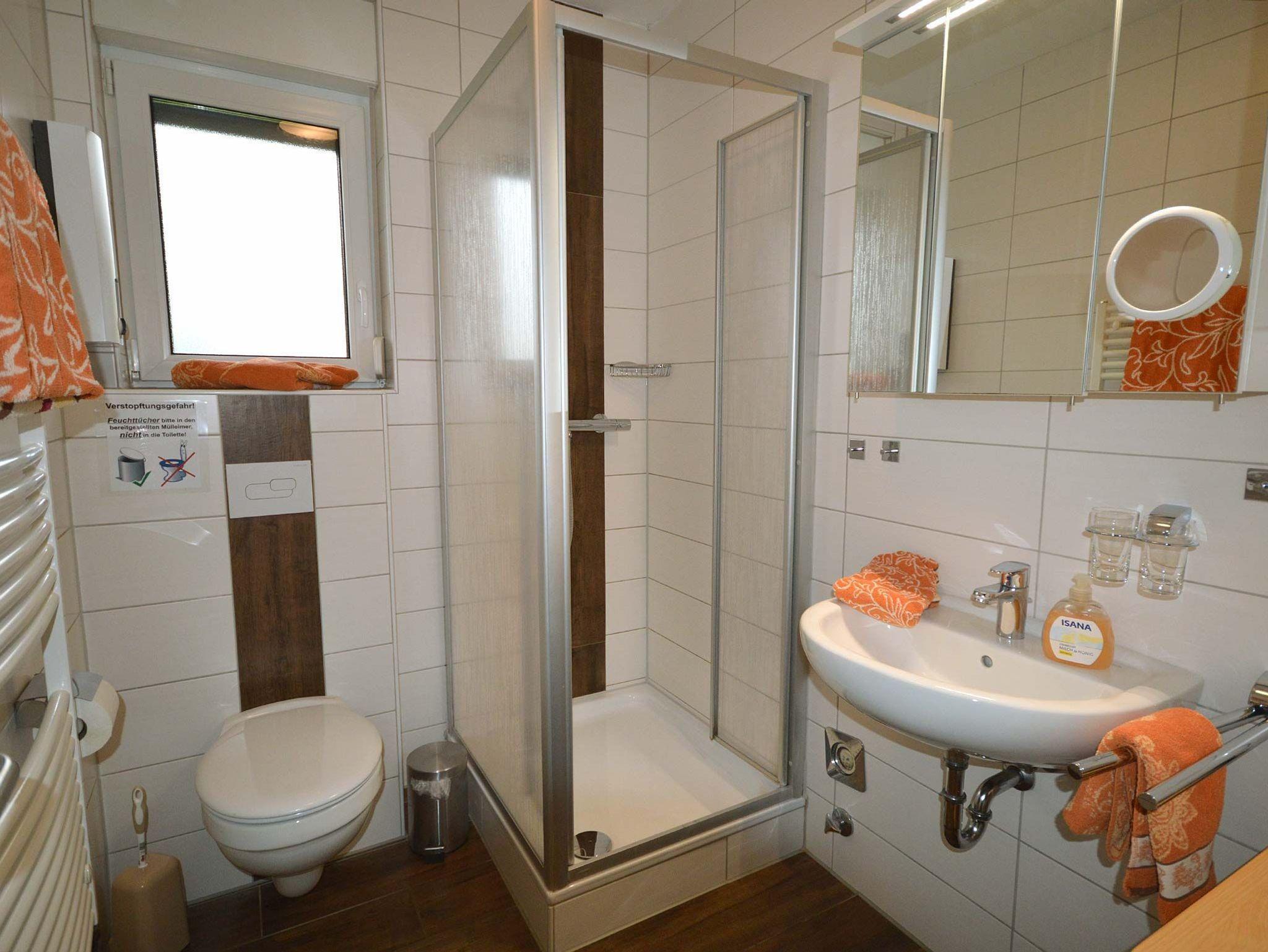 Ein modernes Tageslicht-Bad mit Dusche/WC, Haartrockner und Kosmetikspiegel.