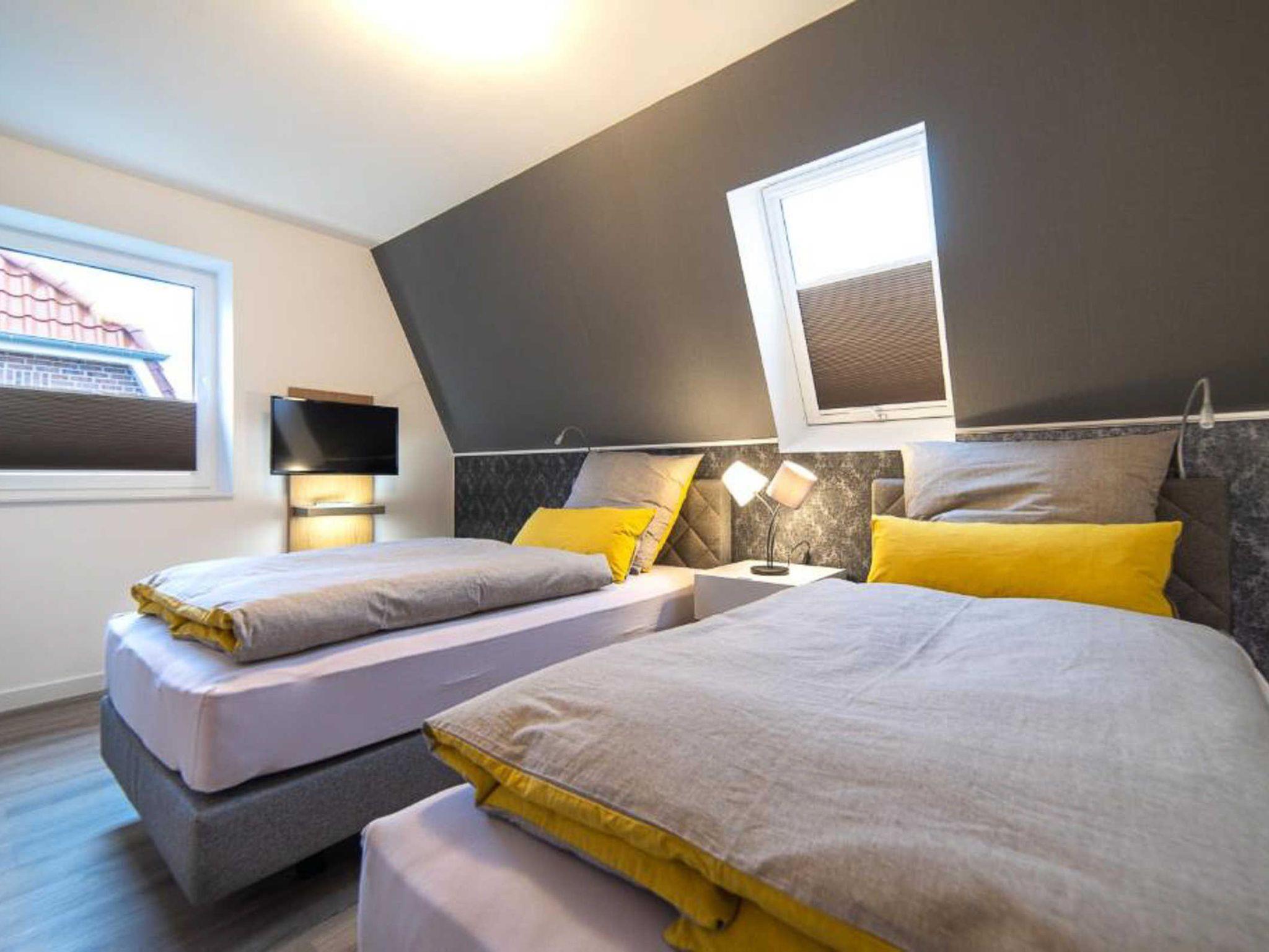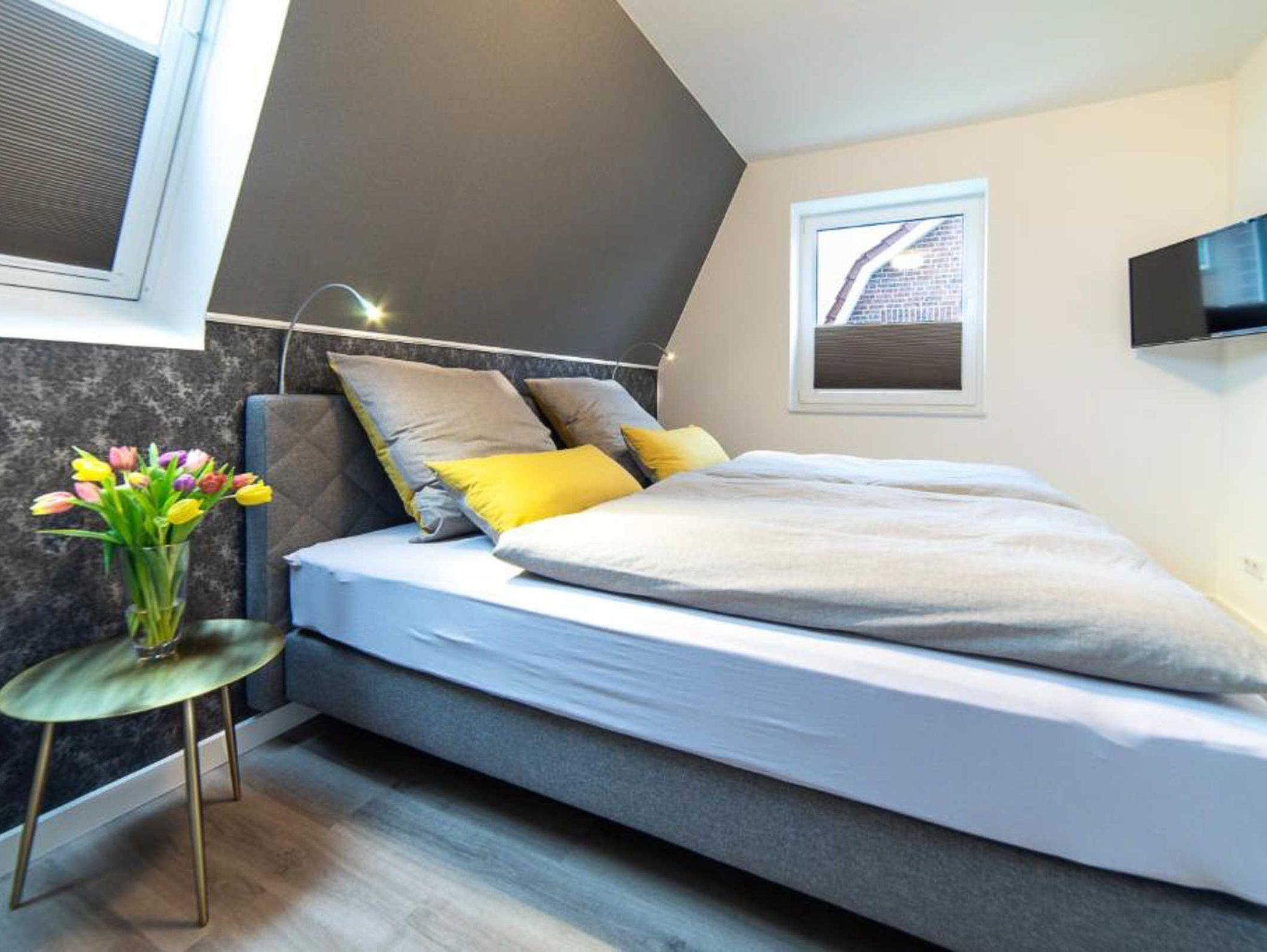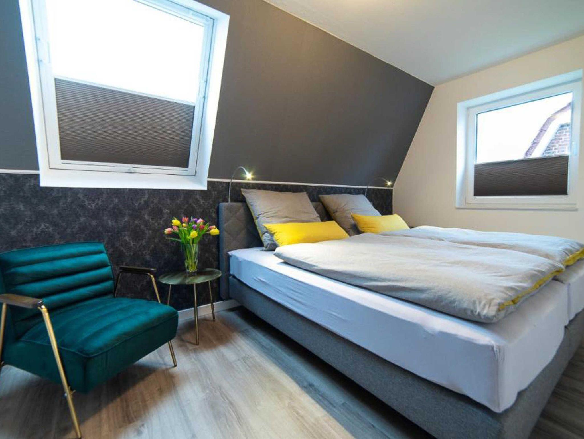 Die beiden Schlafzimmer sind mit bequemen Boxspringbetten (Bett mit 200 x 200 cm und zwei Betten je 200 x 100 cm) und großen Kleiderschränken ausgestattet. Die beiden Einzelbetten können auch zusammengestellt werden.