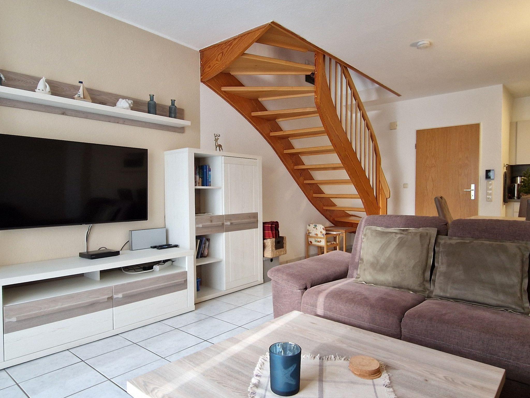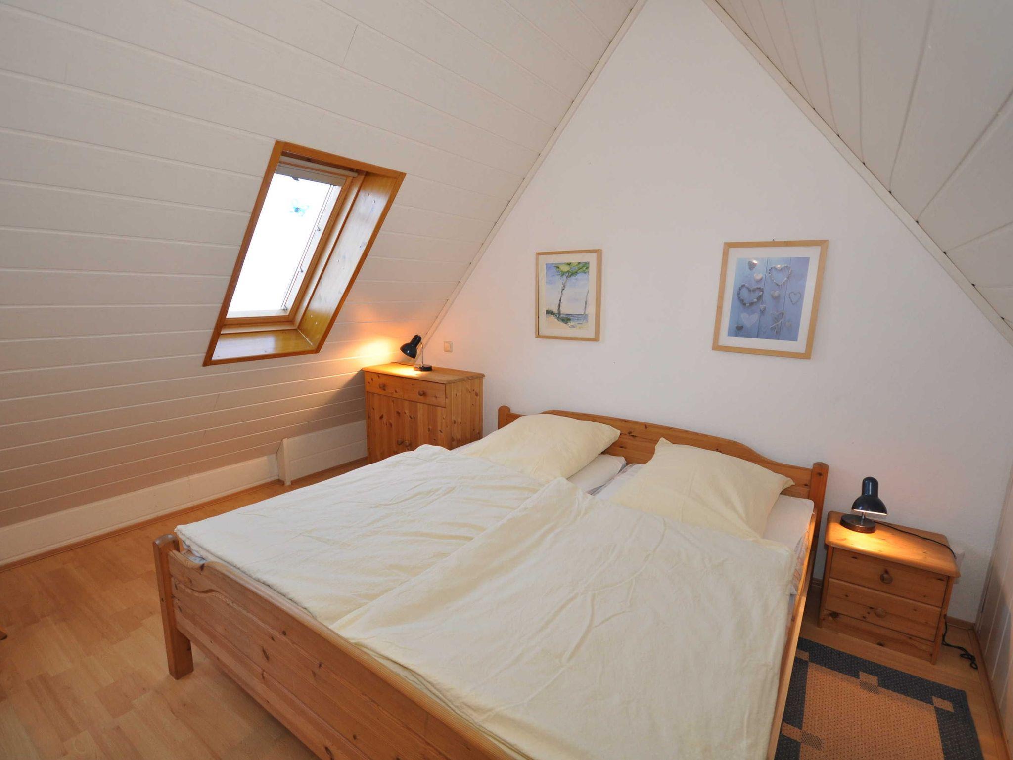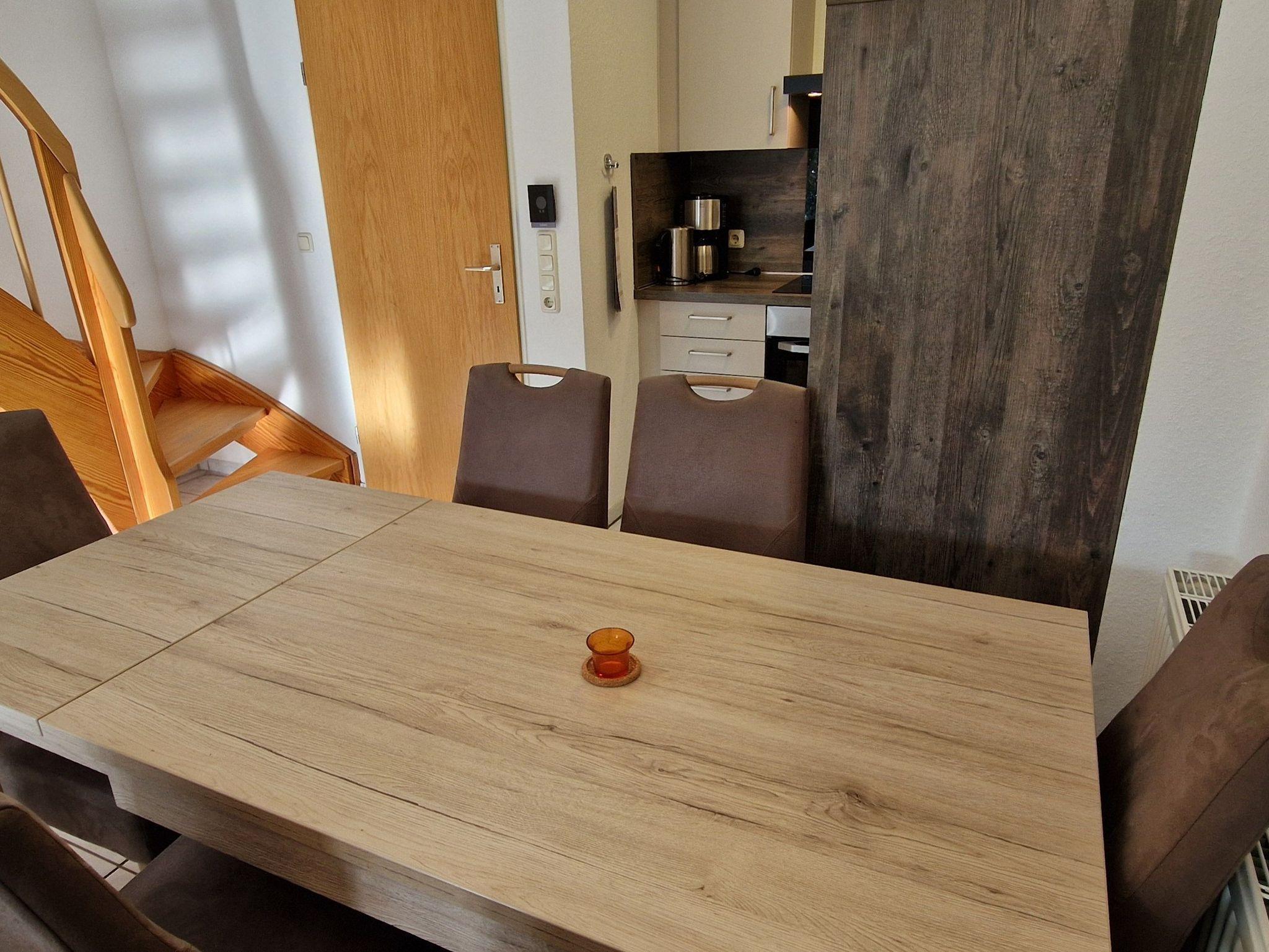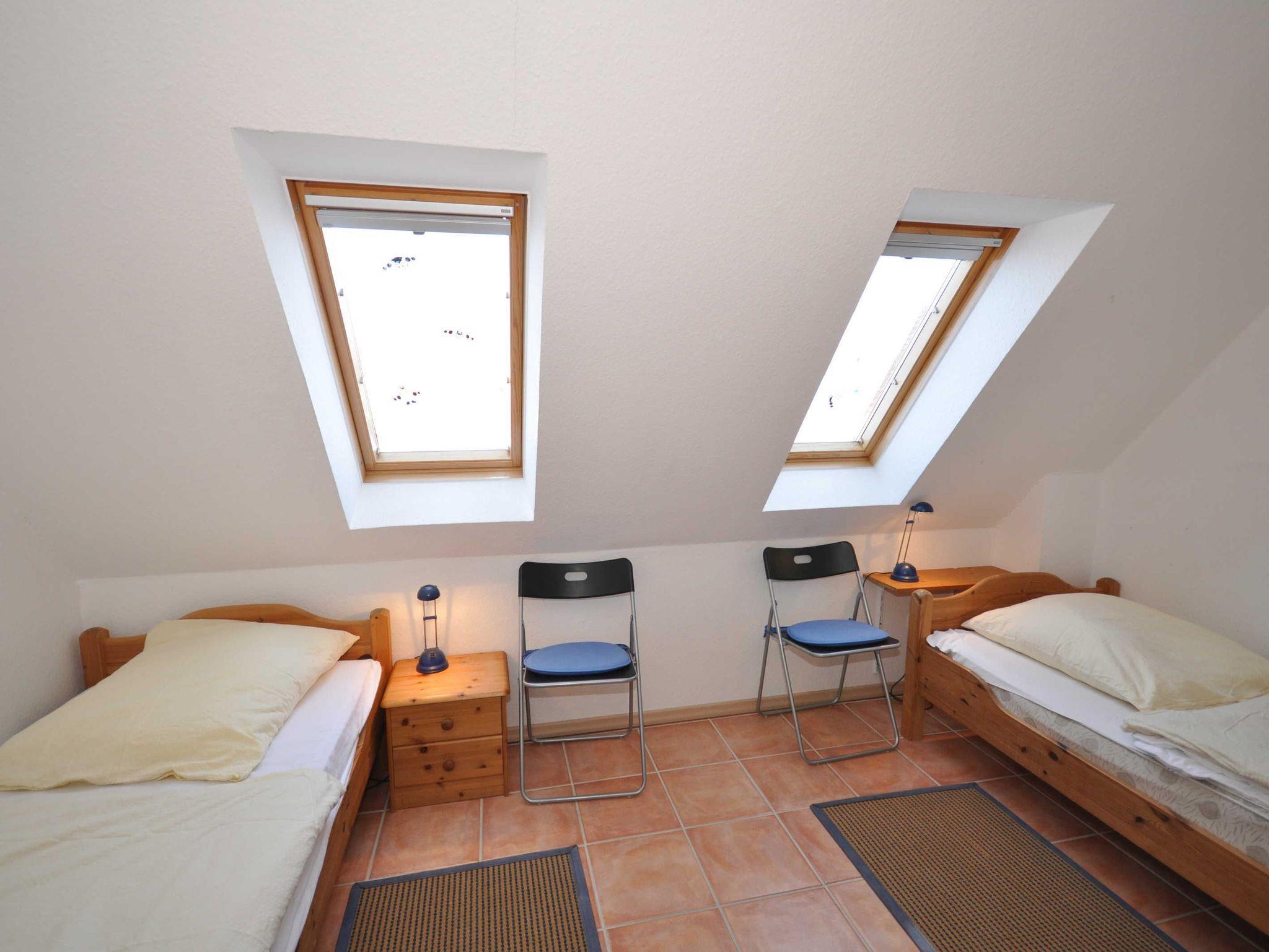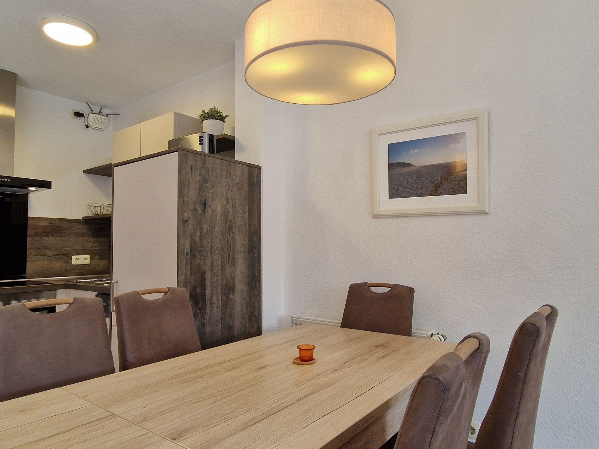 Im neuwertig ausgestatteten Erdgeschoss befindet sich ein großzügiger Wohnraum mit Essbereich und einer offenen Küche, sowie Zugang zur Terrasse und zum Gartenteil. Ein Gäste-WC steht ebenfalls zur Verfügung. Im Obergeschoss befinden sich ein Schlafzimmer mit einem Doppelbett und einem Kindergitterbett, ein Schlafzimmer mit zwei Einzelbetten und ein Duschbad mit WC. Eine offene Holztreppe führt weiter ins ausgebaute, offene Dachstudio mit einem Doppelbett. Das 4-Zimmer-Reihenhaus bietet somit Platz für bis zu 6 Personen und ein Baby/Kleinkind. Des Weiteren sind Verdunkelungsrollos in den Schlafzimmern vorhanden.