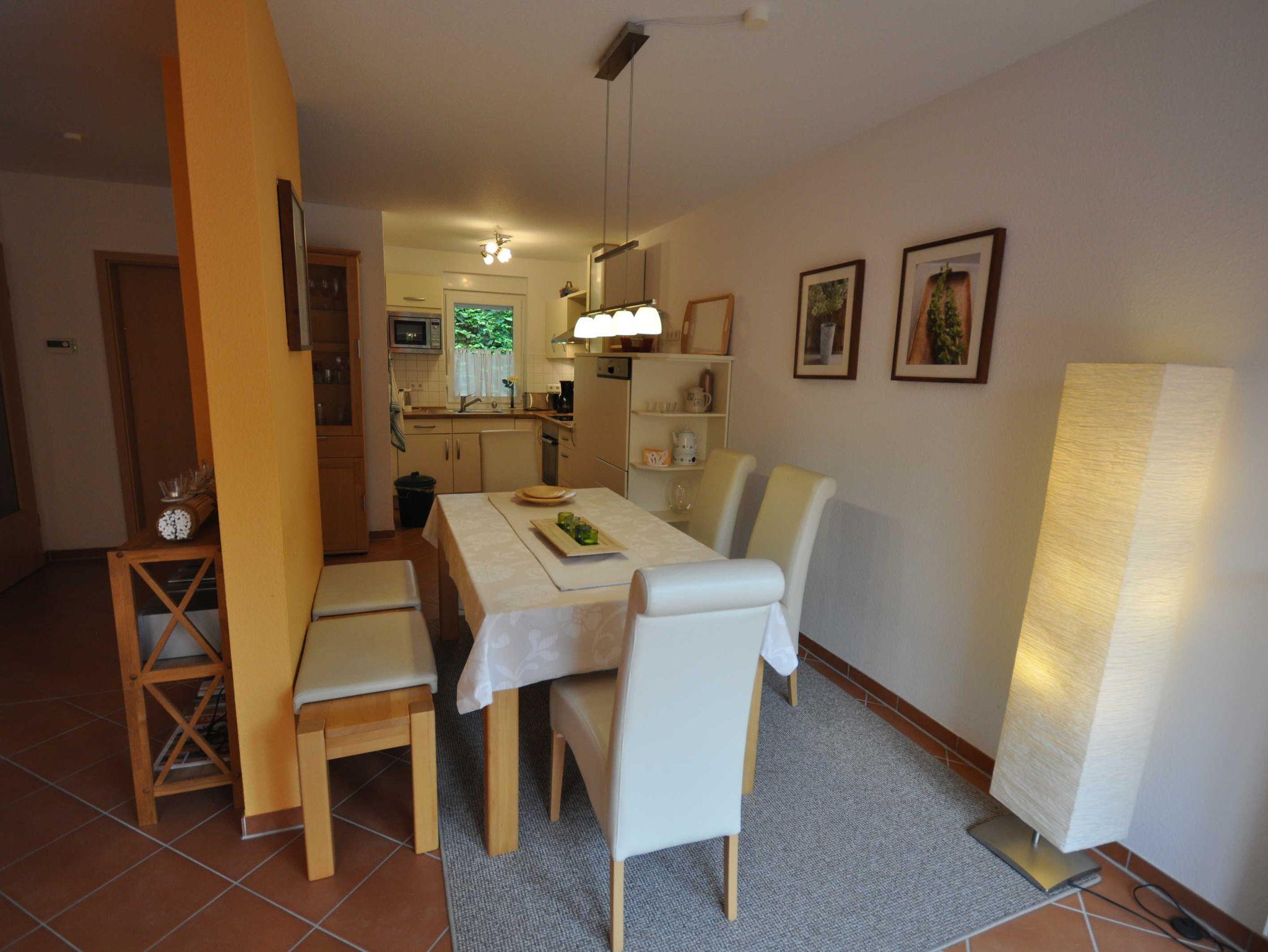 Das Reihenhaus verfügt im Erdgeschoss über einen großzügigen und hochwertig eingerichteten Wohn- und Essbereich mit offener Küche sowie über ein Gäste-WC. Eine offene Holztreppe führt vom Flur zum Obergeschoss. Hier befinden sich zwei Schlafzimmer (ein Schlafzimmer mit einem Doppelbett sowie ein Schlafzimmer mit zwei Einzelbetten) und ein Duschbad mit WC, Bodenerwärmung und Handtuchtrockner. Alle Fenster sind mit Rollläden, einige mit Insektenschutz ausgestattet. Eine hochwertige Ausführung und attraktive Ausstrahlung sorgen für Wohnqualität.