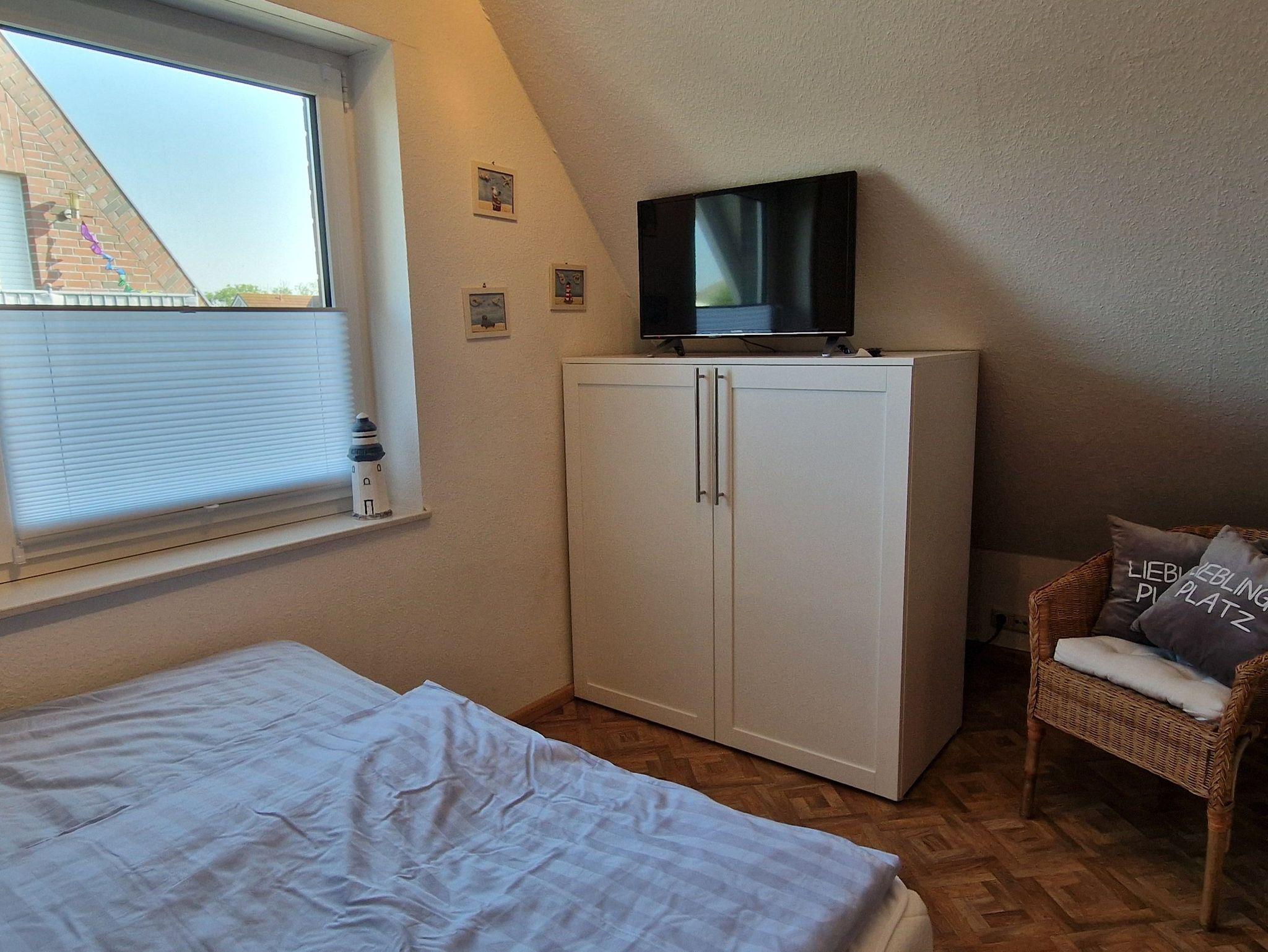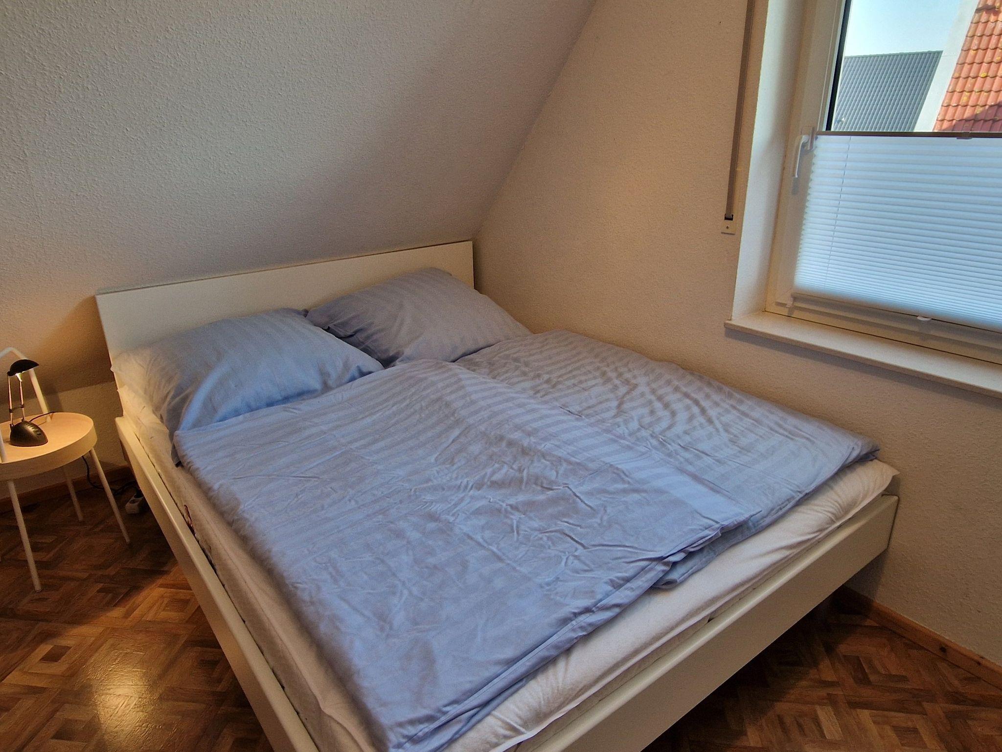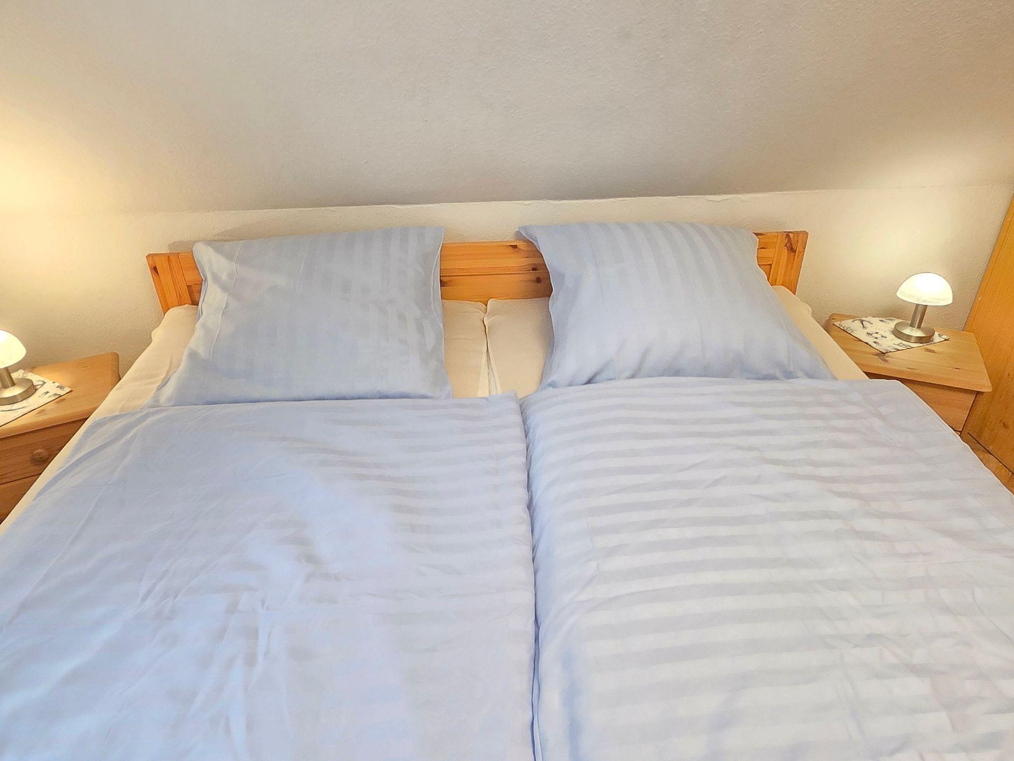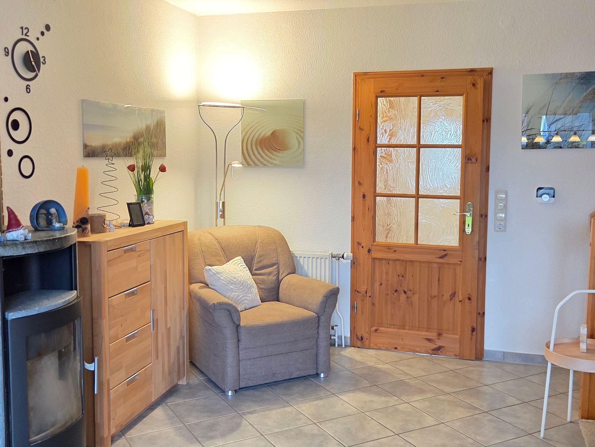 Das 4-Zimmer-Reihenendhaus bietet im Erdgeschoss ein gemütliches Wohnzimmer mit Kaminofen und Essbereich, eine separate Küche mit kleinem Esstisch, sowie ein Gäste-WC. Über eine offene Holztreppe gelangen Sie ins Obergeschoss. Hier befinden sich zwei Schlafzimmer und ein geräumiges Badezimmer mit Dusche und WC. Im ausgebauten Dachgeschoss ist ein weiteres Schlafzimmer vorhanden. Alle Fenster sind mit Rollläden, die Böden mit Fliesen bzw. PVC ausgestattet. Des Weiteren verfügt das Ferienhaus über 2 Fahrräder sowie einen Bollerwagen, auch WLAN kann kostenfrei genutzt werden.
