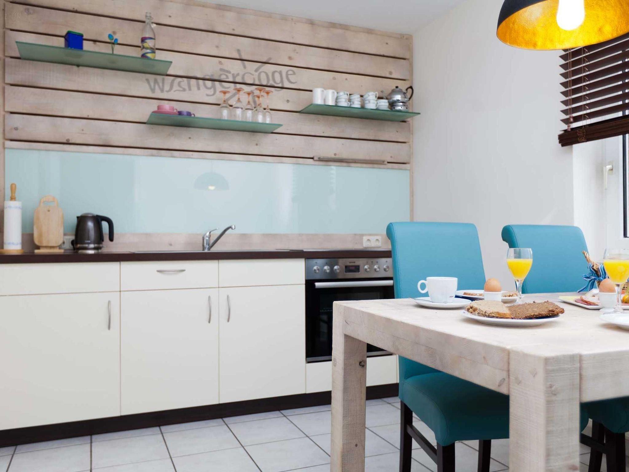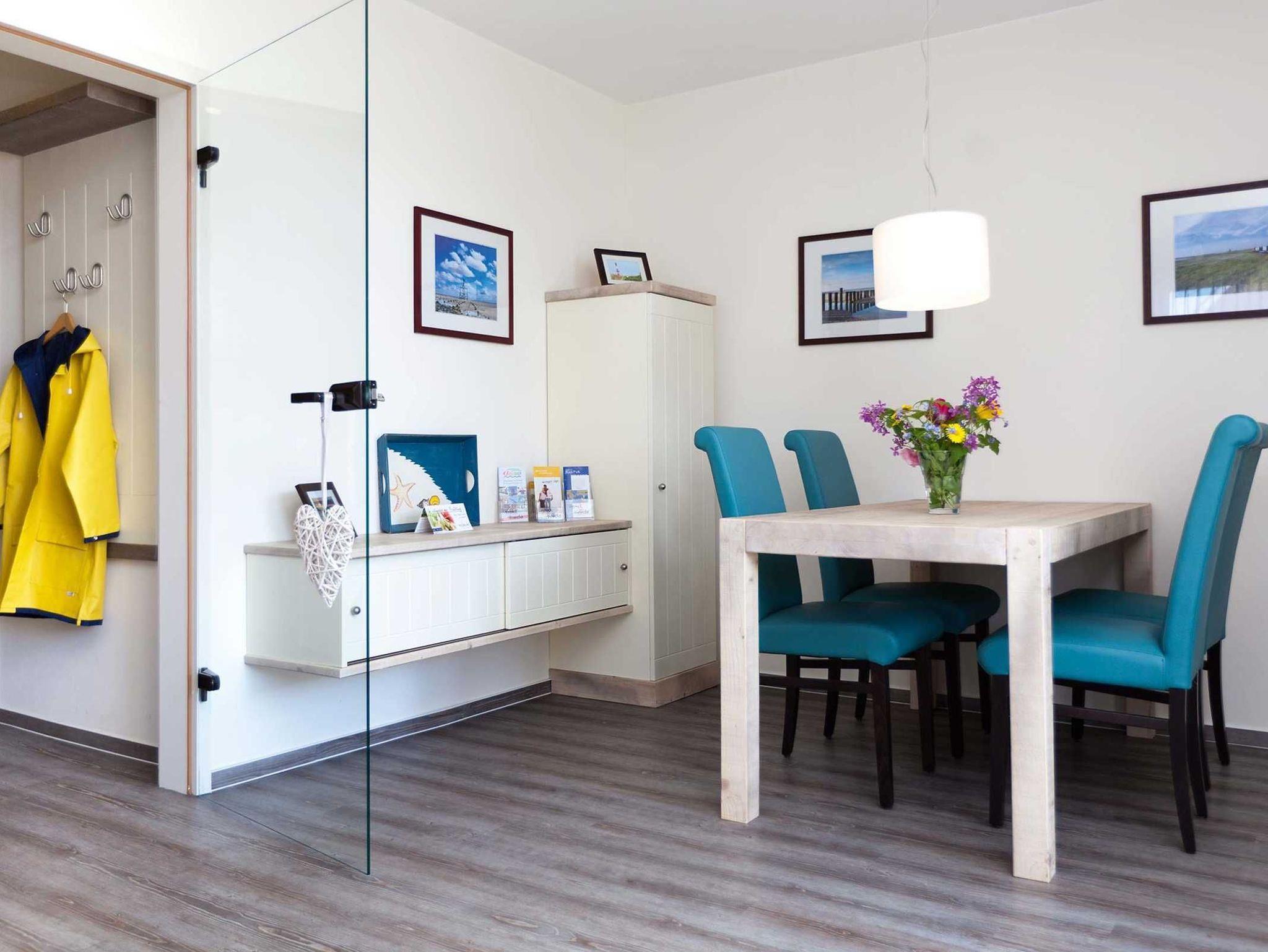 Ferienwohnung Wangerooge für 2 Personen im Erdgeschoss, Schlafraum mit Doppelbett, ein Bad mit Dusche/WC/Föhn, eine komplett eingerichtete Küche, ein geräumiges Wohnzimmer mit Essecke, HD-TV und angrenzender Süd-Terrasse, Abstellraum, inklusive Endreinigung.