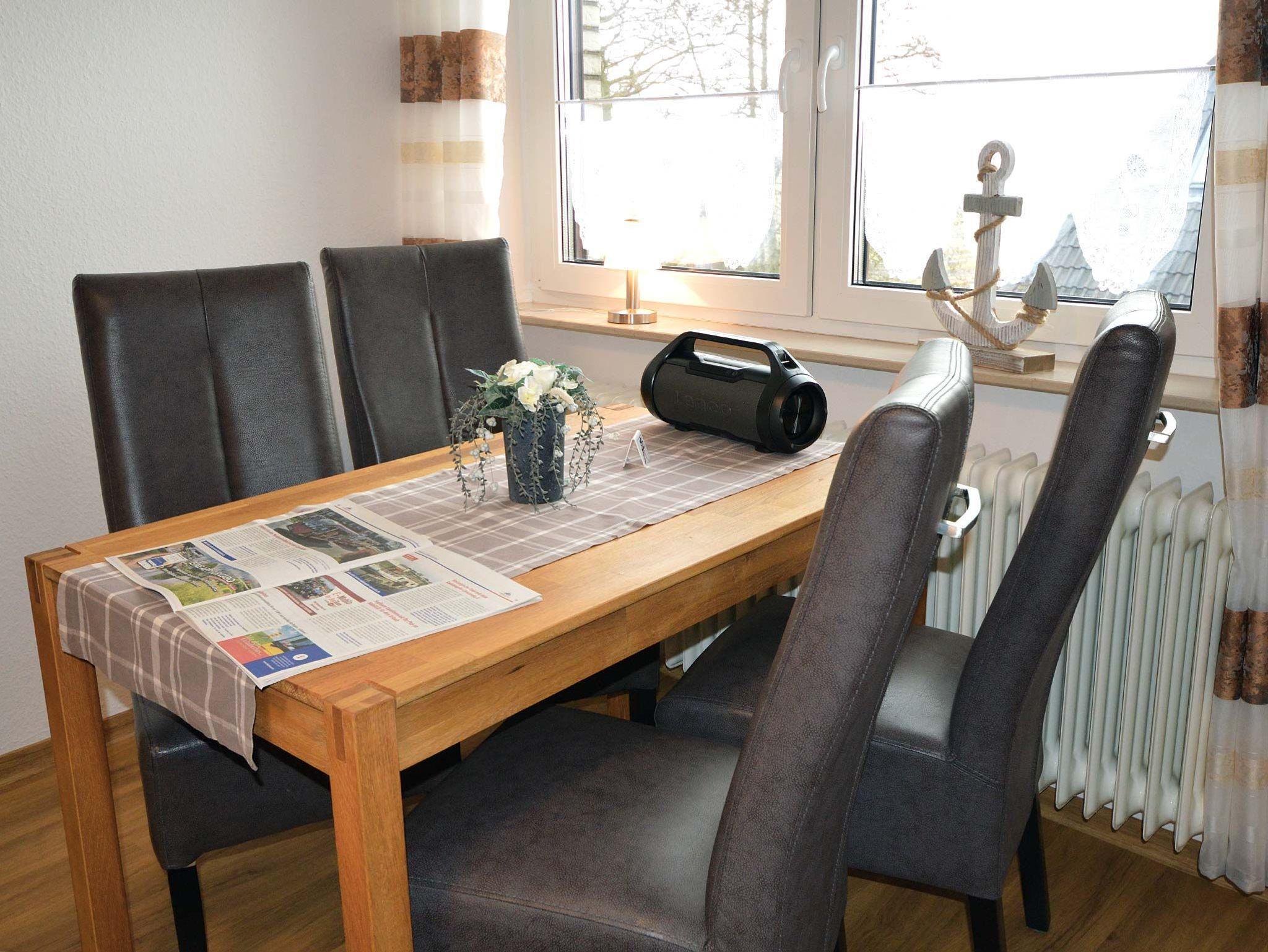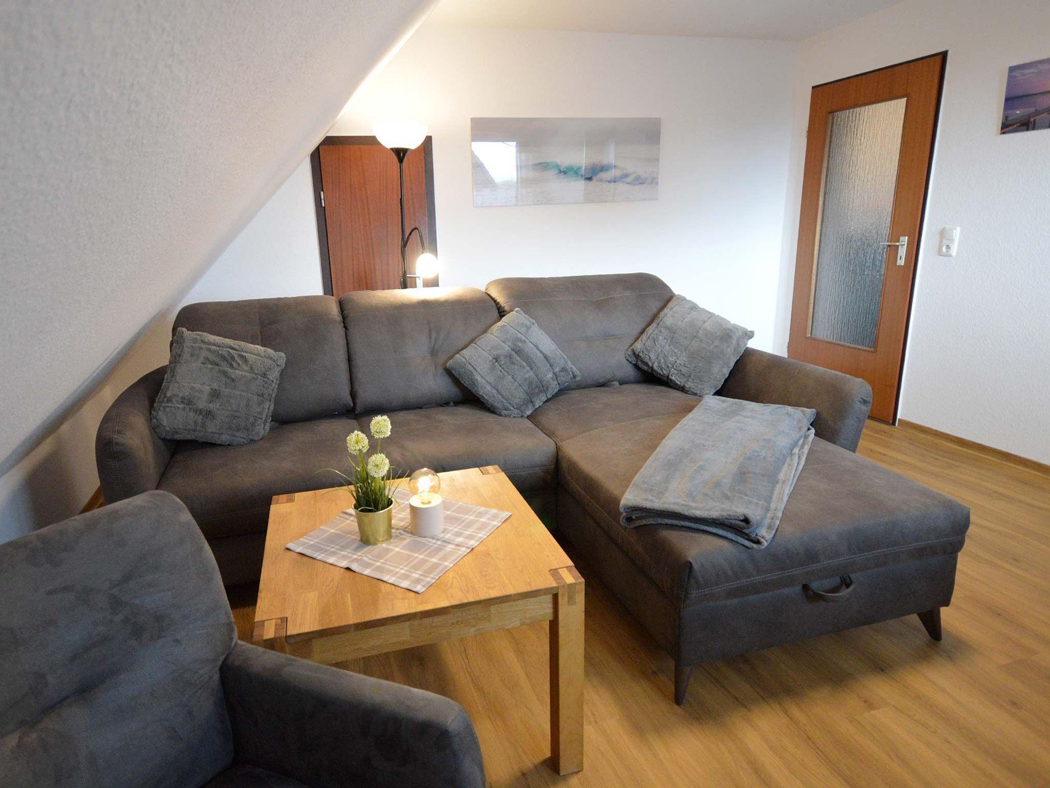 Die helle und gemütlich eingerichtete Ferienwohnung für bis 3 Personen in der 1. Etage mit separatem Eingang. Ein Wohnzimmer mit Couchgarnitur, Essecke, SAT-TV Flachbildschirm und Radio.