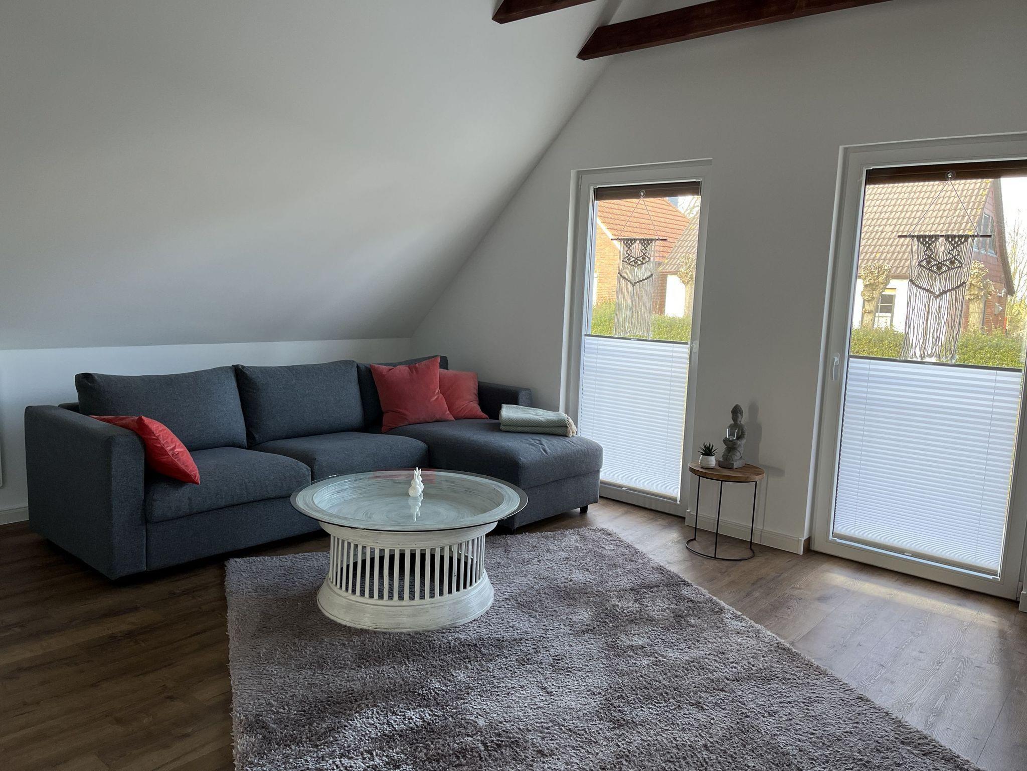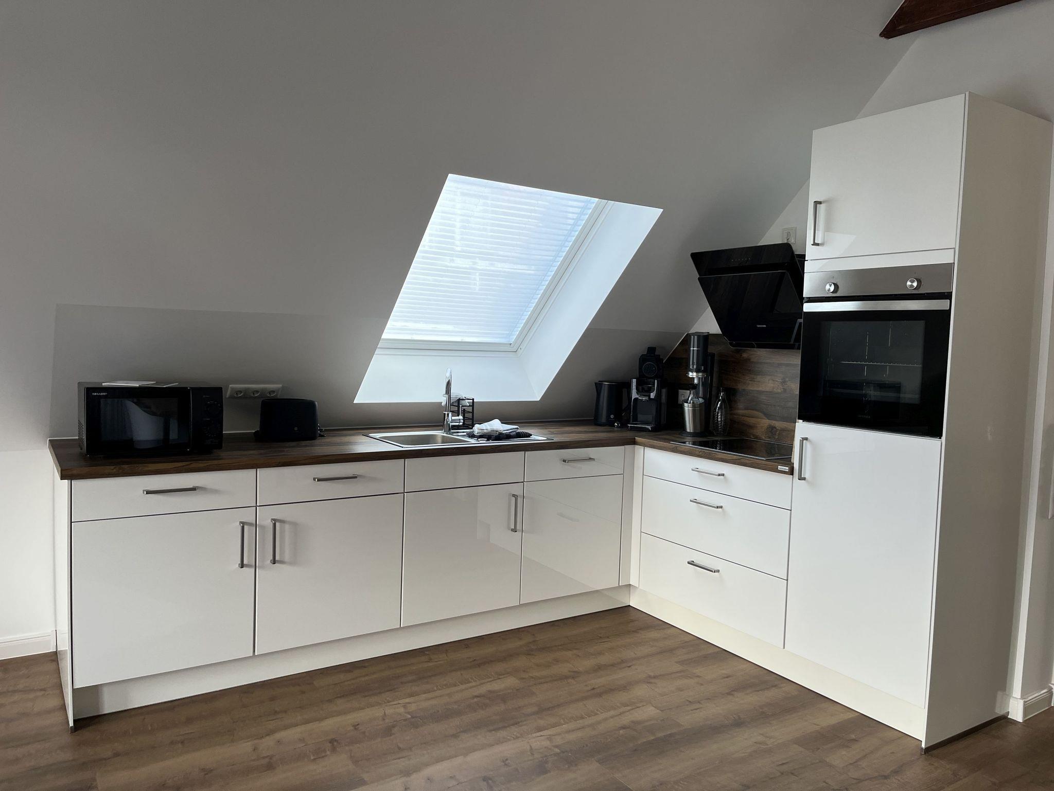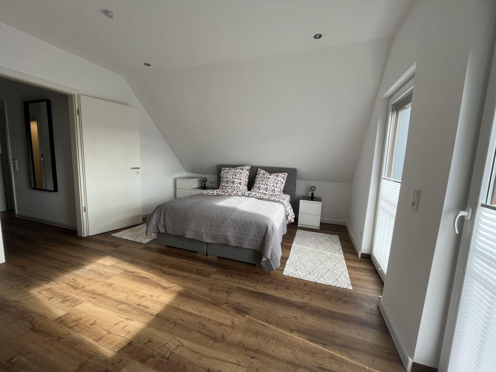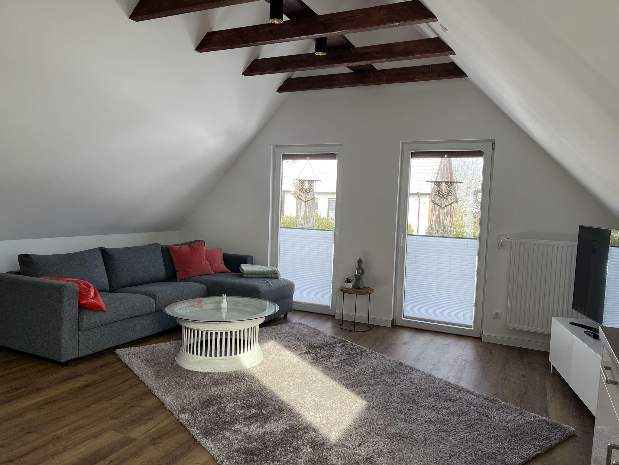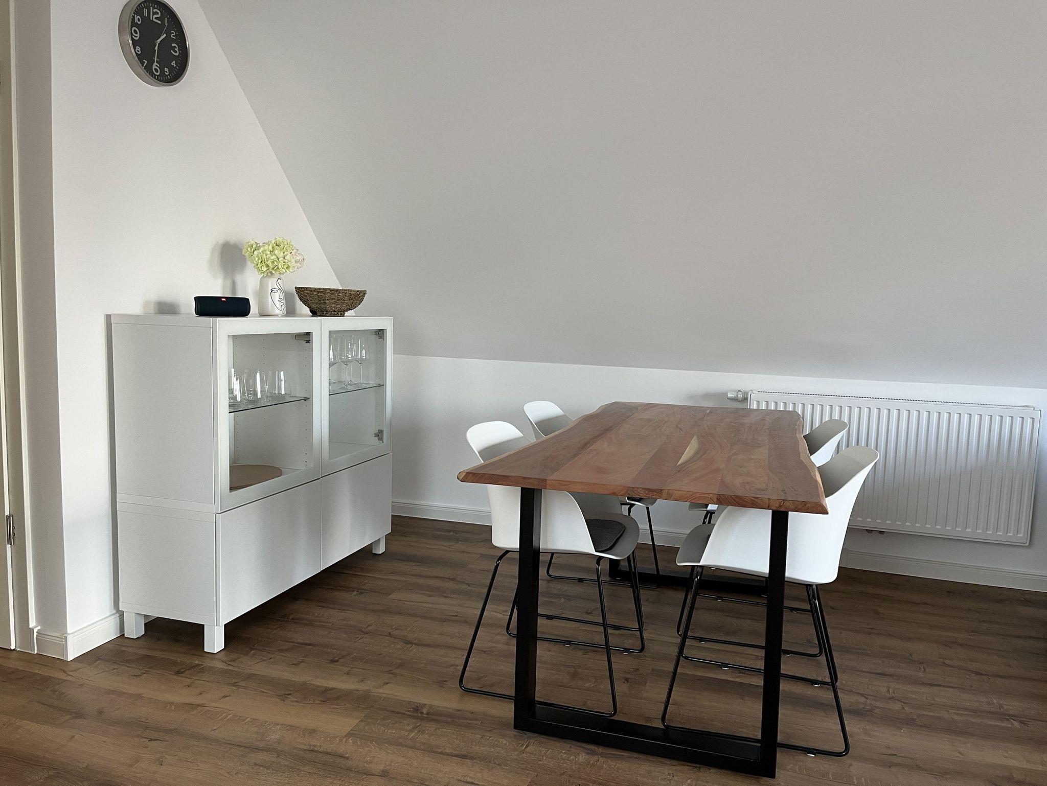 Neue, moderne ca. 60 m² große Nichtraucher-Wohnung im Dachgeschoss eines 2- Familienhauses. 1 Pkw Stellplatz direkt am Haus. Weitere Parkplätze an der Straße nur gegen Gebühr (Parkscheinautomat) oder mit Parkscheibe (max. 4 h). In der Wohnung findet sich eine moderne und dennoch gemütliche Einrichtung. Offene, voll ausgestattete Küche inkl. Ceran-Kochfeld, Backofen, Mikrowelle und Spülmaschine. Ausreichend Besteck, Gläser und Geschirr für 12 Pers. Integrierter Essplatz mit 4 Sitzgelegenheiten (auf Wunsch 1 x Kinderhochstuhl vorhanden). Gemütliches Ecksofa (Schlafsofa ausklappbar für 3. Pers., Liegefläche 1,40 x 2,00 m) im Wohnraum. JBL-Bluetooth Lautsprecher zum Abspielen eigener Musik, Smart TV, Glasfaseranschluss, WLAN kostenlos. 2. Smart TV im Schlafzimmer. Diverse Bücher, Spielesammlung vorhanden.