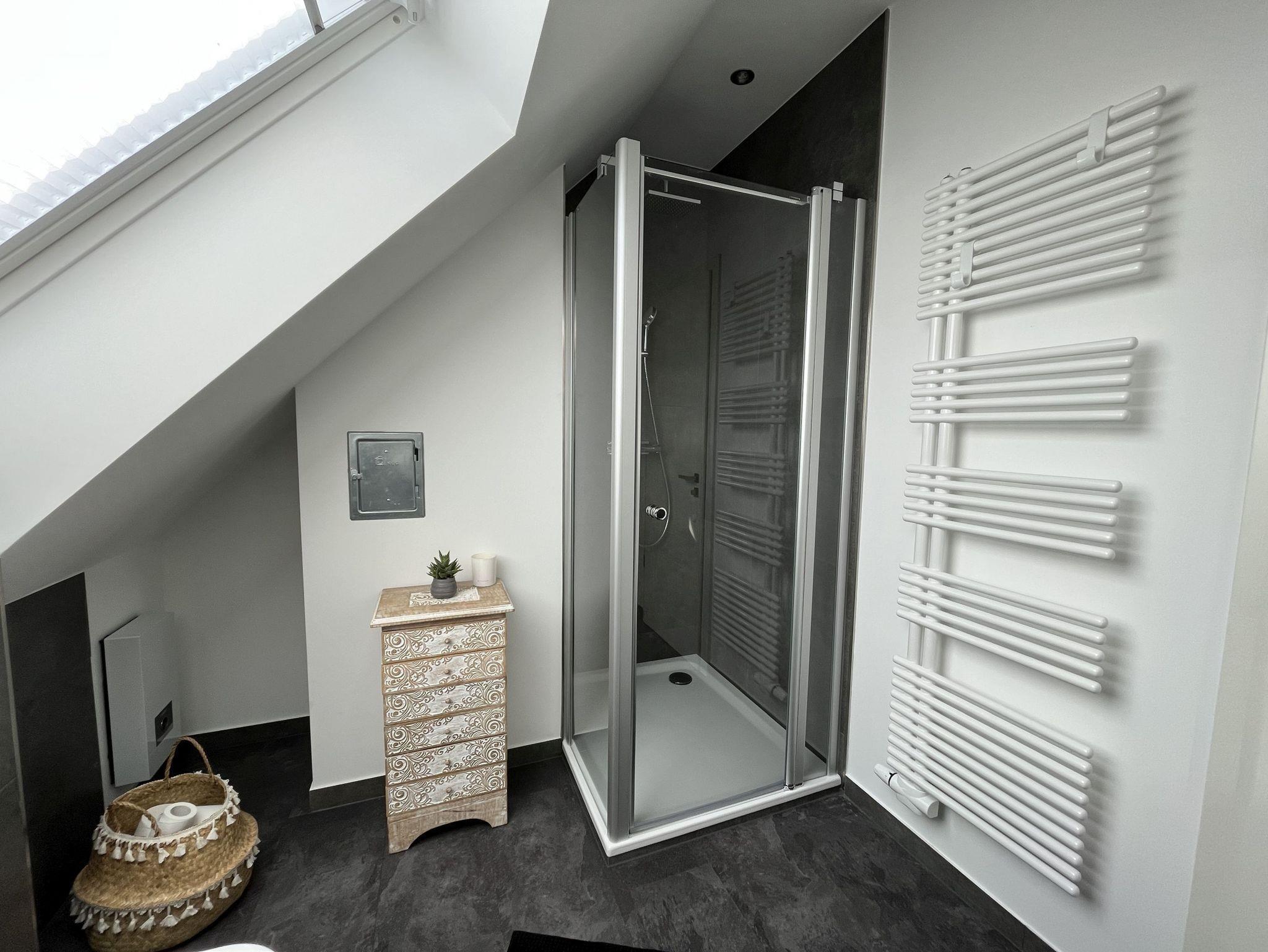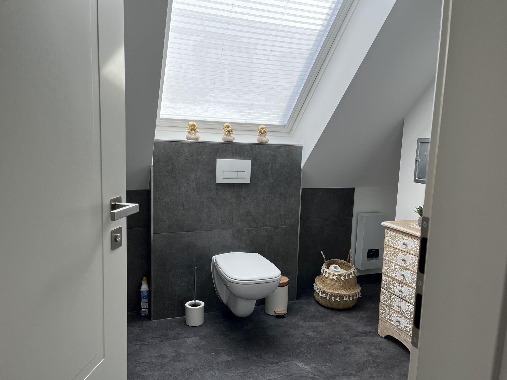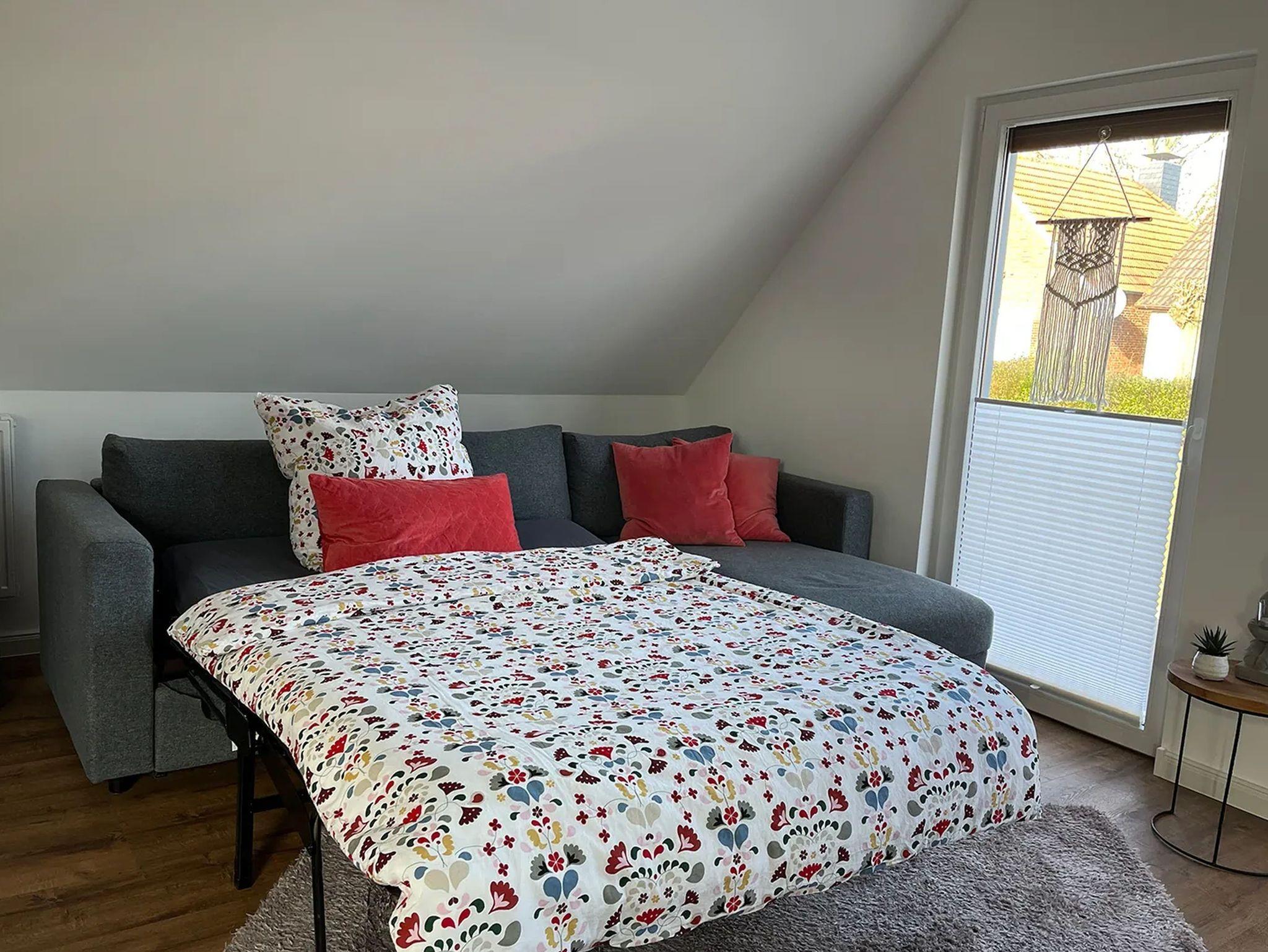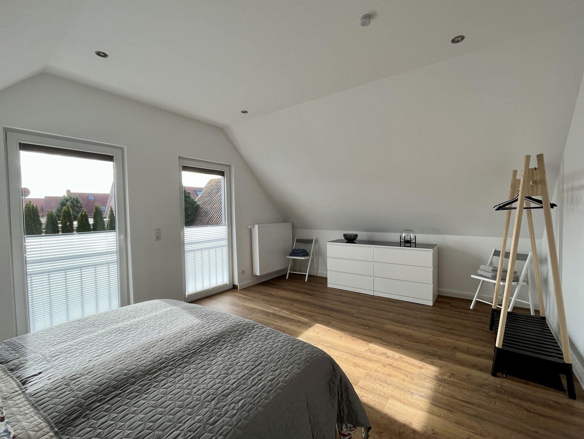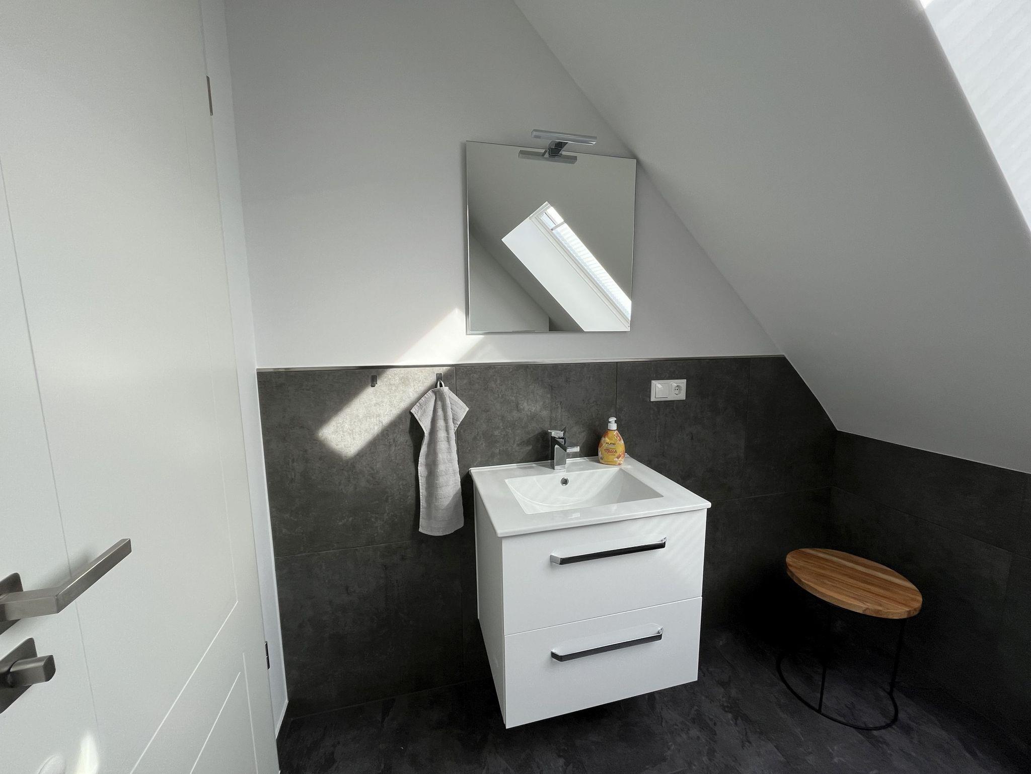 Neue, moderne ca. 60 m² große Nichtraucher-Wohnung im Dachgeschoss eines 2- Familienhauses. 1 Pkw Stellplatz direkt am Haus. Weitere Parkplätze an der Straße nur gegen Gebühr (Parkscheinautomat) oder mit Parkscheibe (max. 4 h). In der Wohnung findet sich eine moderne und dennoch gemütliche Einrichtung. Offene, voll ausgestattete Küche inkl. Ceran-Kochfeld, Backofen, Mikrowelle und Spülmaschine. Ausreichend Besteck, Gläser und Geschirr für 12 Pers. Integrierter Essplatz mit 4 Sitzgelegenheiten (auf Wunsch 1 x Kinderhochstuhl vorhanden). Gemütliches Ecksofa (Schlafsofa ausklappbar für 3. Pers., Liegefläche 1,40 x 2,00 m) im Wohnraum. JBL-Bluetooth Lautsprecher zum Abspielen eigener Musik, Smart TV, Glasfaseranschluss, WLAN kostenlos. 2. Smart TV im Schlafzimmer. Diverse Bücher, Spielesammlung vorhanden.