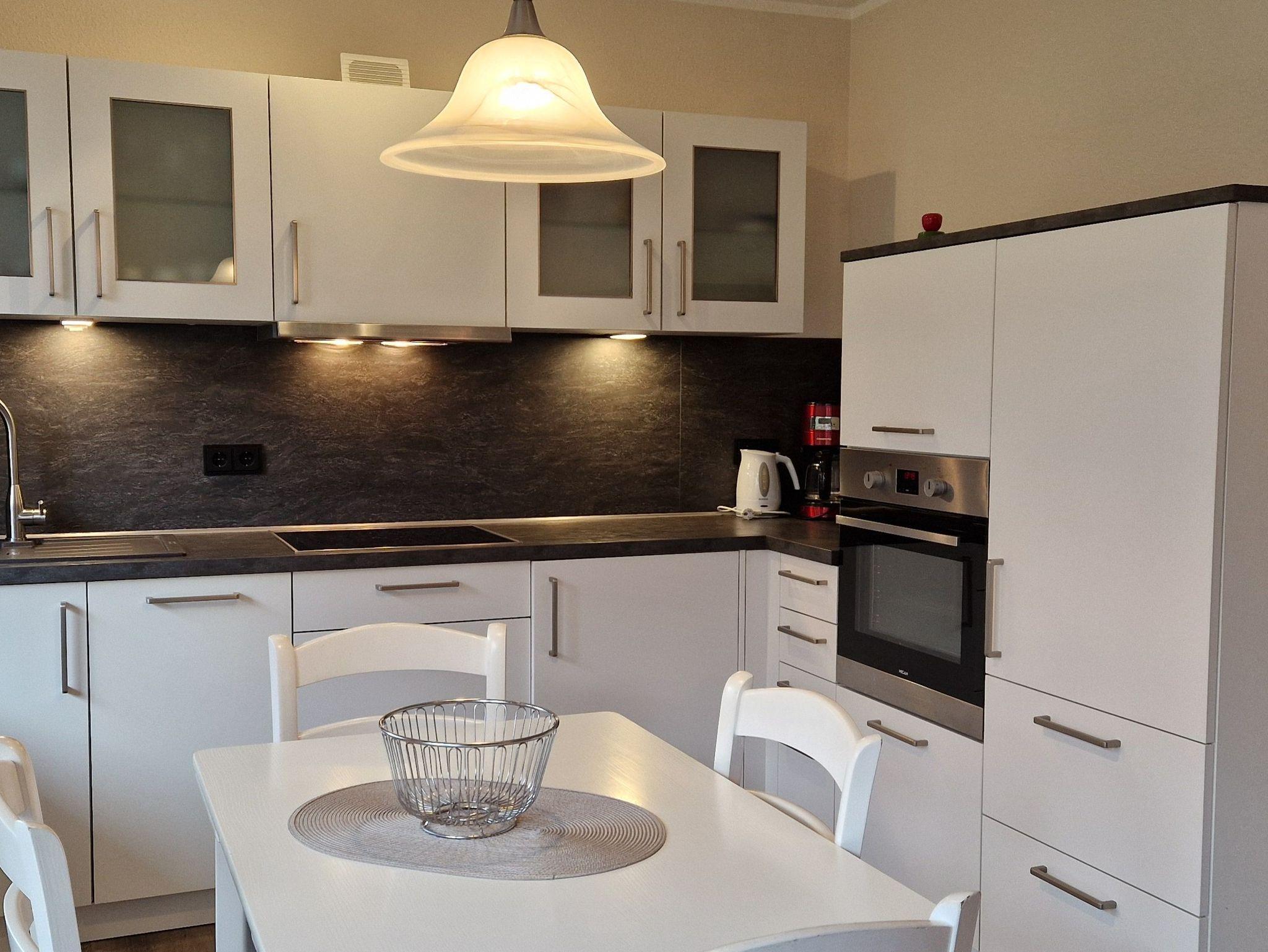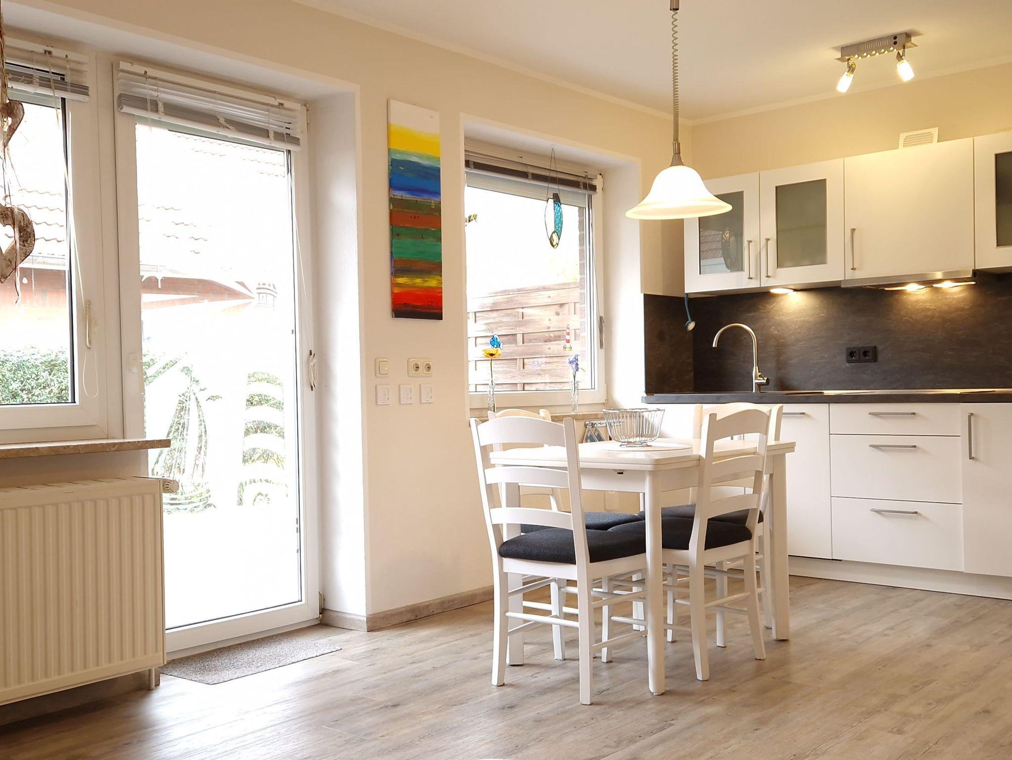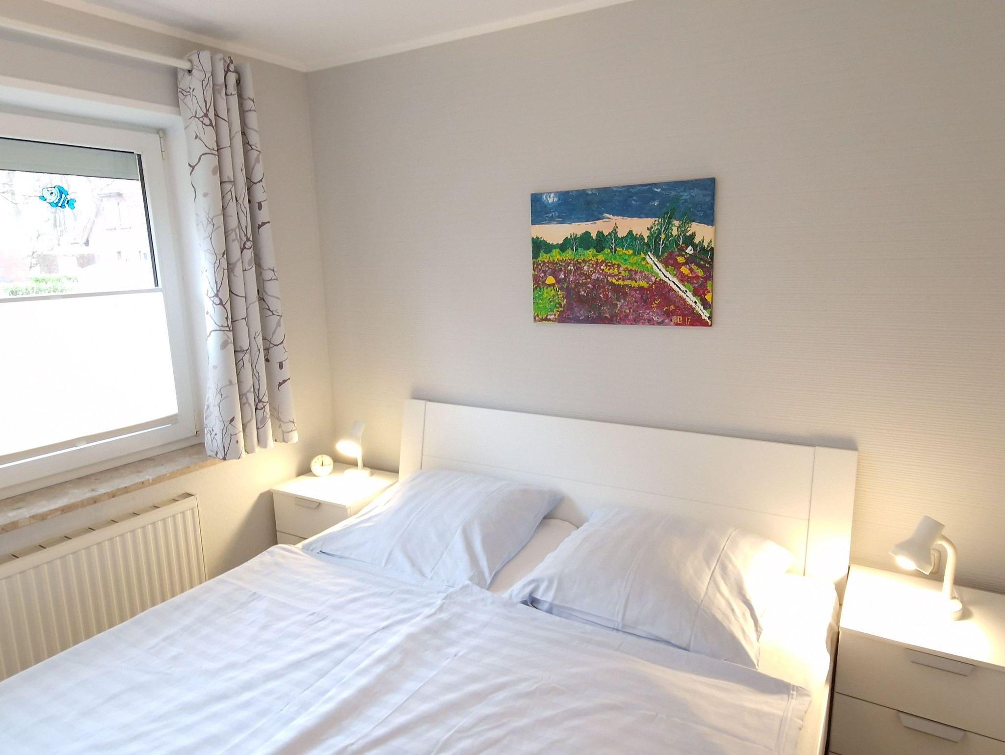 Die modernisierte Ferienwohnung bietet auf ca. 58m² Wohnfläche einen offenen Wohn- und Essbereich mit einer vollausgestatteten Küche. Darüber hinaus stehen Ihnen 2 Schlafzimmer (1 Schlafzimmer mit Doppelbett, 1 Schlafzimmer mit Etagenbett) sowie ein komfortables Badezimmer mit Dusche zur Verfügung. Die Fenster sind mit Rollläden, die Böden mit Vinyl bzw. Fliesen ausgestattet. WLAN steht Ihnen kostenfrei zur Verfügung.