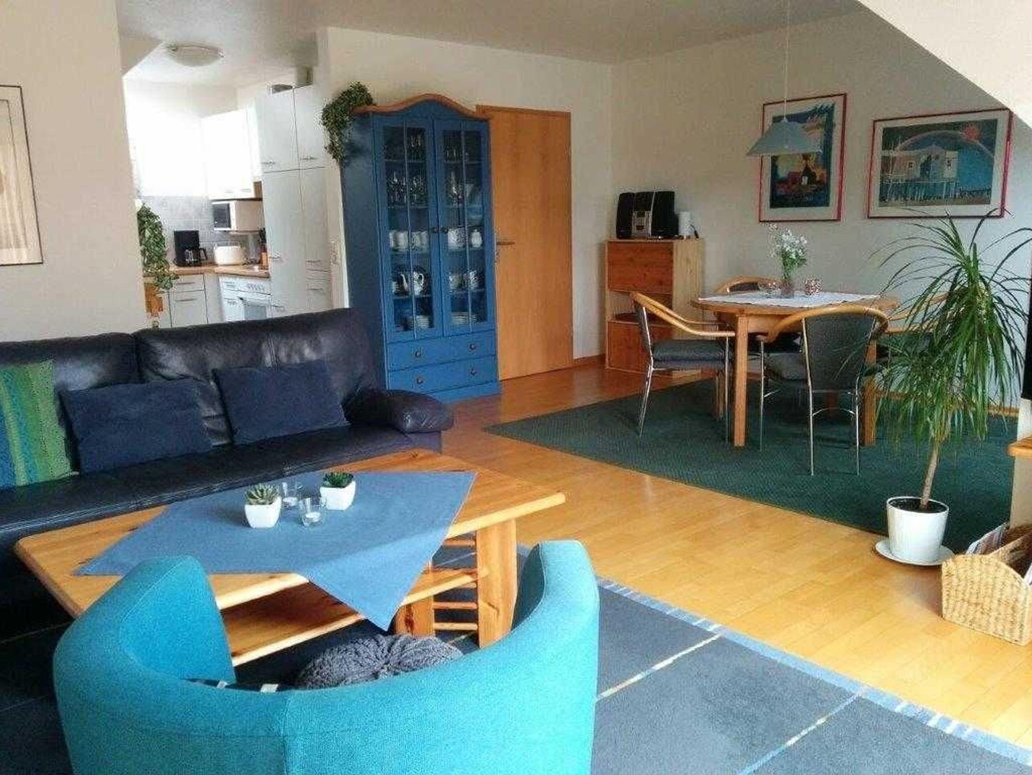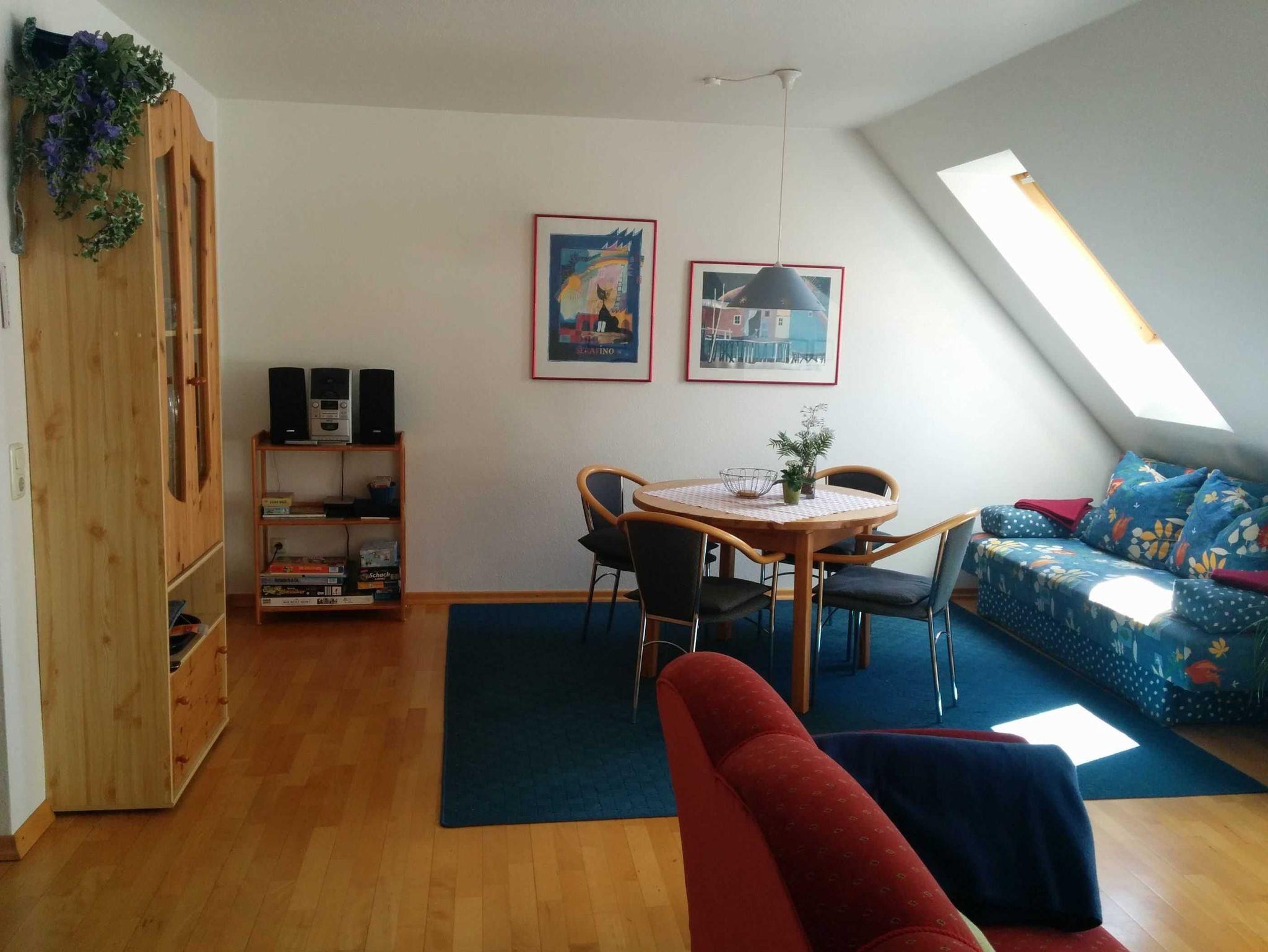 Schöne helle komfortabel und gemütlich eingerichtete Obergeschosswohnung (70 qm) im Ortskern mit Südbalkon, vollständig ausgestattete Einbauküche, großzügiges Wohn- Esszimmer, zusätzliche Schlafcouch, Bad mit Dusche und WC, zwei Schlafzimmer mit Doppelbetten. Die Wohnung ist für Allergiker geeignet. Vier Fahrräder und ein Bollerwagen sind vorhanden. Bettwäsche und Handtücher auf Wunsch gegen Gebühr beim Hausmeister. Hund erlaubt, keine Katzen.