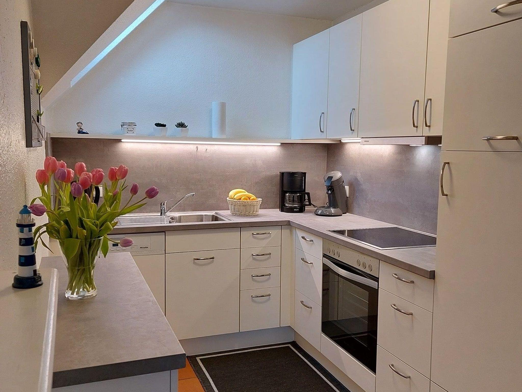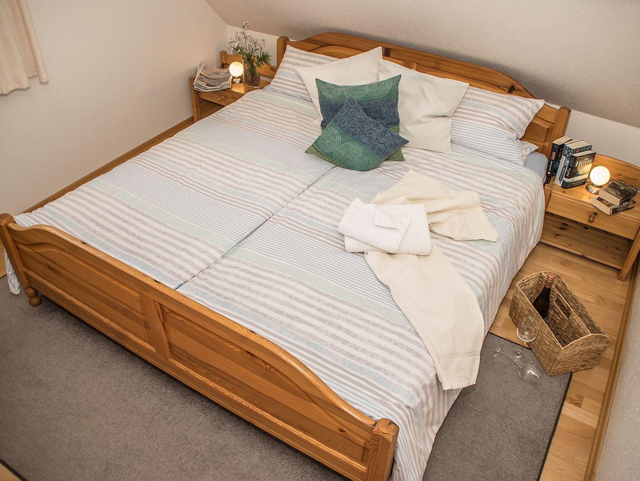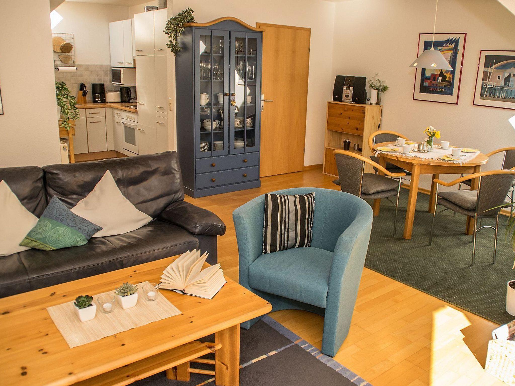 Schöne helle komfortabel und gemütlich eingerichtete Obergeschosswohnung (70 qm) im Ortskern mit Südbalkon, vollständig ausgestattete Einbauküche, großzügiges Wohn- Esszimmer, zusätzliche Schlafcouch, Bad mit Dusche und WC, zwei Schlafzimmer mit Doppelbetten. Die Wohnung ist für Allergiker geeignet. 2 Fahrräder sind vorhanden. Bettwäsche und Handtücher auf Wunsch gegen Gebühr beim Hausmeister. Max. 1 Hund erlaubt, keine Katzen.