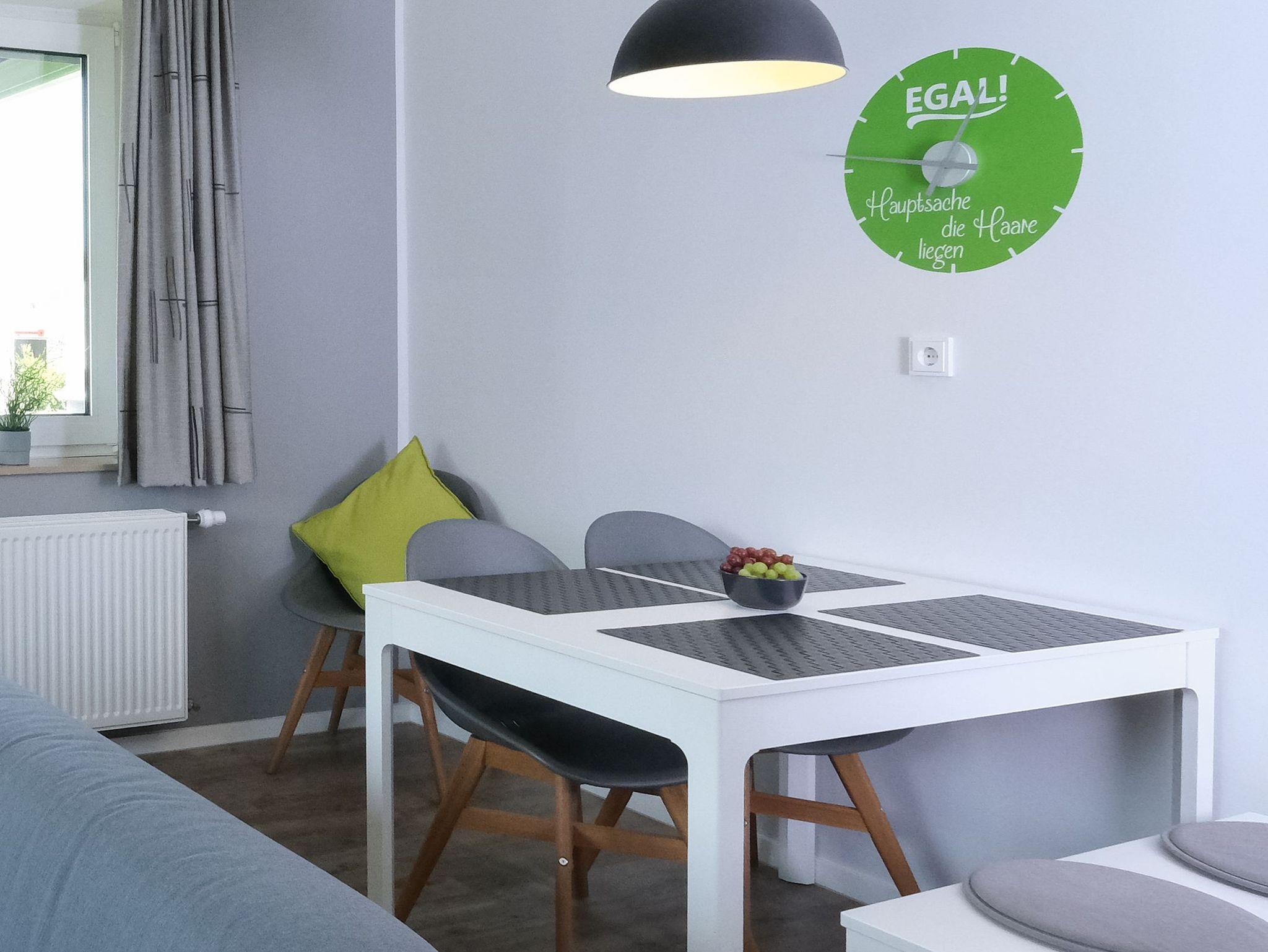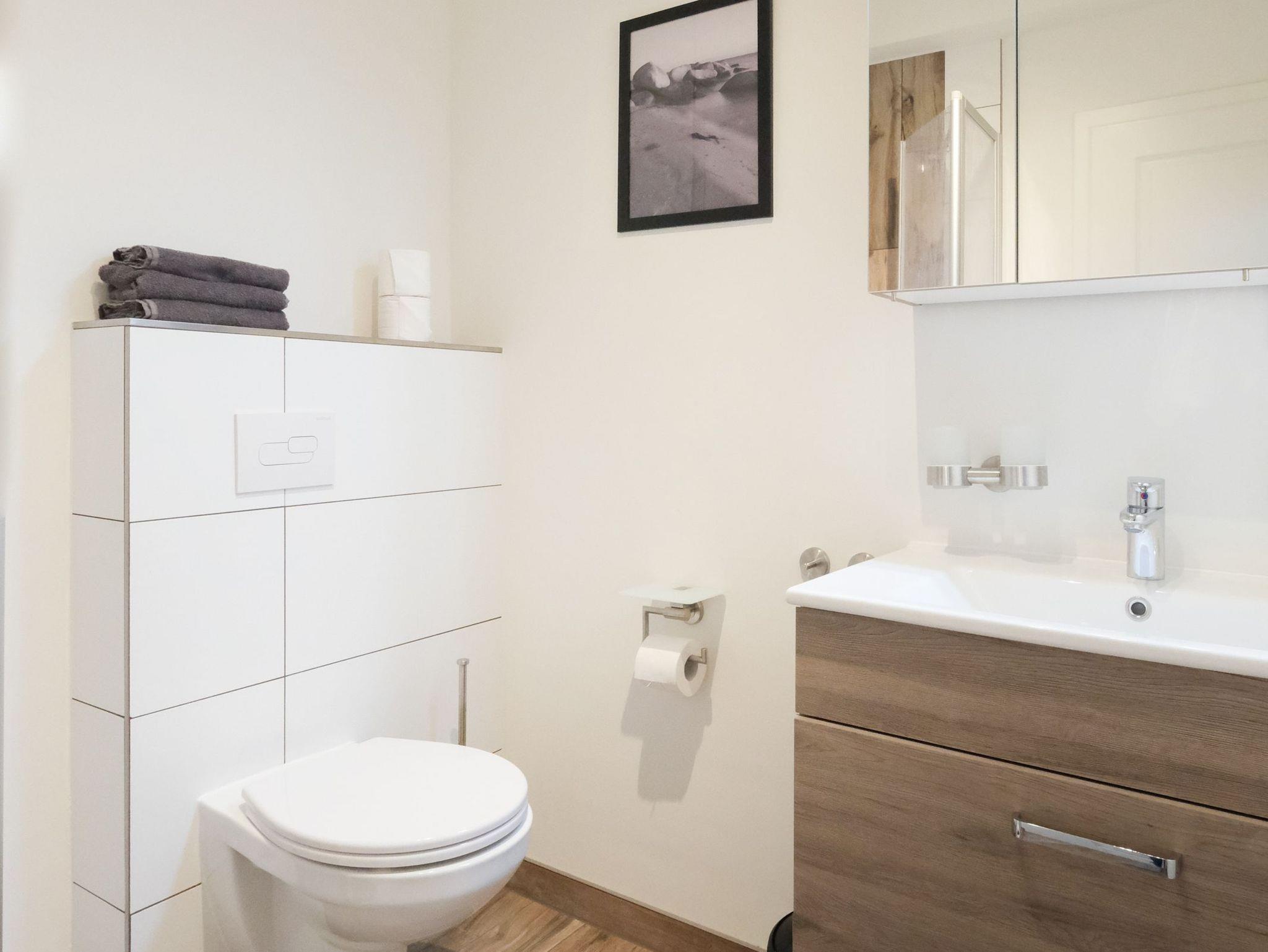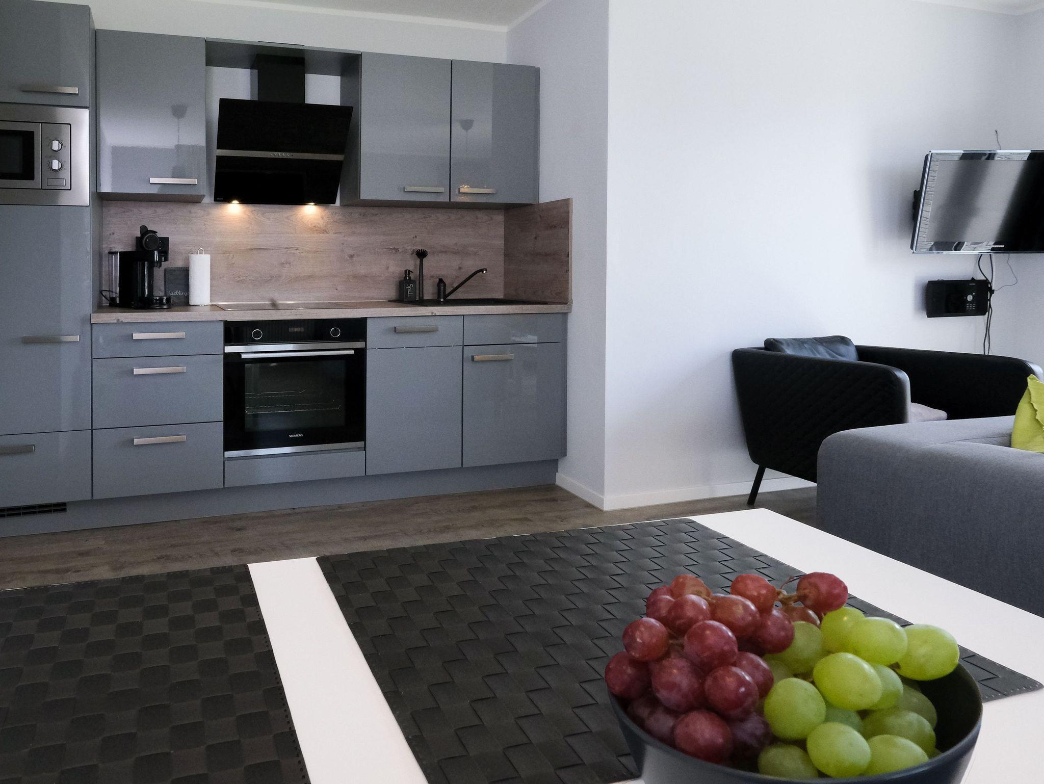 Das moderne Badezimmer mit WC, Waschtisch, bodengleicher Dusche und Fön erreichen Sie vom einladend gestalteten Flur mit Garderobe. Der offen gestaltete Wohn- und Essbereich ist durch die vielen Fensterflächen besonders hell. Die hochwertige Küchenzeile ist voll ausgestattet und verfügt über eine Spülmaschine, einen Backofen mit Cerankochfeld, eine Mikrowelle, einen großen Kühlschrank mit separatem Gefrierfach, eine Kaffeemaschine (wahlweise Pad oder Filter), einen Wasserkocher, Toaster u.v.m. Am Esstisch finden bis zu 5 Personen Platz.