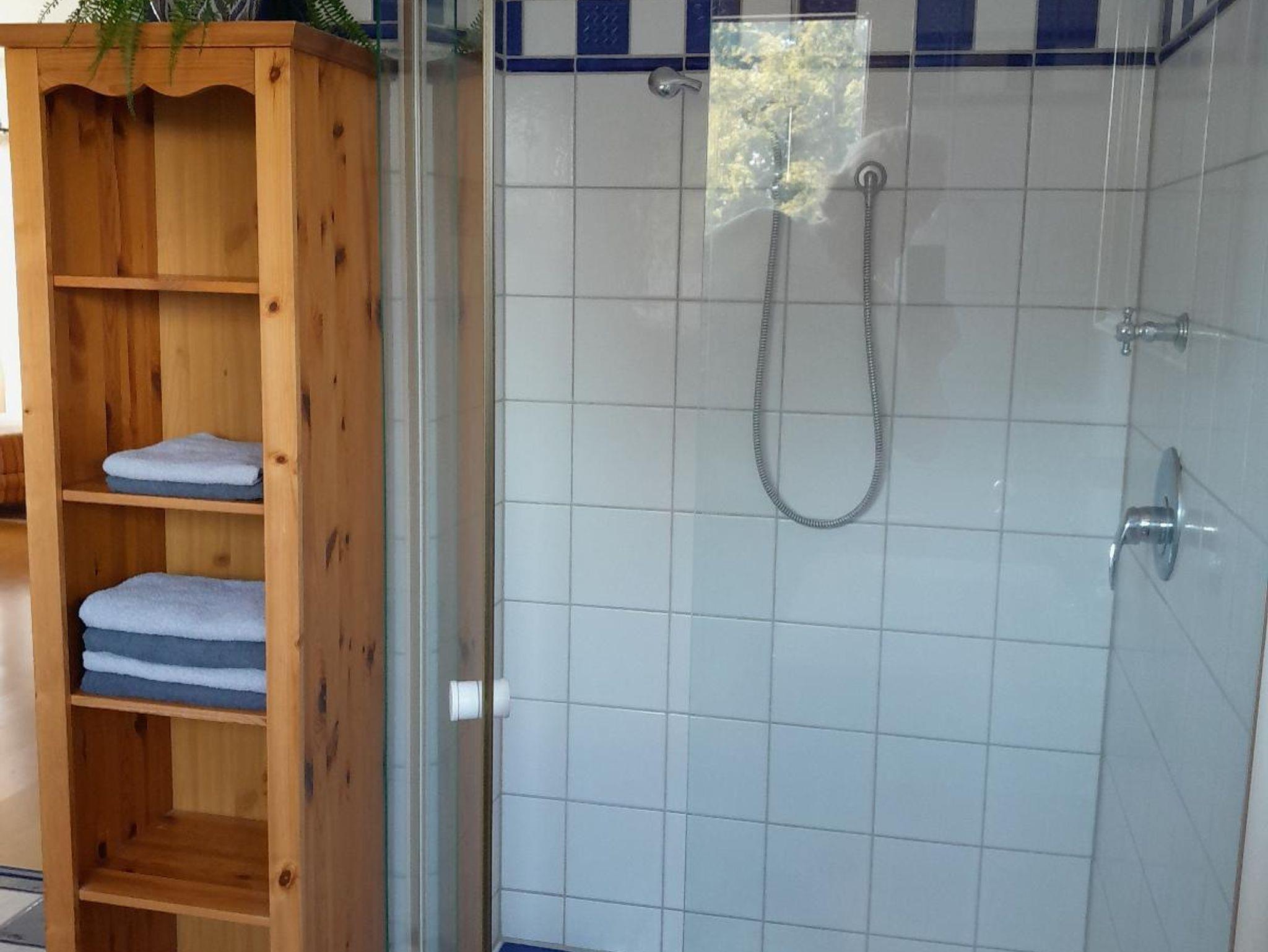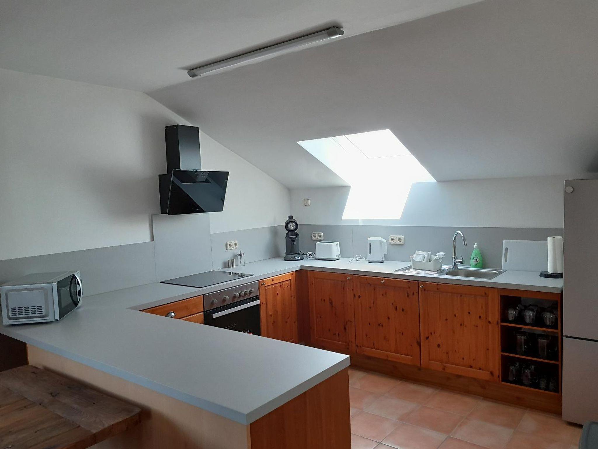 Die voll ausgestattete Einbauküche lässt keine Wünsche offen: Elektroherd, Backofen, Kühlschrank mit Gefrierfach, Kaffeemaschine, Mikrowelle, Wasserkocher, Toaster sowie alle notwendigen Küchenutensilien stehen Ihnen zur Verfügung. Handtücher, Geschirrtücher, Spüllappen und Spülmittel sind ebenfalls vorhanden. Ein Bügelbrett, Bügeleisen und Wäscheständer runden die Ausstattung ab.