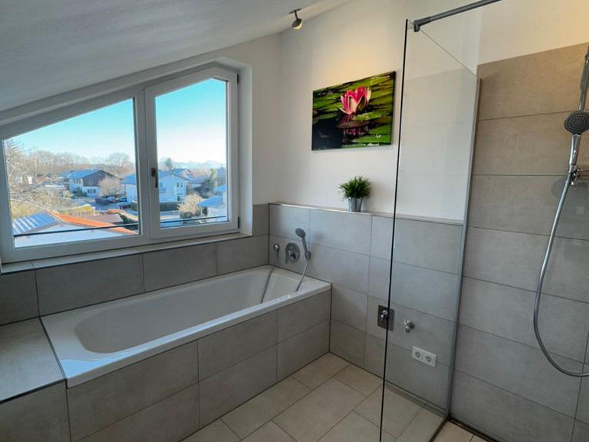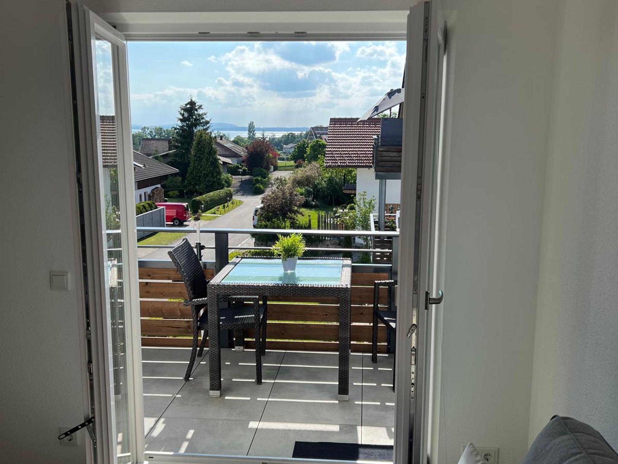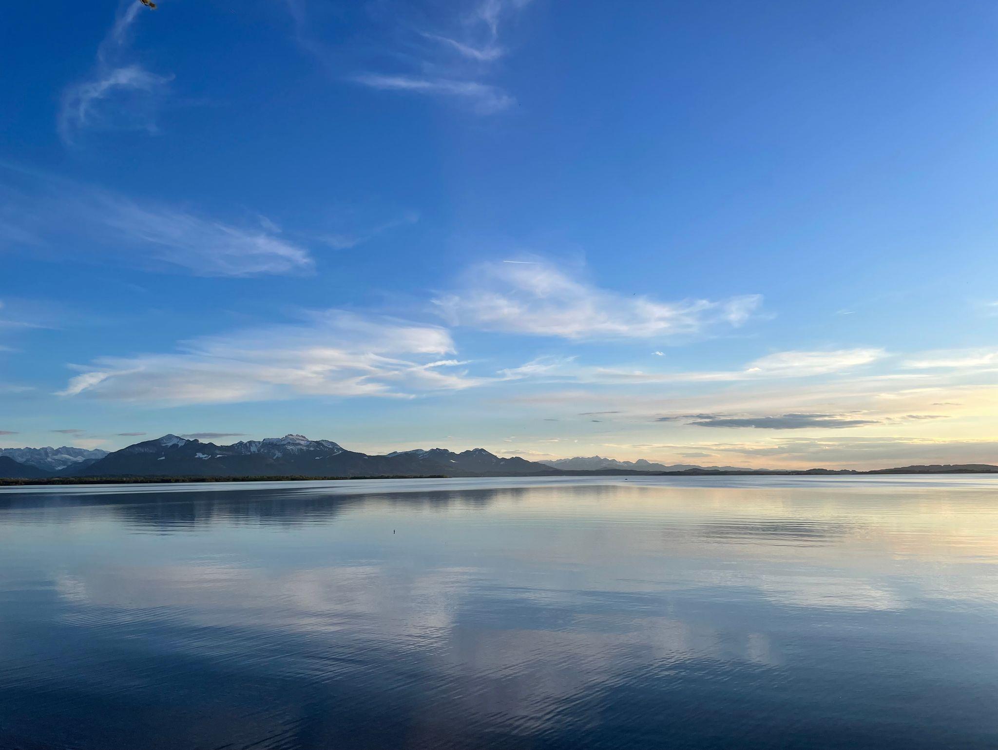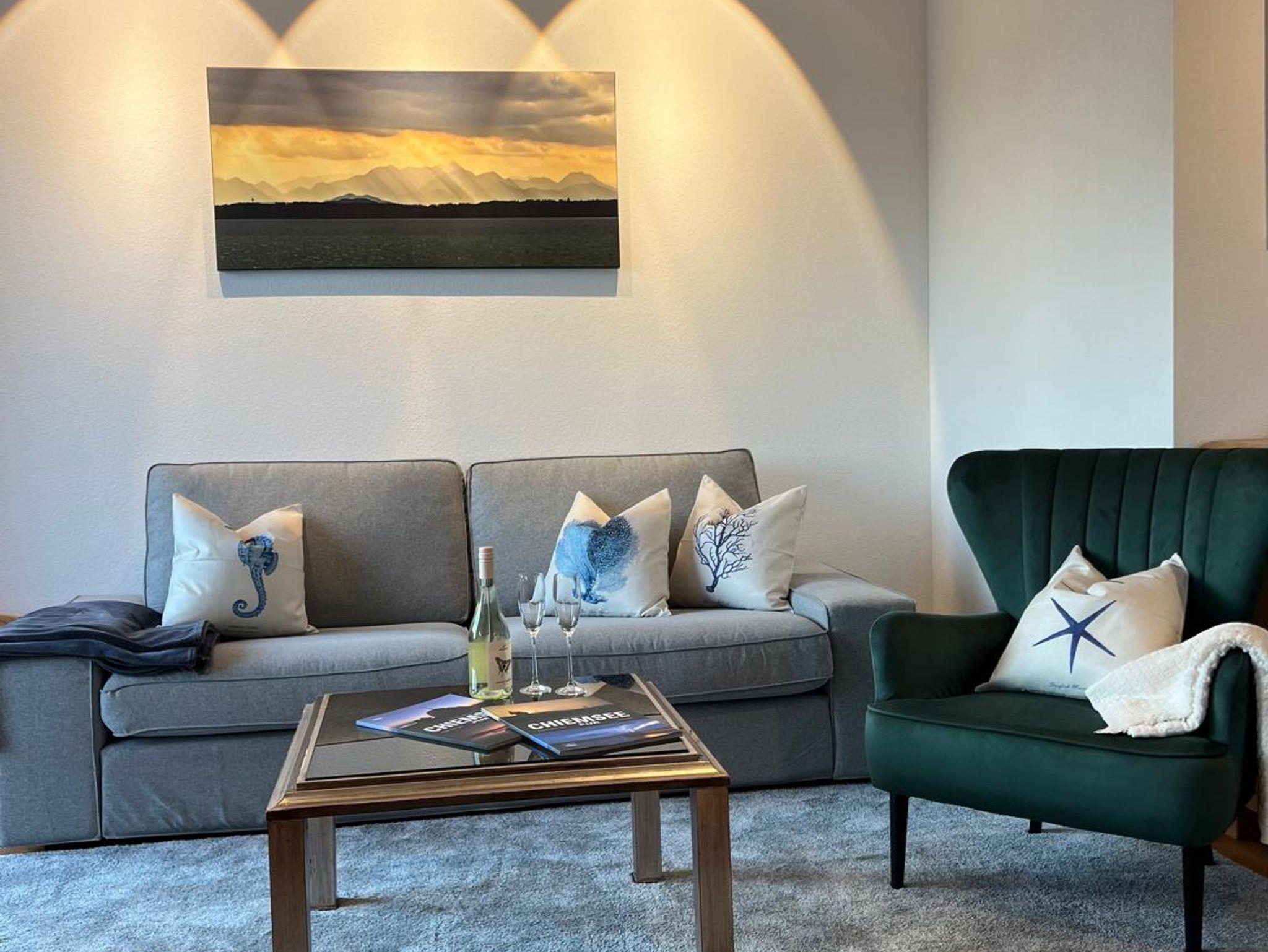Panoramablick über das bayrische Meer vor den Chiemgauer Alpen. Hier am Chiemsee wollen wir Ihnen die verdiente Auszeit vom Alltag ermöglichen. Unser Ambiente umfasst eine neue 3,5 Zimmerwohnung im 2. Stock mit hochwertiger Einrichtung, Balkon, kostenlosem Wlan, Tiefgaragenparkplatz und zentraler Lage innerhalb 500m von Chiemsee und Ortskern.