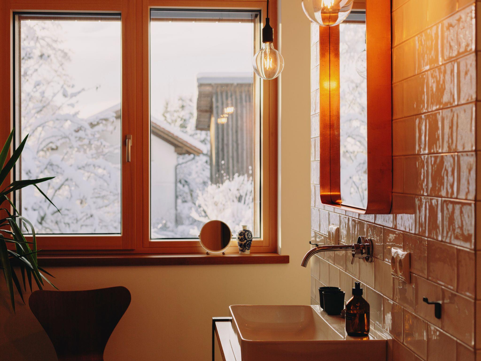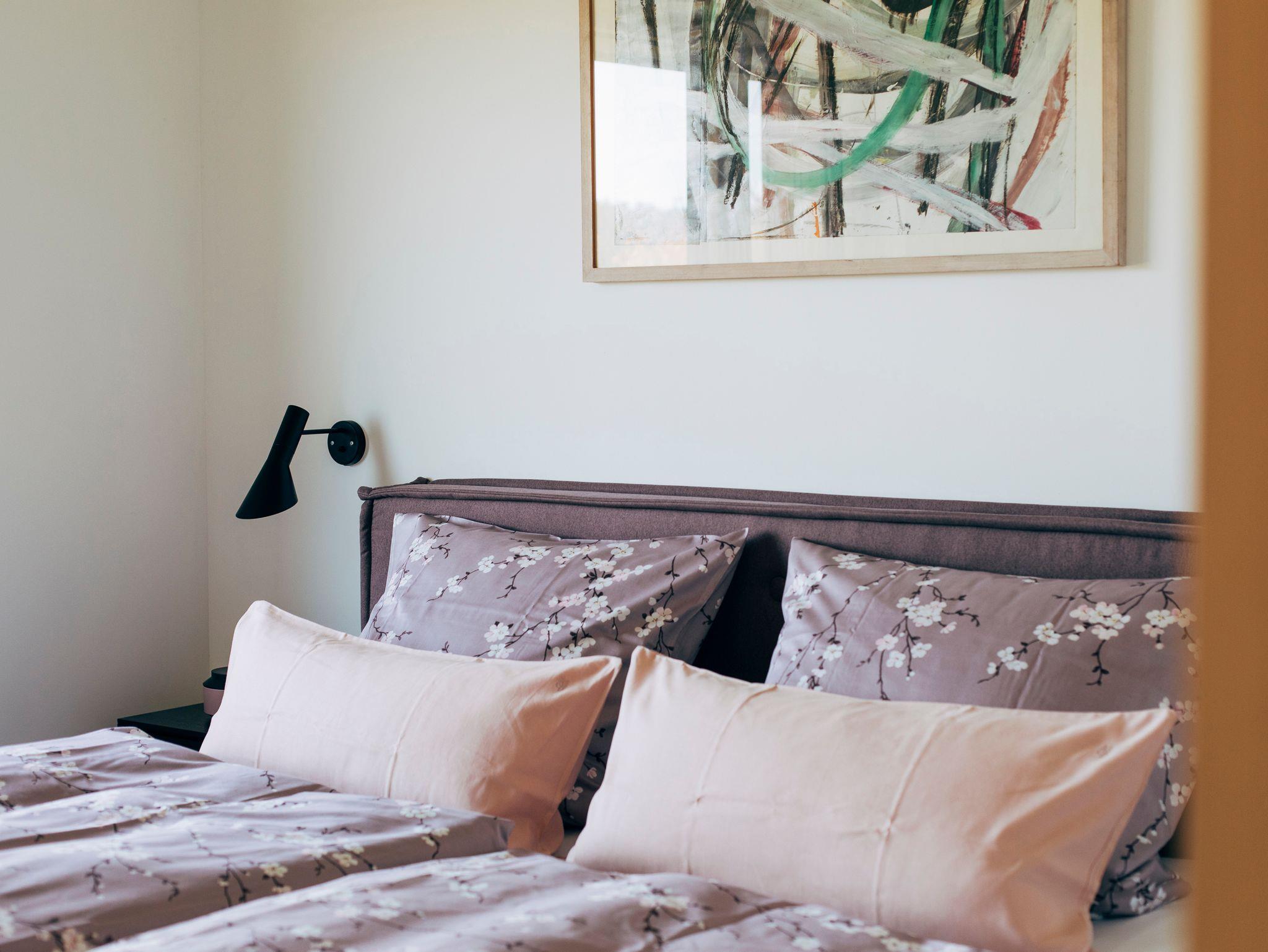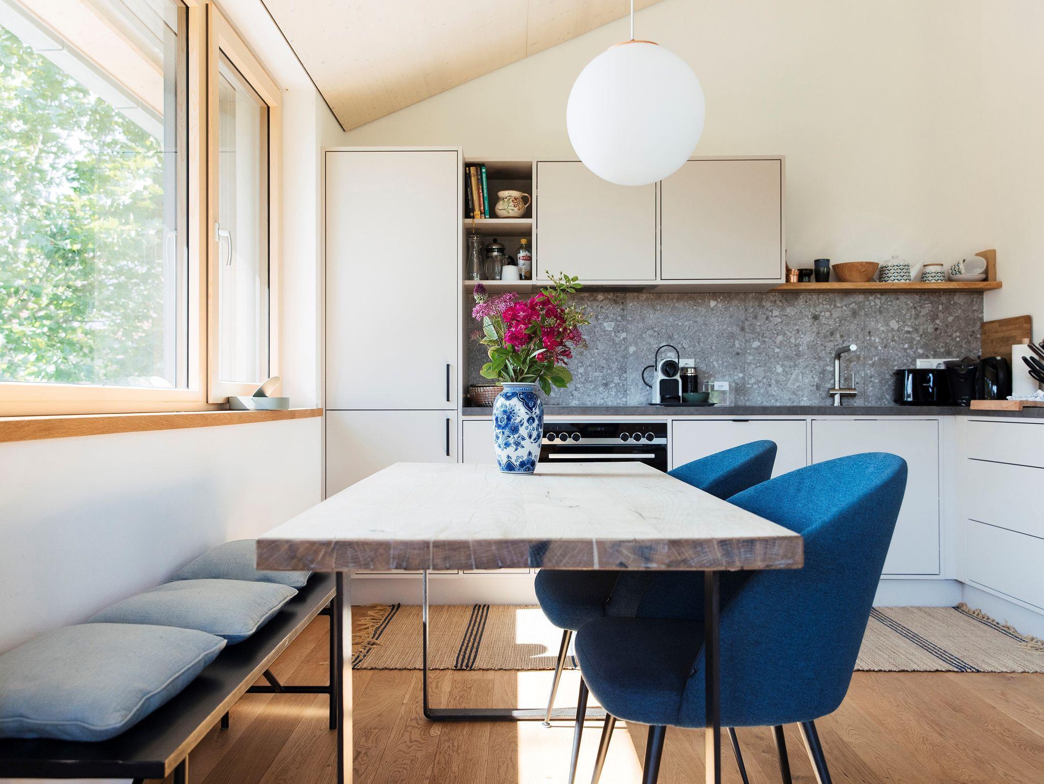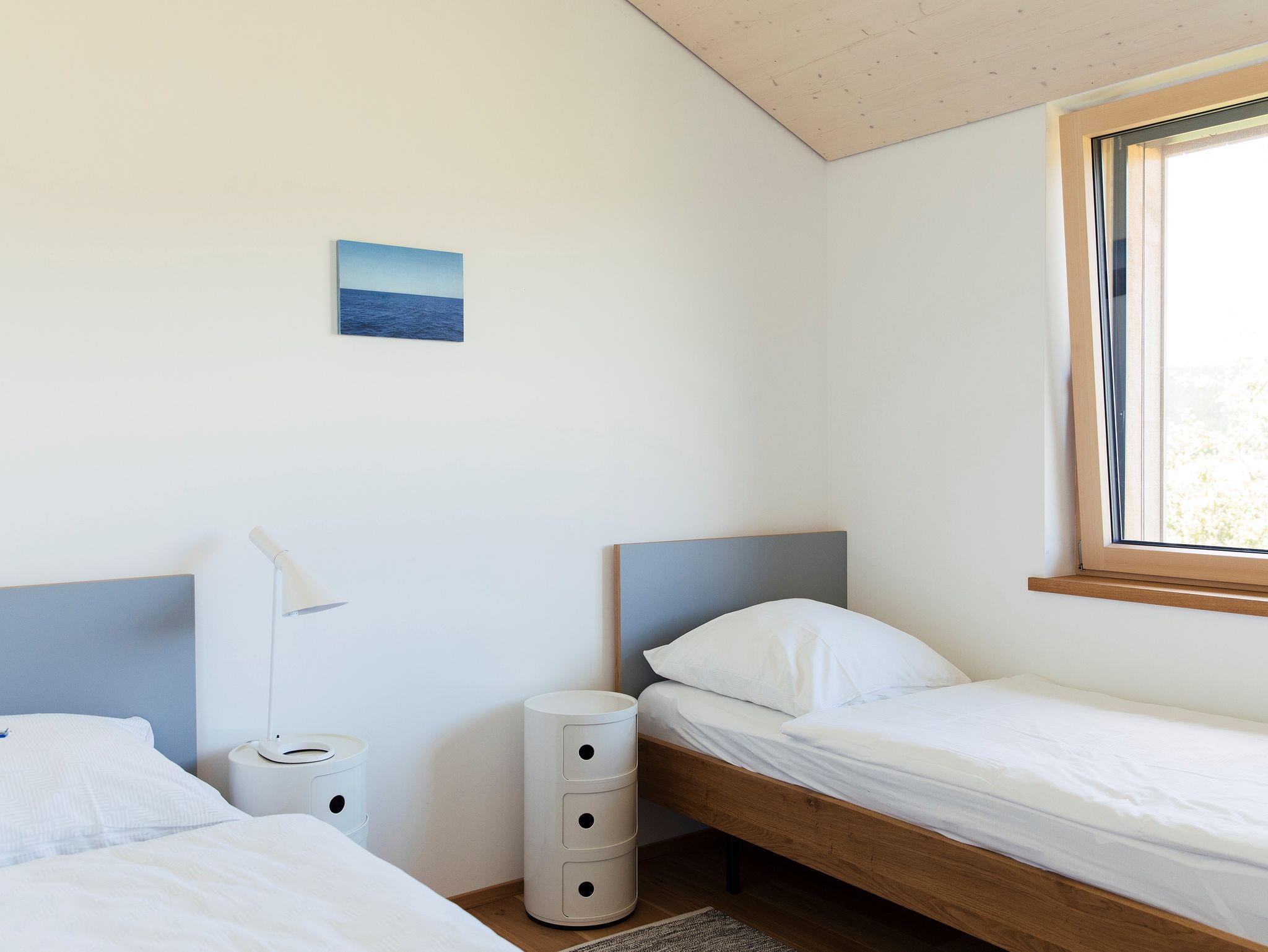 Die Ferienwohnung KATHI im Obergeschoss besticht durch ihre Raumhöhe von bis zu 4 m. Sie bietet viel Privatsphäre und Geborgenheit. Beim Blick aus dem Küchenfenster in die Kronen hoher Bäume fühlt man sich beinahe wie in einem Baumhaus. Das Wohnzimmer mit exklusiver Sofalandschaft, dänischem Sideboard und Lounge-Chair besitzt zudem ein Panoramafenster mit integrierter Sitzbank und Bergblick. Von der maßgefertigten Schreinerküche mit gemütlichem Essplatz hat man Zugang auf die große, überdachte Loggia mit Frühstücks-Sitzplatz und Lounge-Sofa für den Drink zum Sonnenuntergang. Die beiden Schlafzimmer sind mit hochwertigen Betten ausgestattet. Das Elternschlafzimmer mit einem Boxspringbett (180 x 200cm), das Kinderzimmer mit zwei Einzelbetten (90 x 200cm). Das großzügige Tageslichtbad verfügt über Regendusche, WC-Nische, Badewanne und hochwertigen Accessoires.