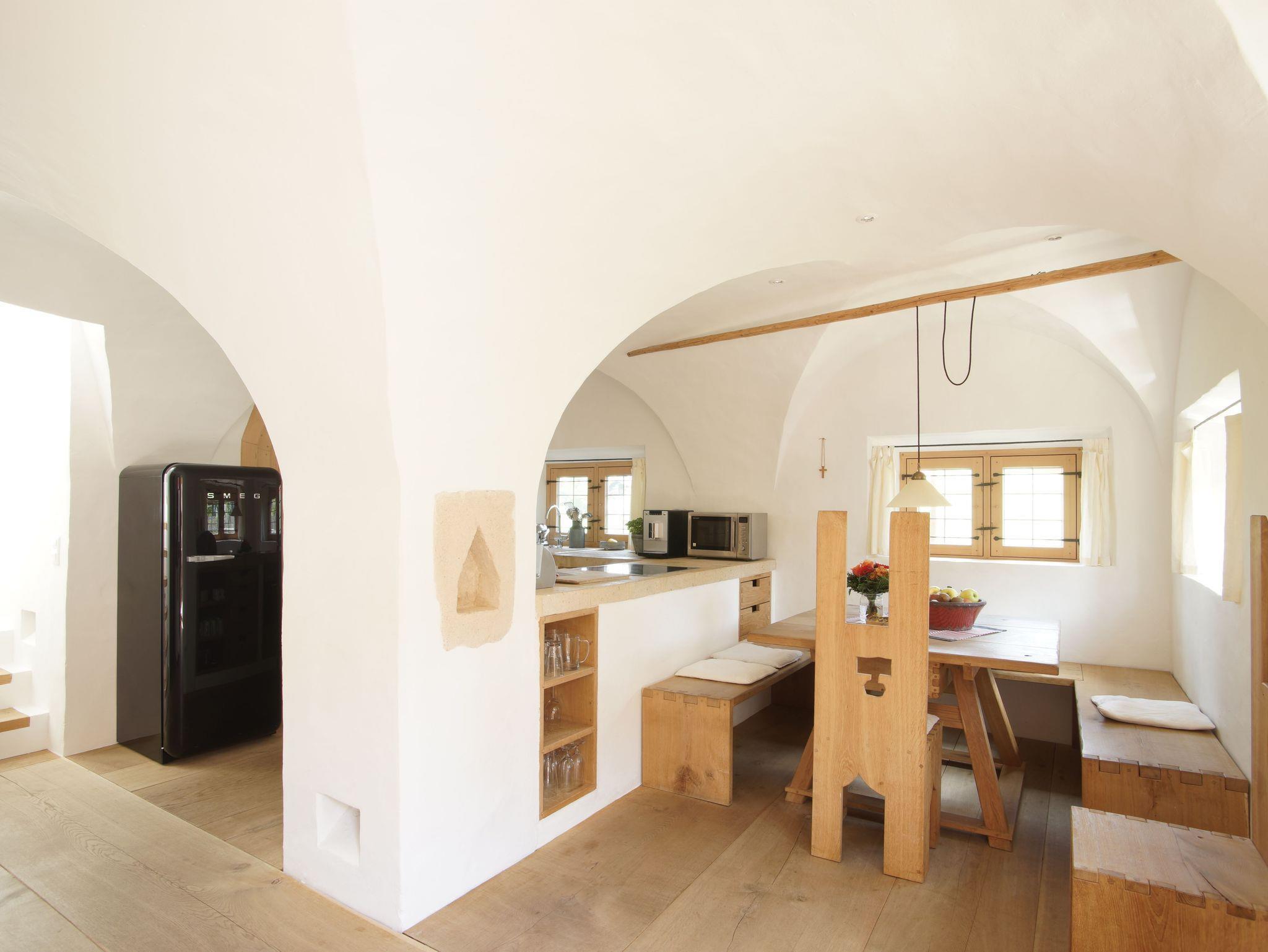 Unsere Wohnung Katharina besticht durch ihre individuelle Ausstattung mit einem Wohn- und Essbereich mit Gewölben, sowie einer gemütlichen Sitzecke mit Kachelofen.
