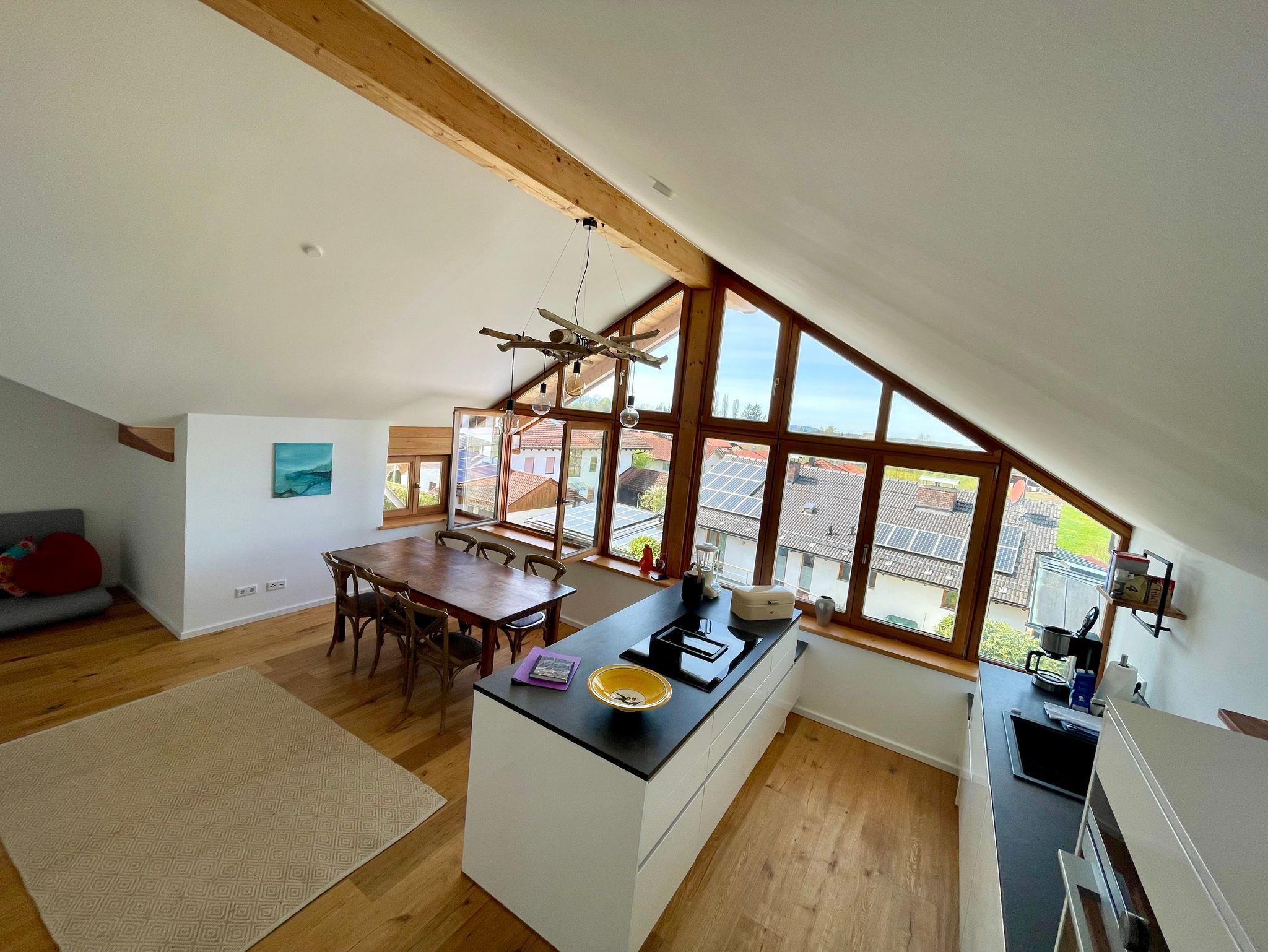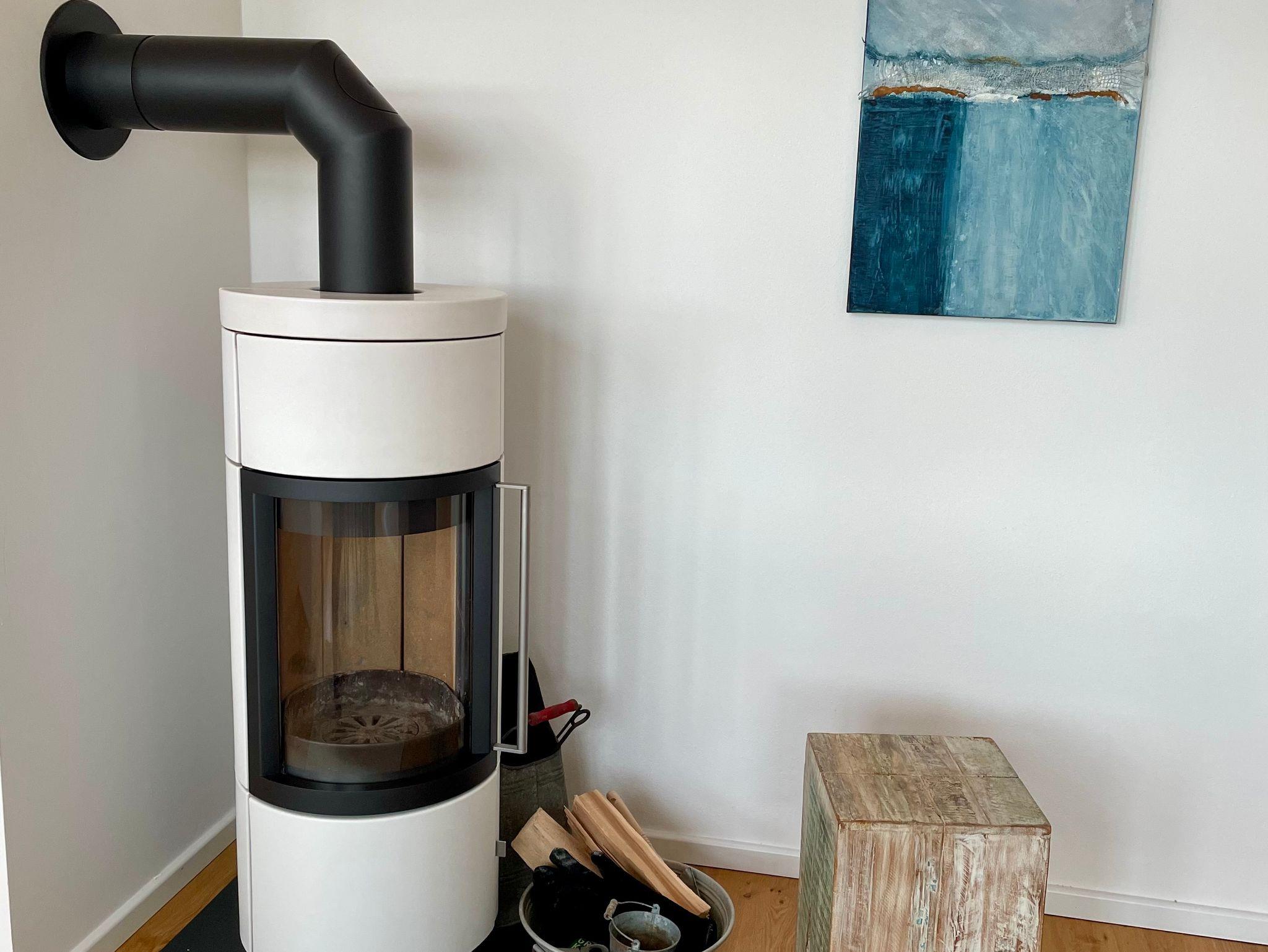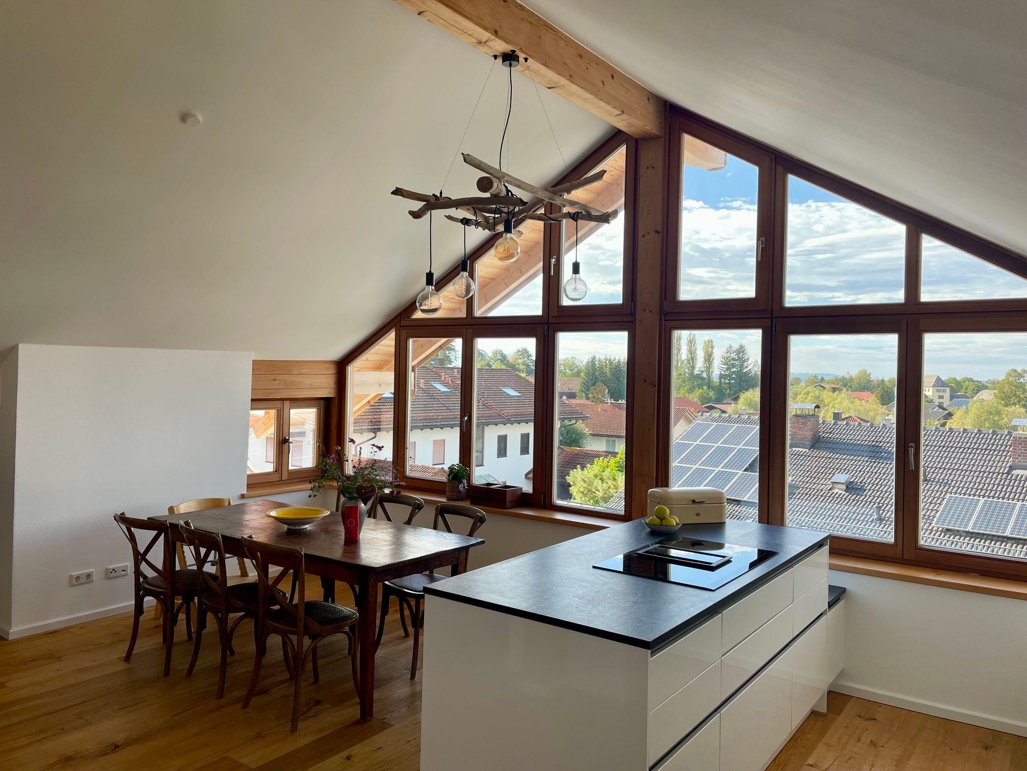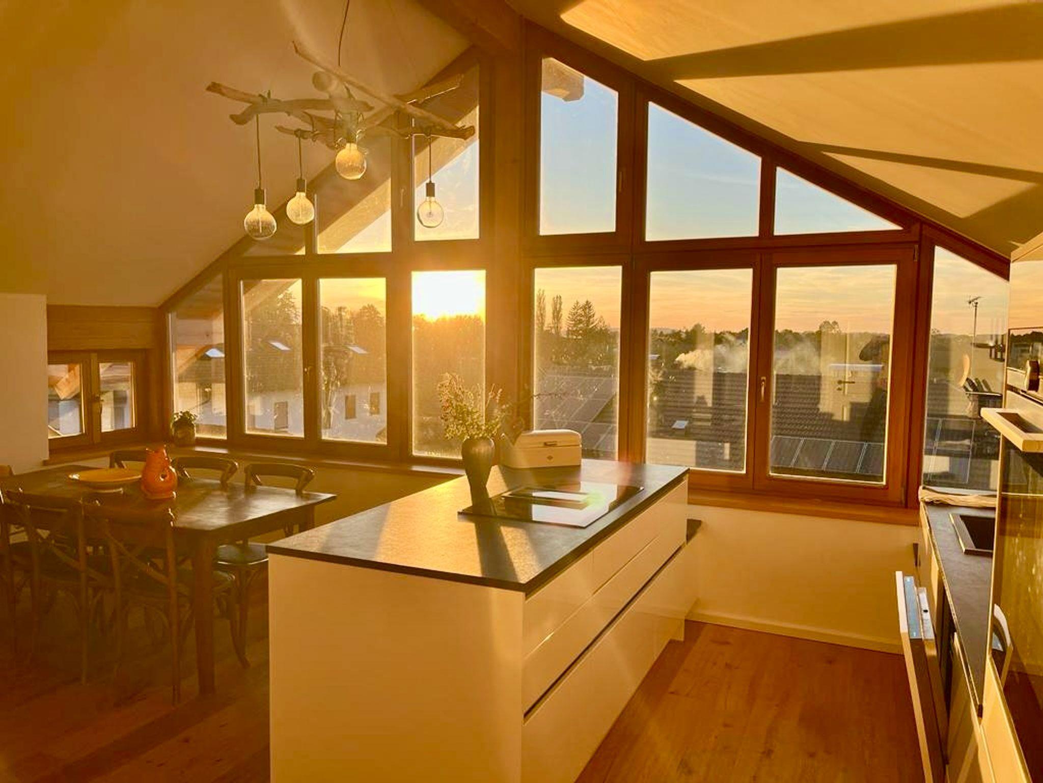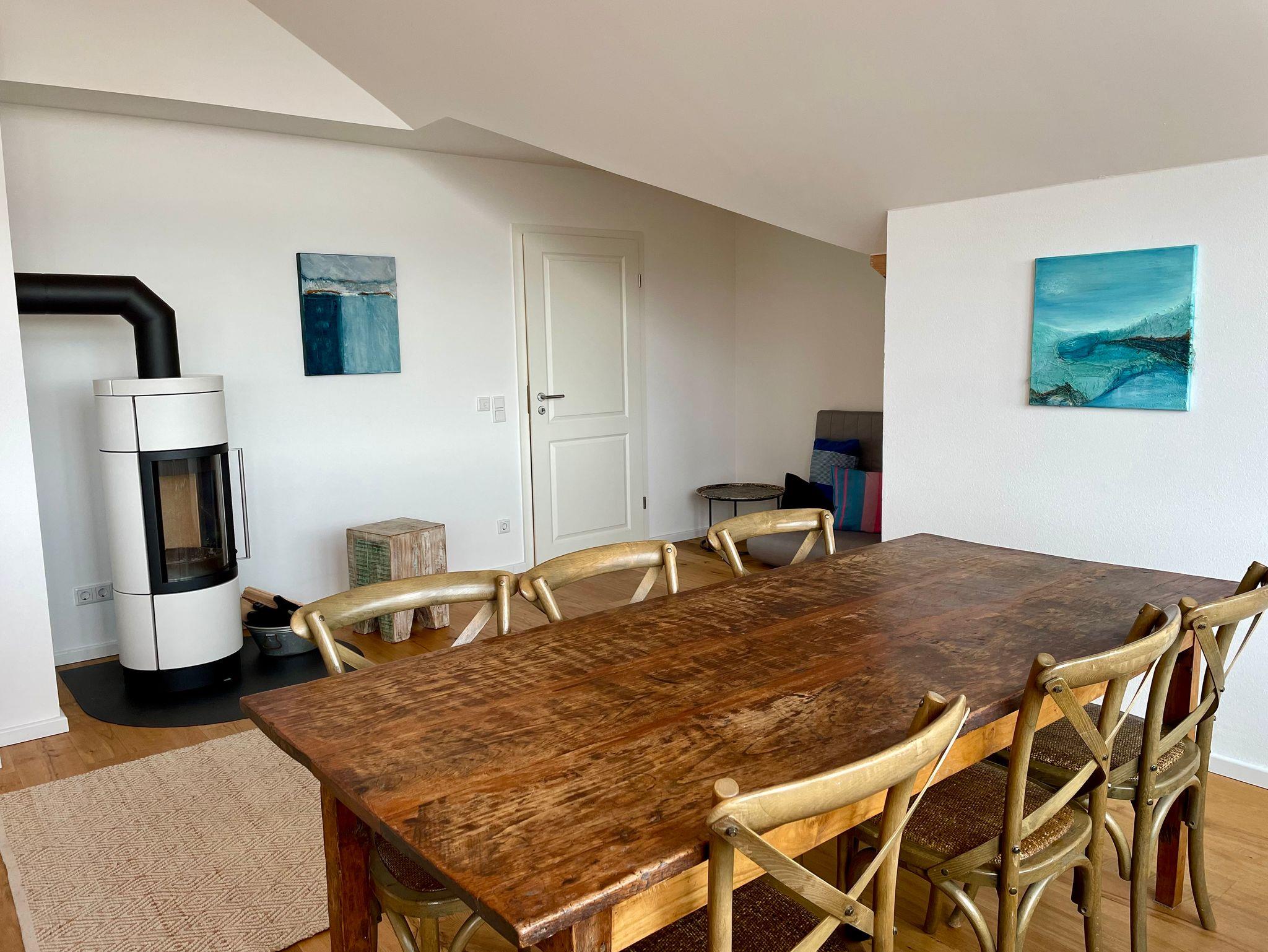 Große offene, gemütliche Wohn-Küche mit Kamin und Weitblick. Induktionsküche mit Küchenblock, die FeWo ist stilvoll und charmant neu eingerichtet. Zudem mit Balkon und Outdoor-Fläche.