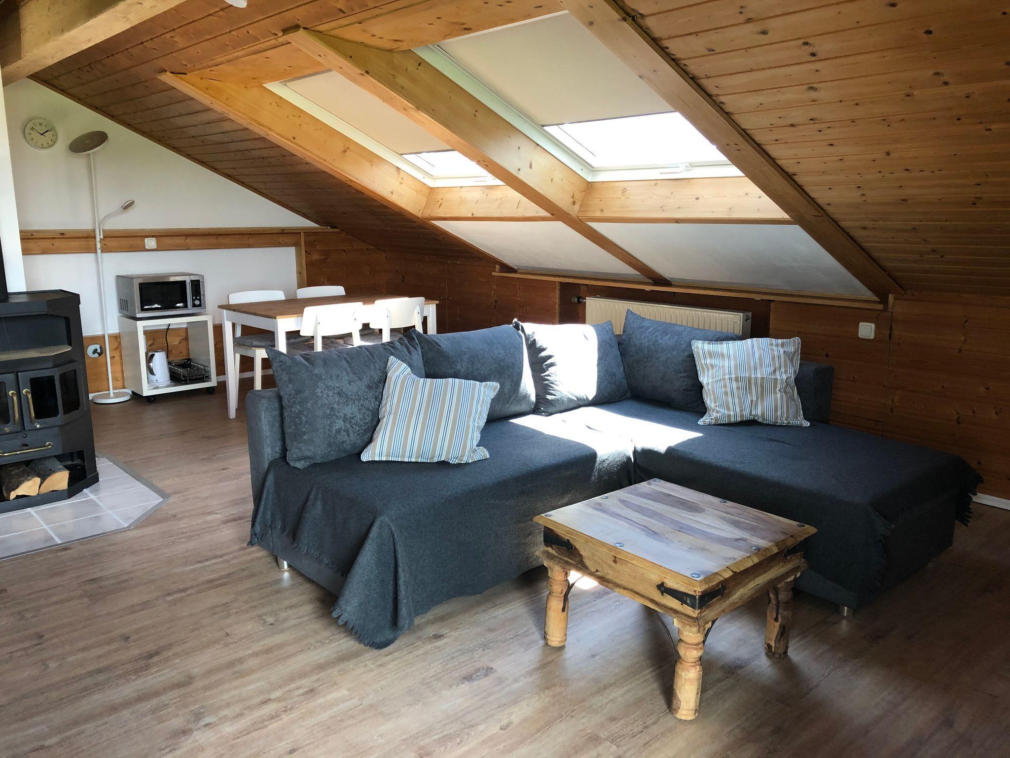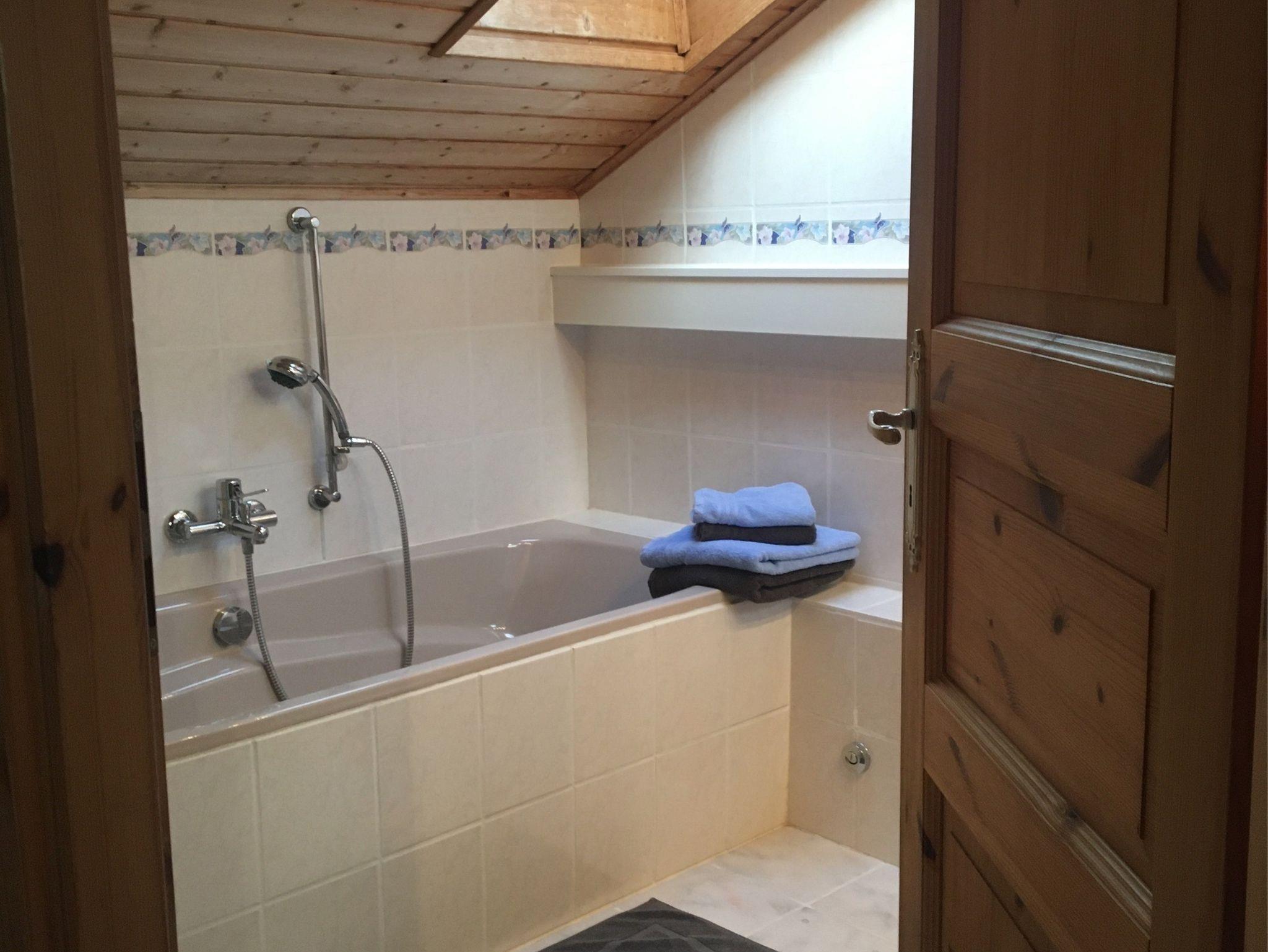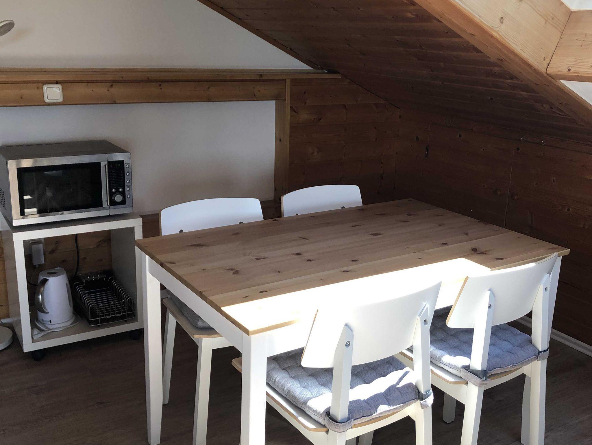 Über einen separaten Aufgang/Eingang erreichen Sie die Ferienwohnung im Dachgeschoss unseres Hauses. Der Wohnraum verfügt über eine kleine offene Küche und über eine gemütliche Couchgarnitur sowie eine Essecke. Über die großen Dachfenster sind unsere herrlichen Berge zu sehen, vom überdachten Balkon aus können Sie bei einem Glas Wein die Abendsonne genießen. Das Schlafzimmer ist mit einem Doppelbett (160cm) und einem Kleiderschrank ausgestattet. Badezimmer mit Badewanne (keine vollwertige Dusche!) Besonderheiten: Bettwäsche, Handtücher, Geschirrtücher und Föhn inkl., Zentralheizung, Kaffeemaschine, Kühlschrank, Herd, Mikrowelle, Spülmaschine, Abstellplatz für Fahrräder, WLAN