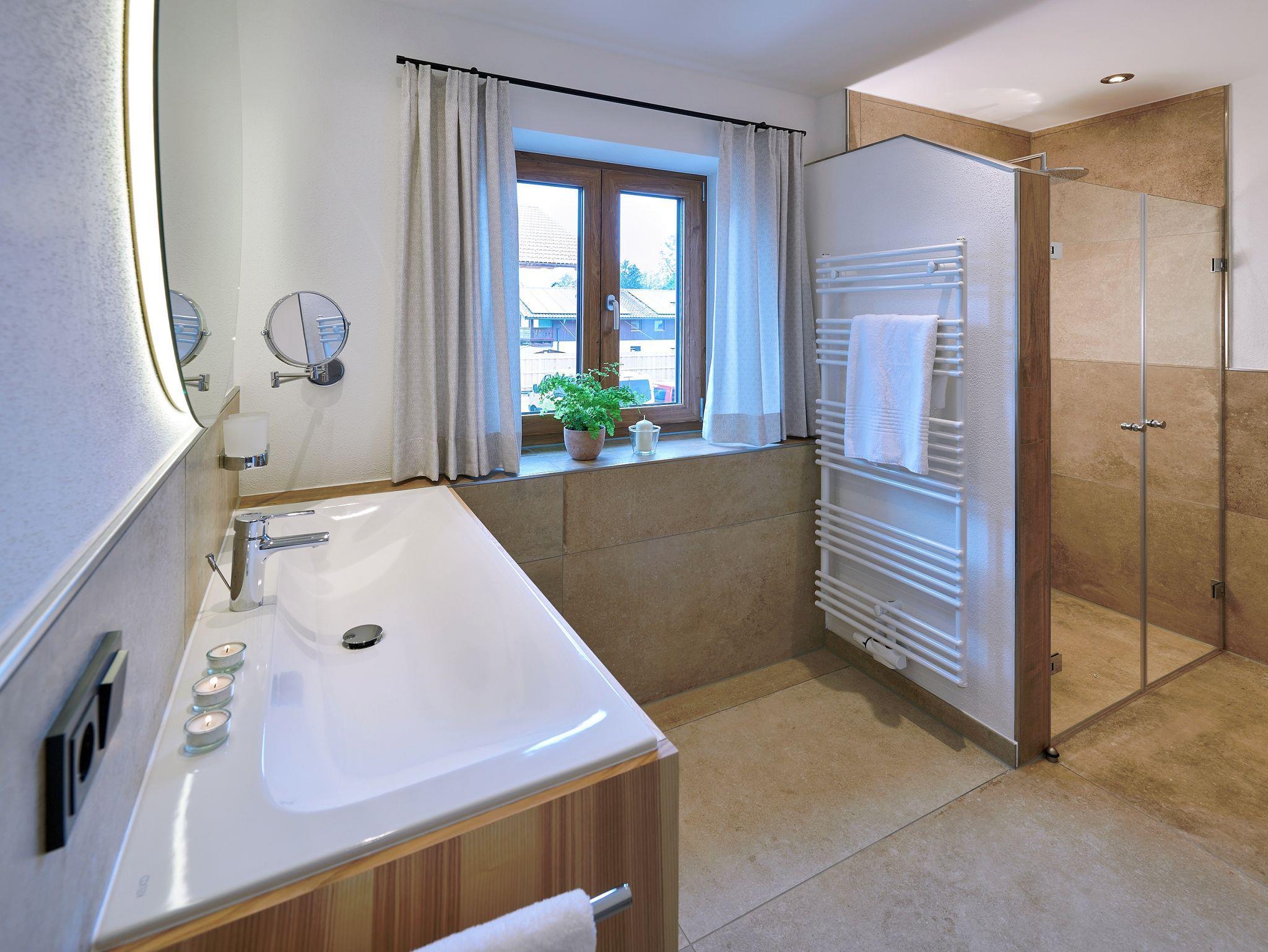 • Badezimmer mit begehbarer bodengleicher Regendusche, WC, Föhn, beheizbarem Handtuchtrockner und Schminkspiegel