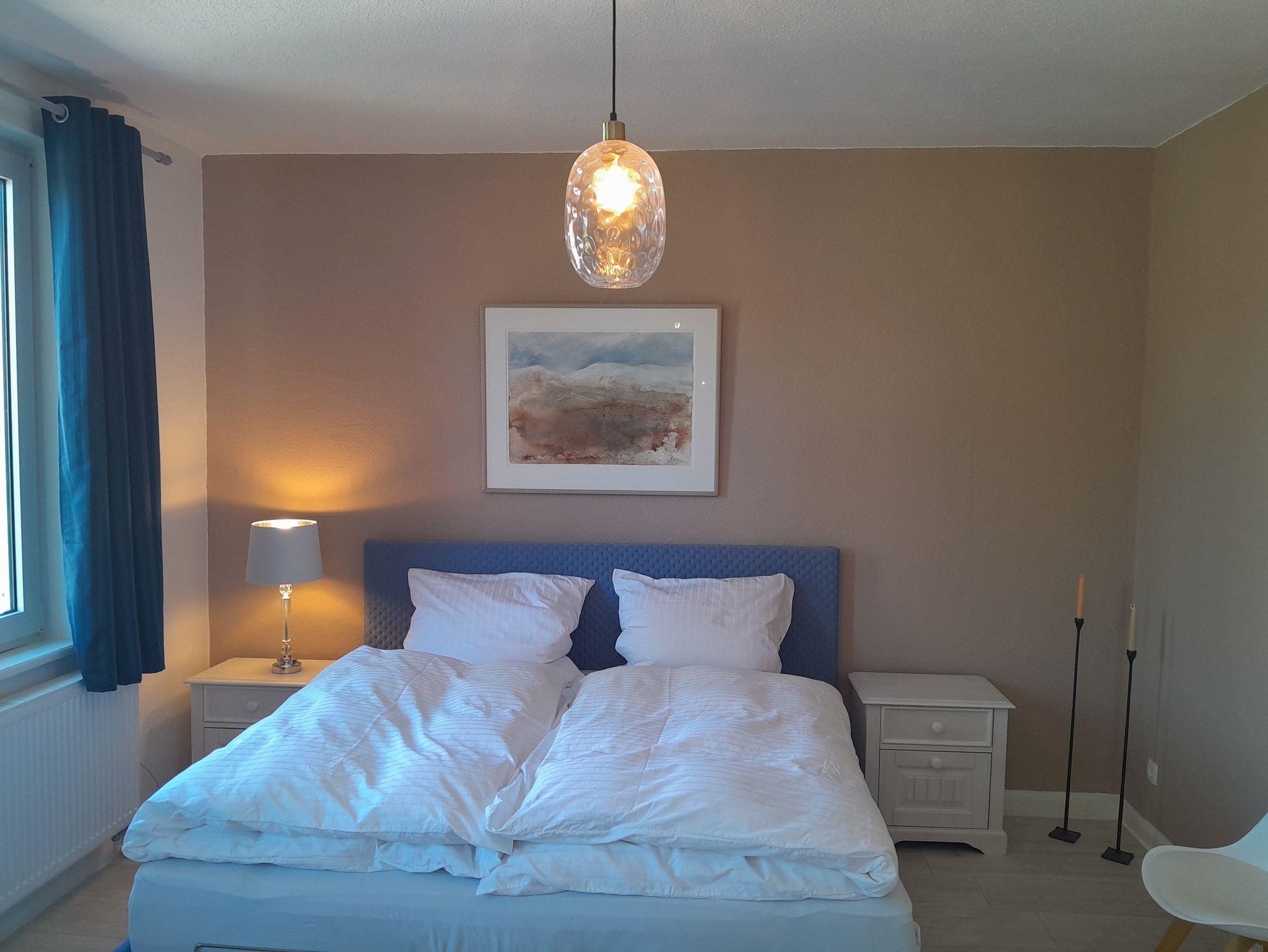 Das Hauptschlafzimmer, mit einem Doppelbett, hat direkte Anbindung an das Badezimmer. Das zweite Schlafzimmer hat zwei Einzelbetten. Der Weg von diesem Zimmer zum Badezimmer führt durch das Hauptschlafzimmer. Bedingt durch diese Besonderheit, sind die Ferienwohnungen für Familien oder Personen geeignet, die sich gut kennen. Eines der Schlafzimmer hat eine gemütliche Sitzecke mit TV-Gerät.