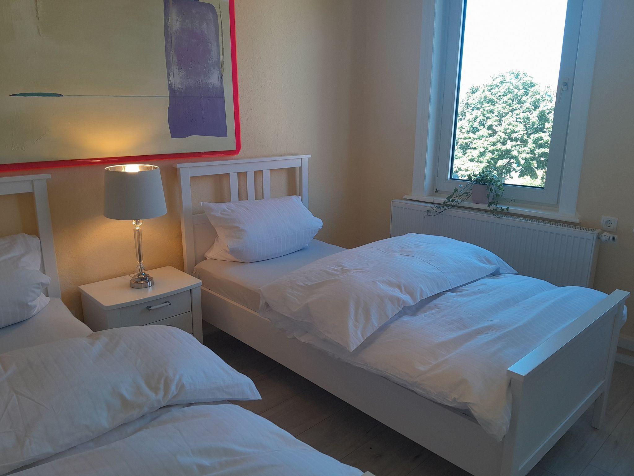 Das Hauptschlafzimmer, mit einem Doppelbett in der Größe von 180x200 cm, hat direkte Anbindung an das Badezimmer. Das zweite Schlafzimmer hat zwei Einzelbetten von einer Größe von 100x200 cm . Der Weg von diesem Zimmer zum Badezimmer führt durch das Hauptschlafzimmer. Bedingt durch diese Besonderheit, sind die Ferienwohnungen für Familien oder Personen geeignet, die sich gut kennen. Beide Schlafzimmer haben eine gemütliche Sitzecke mit TV-Gerät.