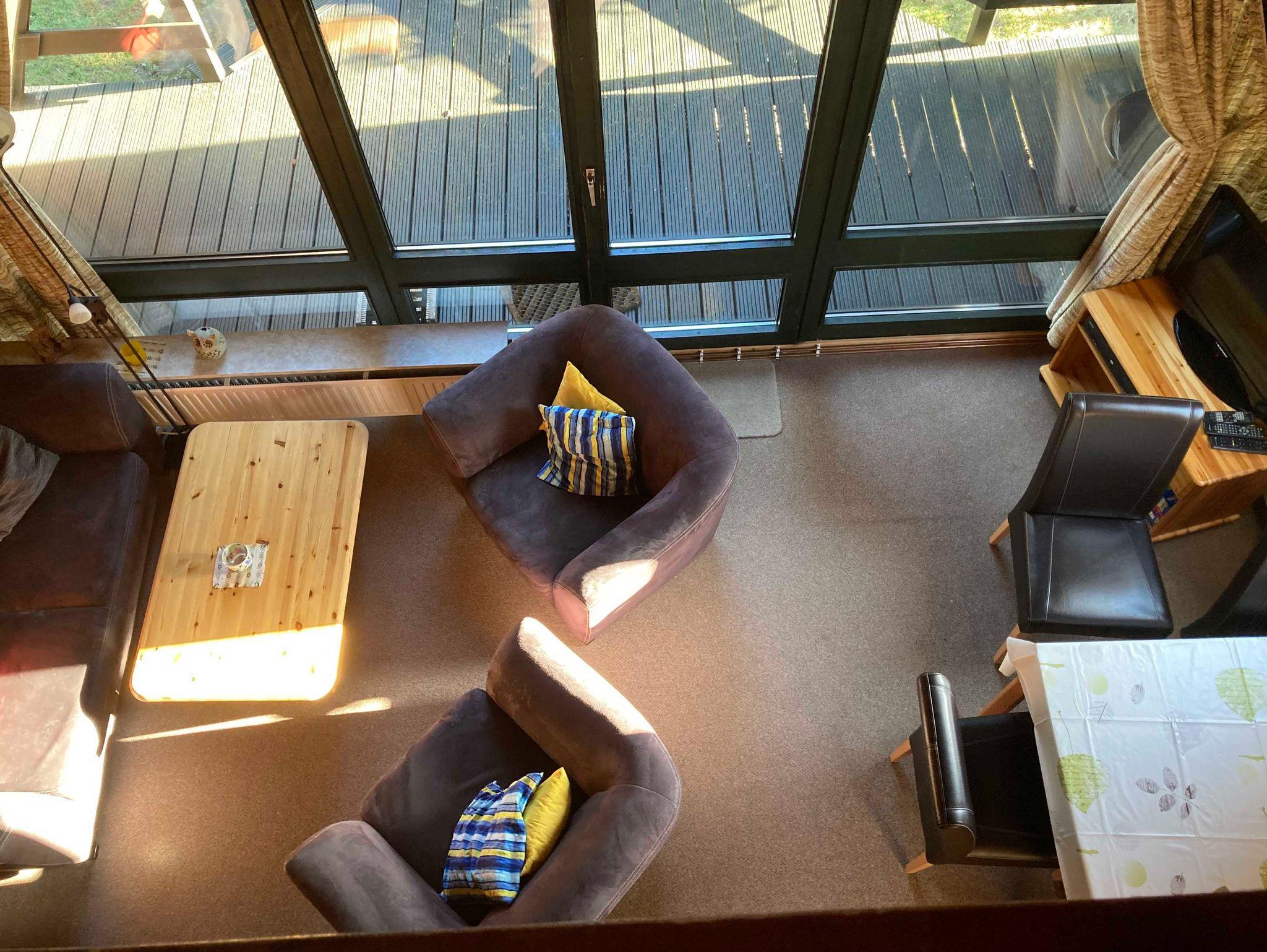 3 Schlafzimmer (2 Doppel, 1 Einzel), Küche mit Durchreiche zum Wohnzimmer, Wohnzimmer mit Essecke, Terrasse, Bad mit WC und Badewanne oder Dusche, Diele mit Kleiderschrank, Kabel- oder Sat-TV und Radio. Das Nurdachhaus strahlt eine gediegene Atmosphäre aus. Wohn- und Schlafräume erstrecken sich über zwei Etagen. Die Konstruktion hat sich bewährt. Ihre besonderen Merkmale sind schräge Wände, optimale Raumausnutzung und ein anheimelndes Raumklima. Zwischen Wohnbereich und Küche befindet sich eine Durchreiche, so kommt das Essen zu den Mahlzeiten direkt vom Herd auf den Tisch. Über eine platzsparende Treppe erreichen Sie die obere Etage.