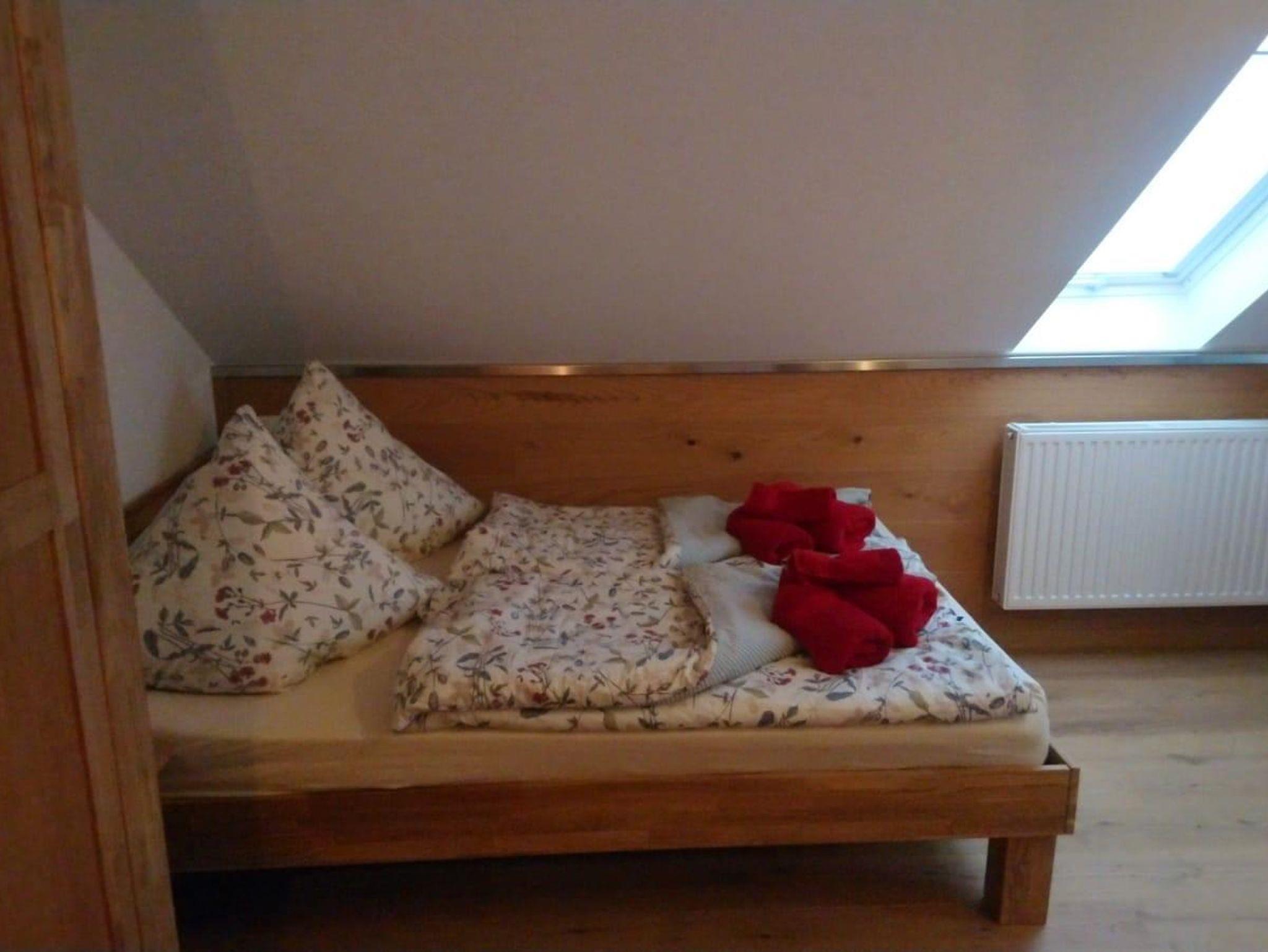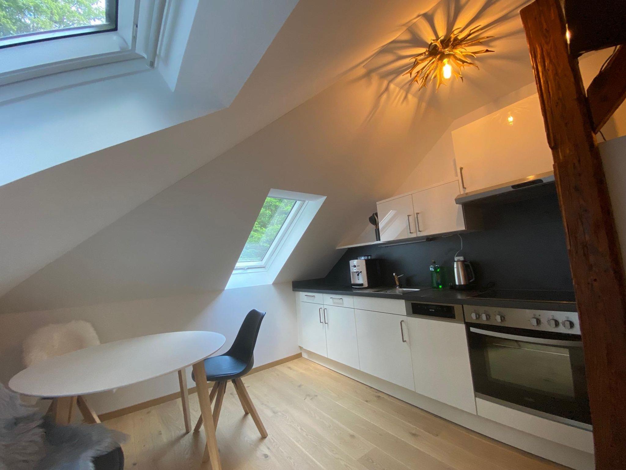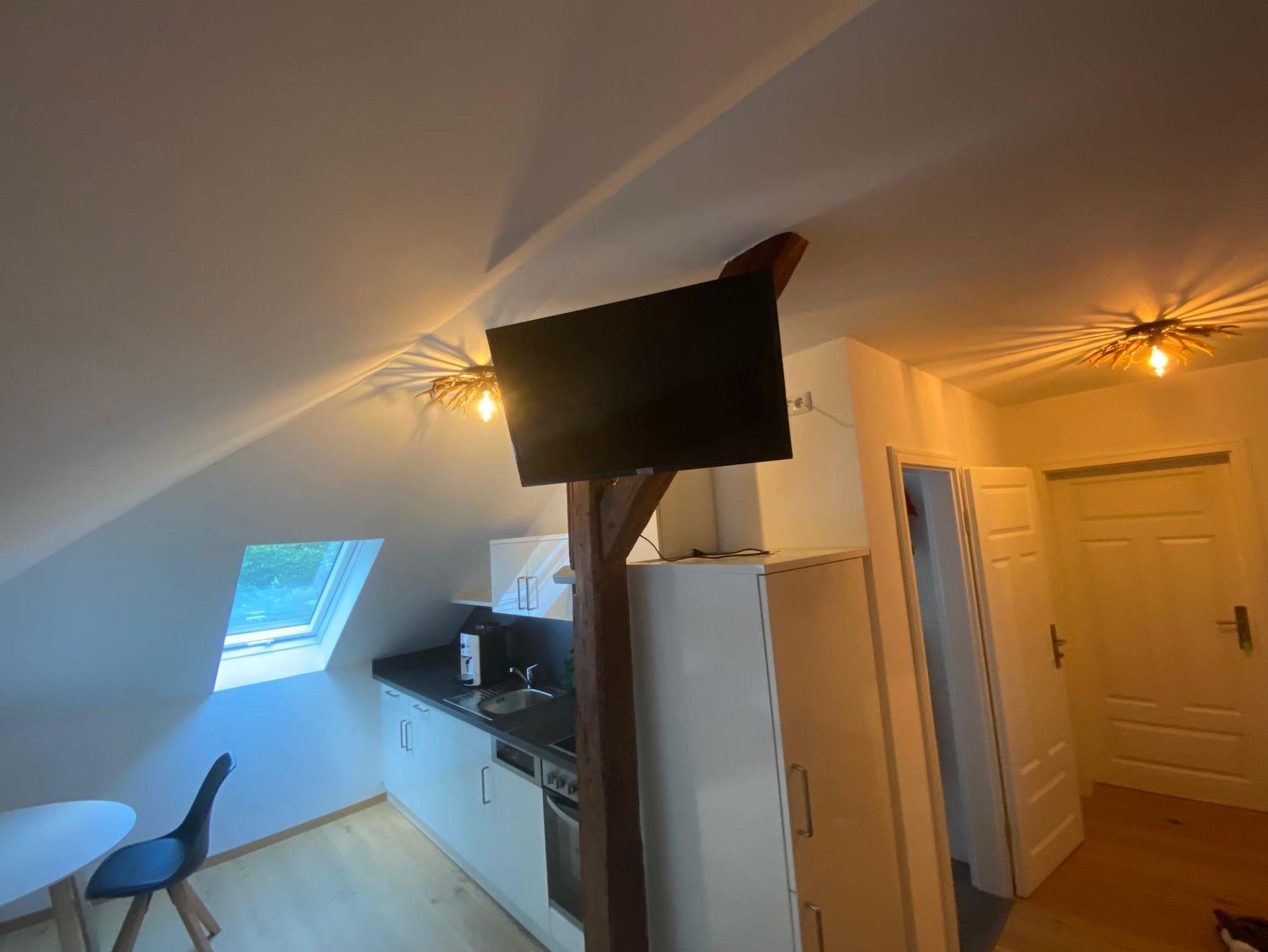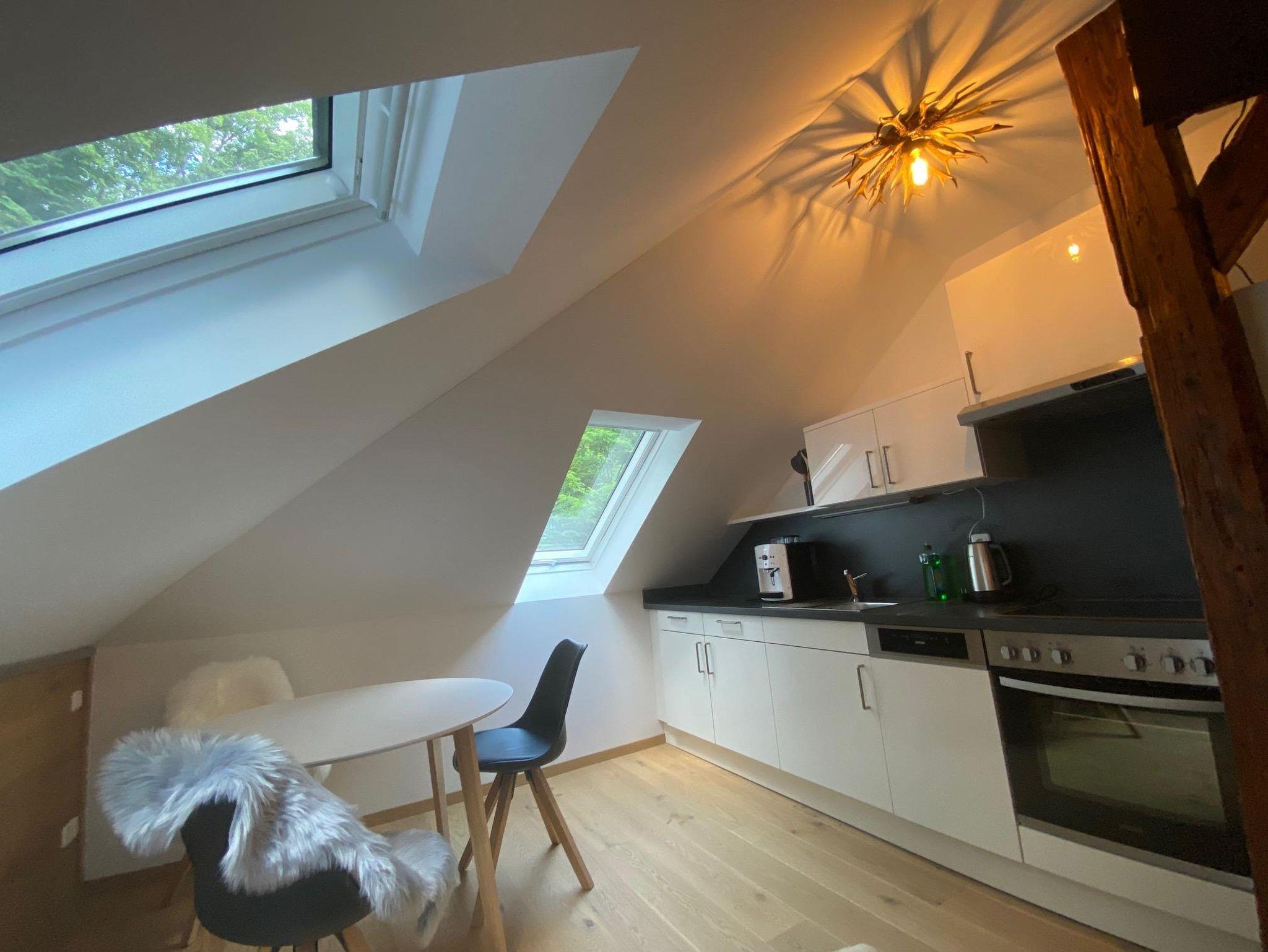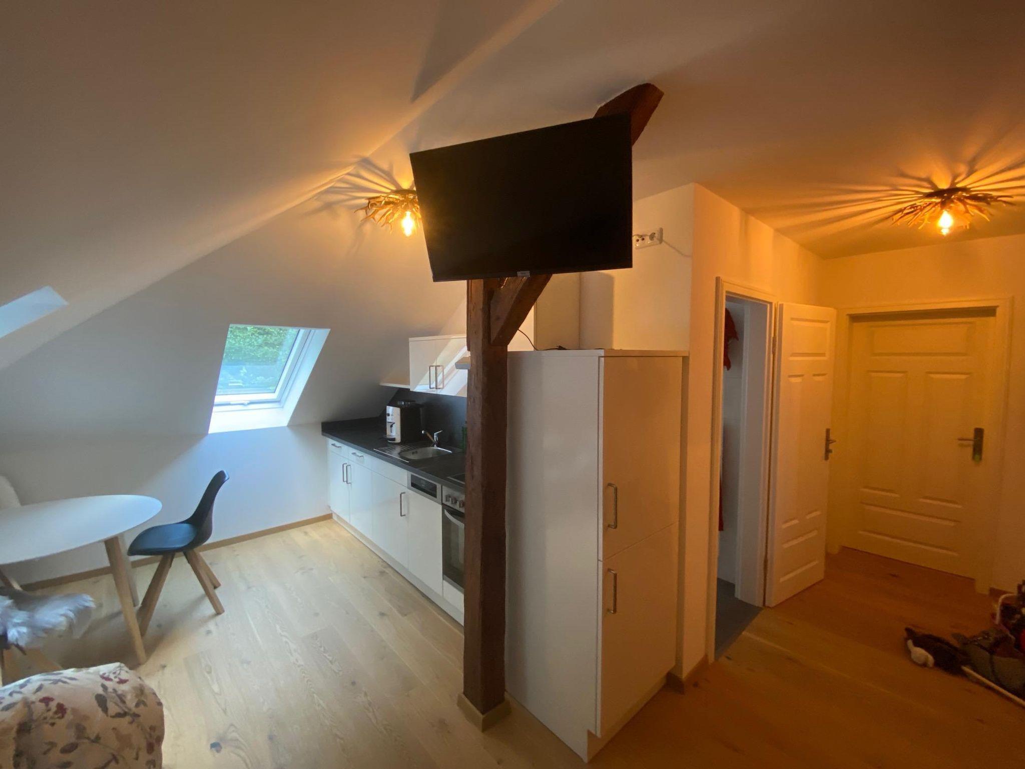 Im Dachgeschoss auf der rechten Seite erwartet Sie Ihr gemütliches Reich. Sie schlafen in 2 getrennten Räumen mit zwei 90x200cm Betten und einem Ehebett 180x200cm in einem Zimmer und im zweiten Zimmer bieten wir Ihnen ein 140x200cm Doppelbett, eine eine gut ausgestattete Küchenzeile, sowie eine gemütliche Sitzecke und einen TV dort integriert. Ein Glas Wein am Abend, ein Kaffee vor dem Start in den Tag ist jederzeit für Sie möglich. Sollten Sie ein Frühstück dazu buchen, können Sie dies hier in Ihrem eigenen Reich gerne in aller Ruhe genießen. Im Tageslicht-Bad mit Dusche können Sie mit Blick in den Himmel und die Baumkronen entspannen.