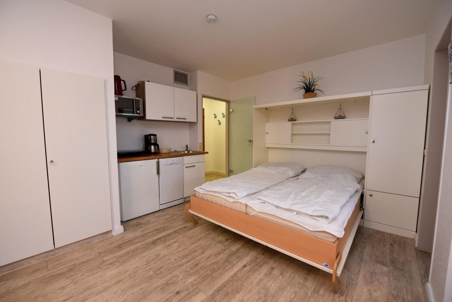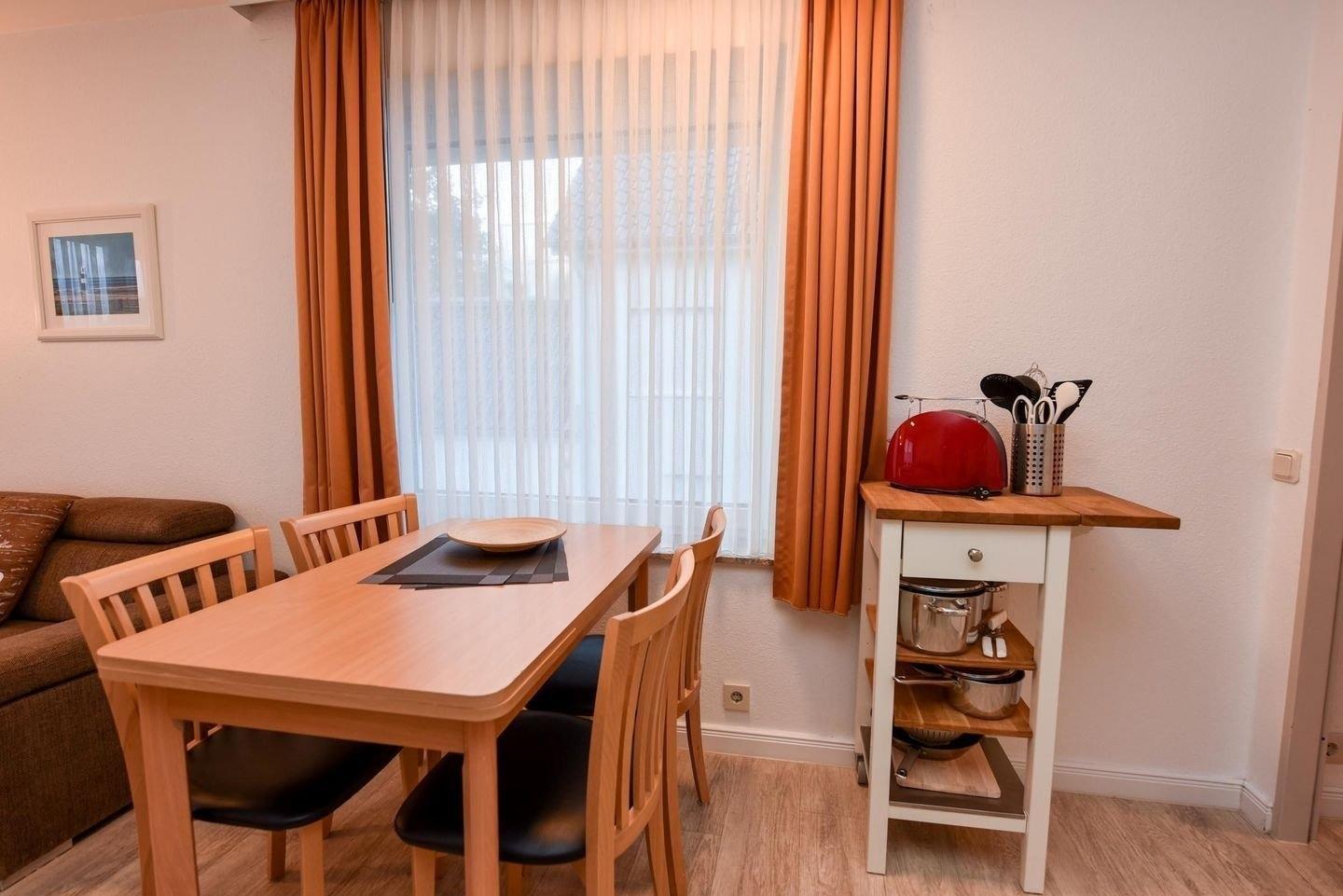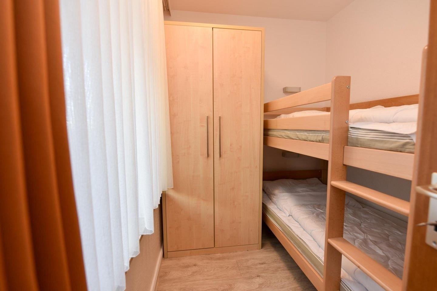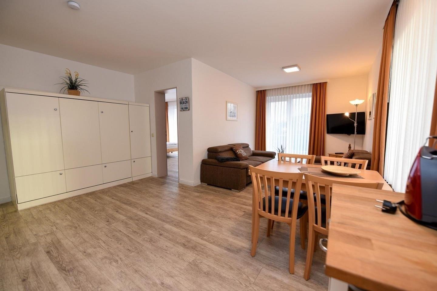 3-Zimmer Appartement im Haus "Nige Wark", bestehend aus einem Kinderzimmer mit Etagenbett, einem Schlafzimmer mit Doppelbett und einem Wohnzimmer in welchen sich zusätzlich noch ein Schrankbett befindet (2x90x200). Im Wohnraum befinden sich zudem in der Fernsehecke 2 gemütliche Zweisitzer, ein Flat- TV. Die im Wohnraum integrierte Küchenzeile bietet u.a. Spülmaschine, Mikrowelle und Kühlschrank mit Gefrierfach. Am ausziehbare Esstisch gibt es genügend Platz für die ganze Familie. Badezimmer mit tiefer Dusche und WC. Größe ca. 50qm. Die Wohnung liegt im Hochparterre und hat einen großen Südbalkon zum Garten.