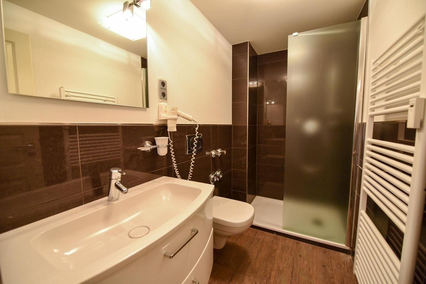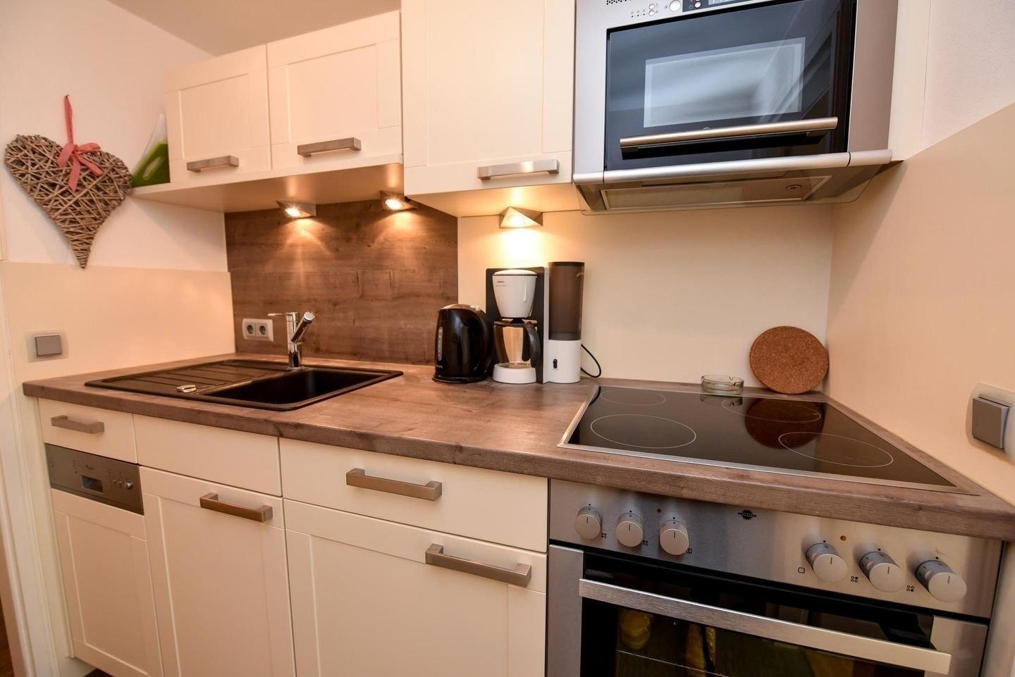 Von der separaten Küche, die mit einem Kühlschrank, einem Backofen mit Ceranfeld, einem Geschirrspüler, einer Mikrowelle sowie einer Kaffeemaschine, einem Toaster und einem Wasserkocher ausgestattet ist, gelangen Sie sowohl zum modernen Duschbad als auch in den Wohnbereich.