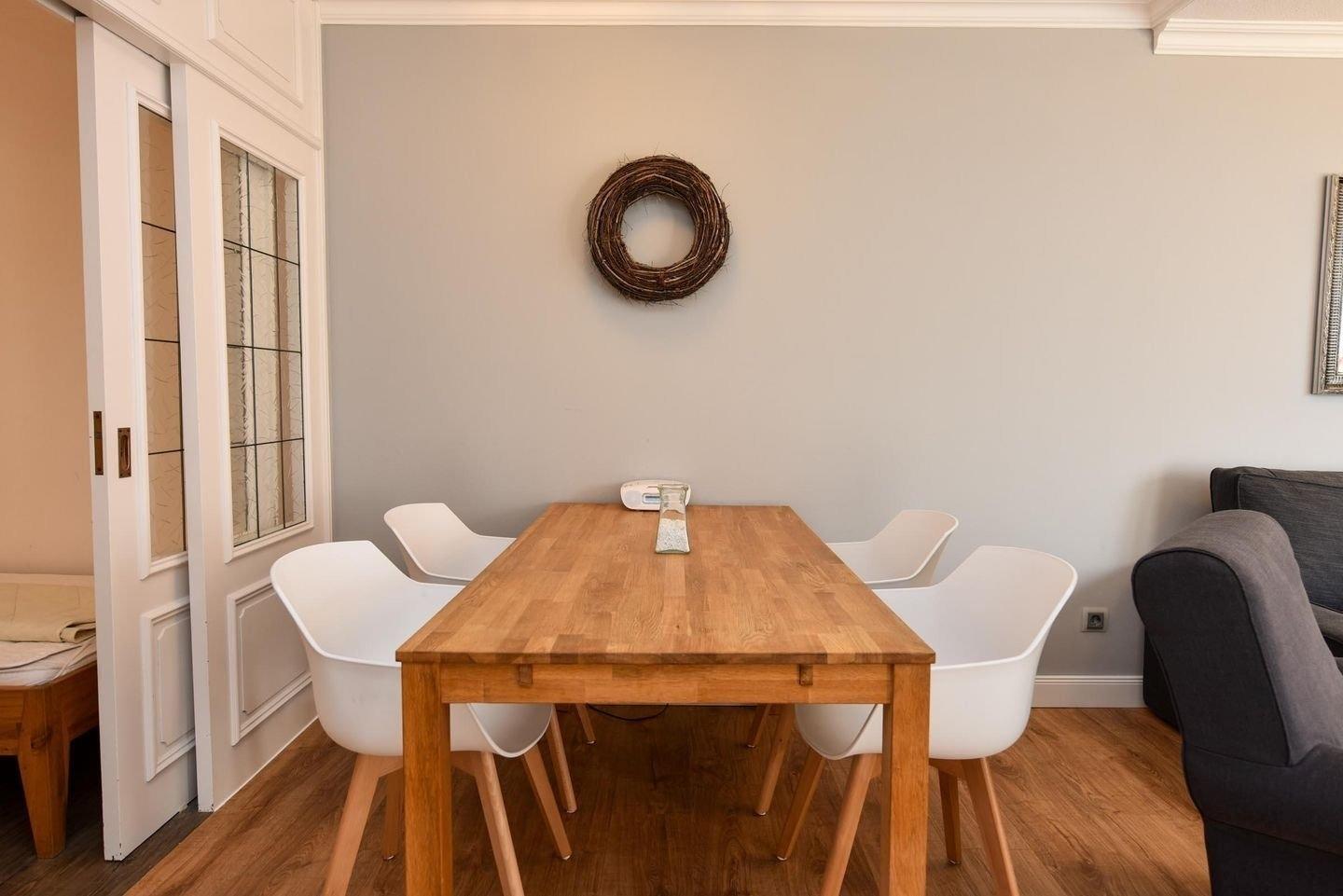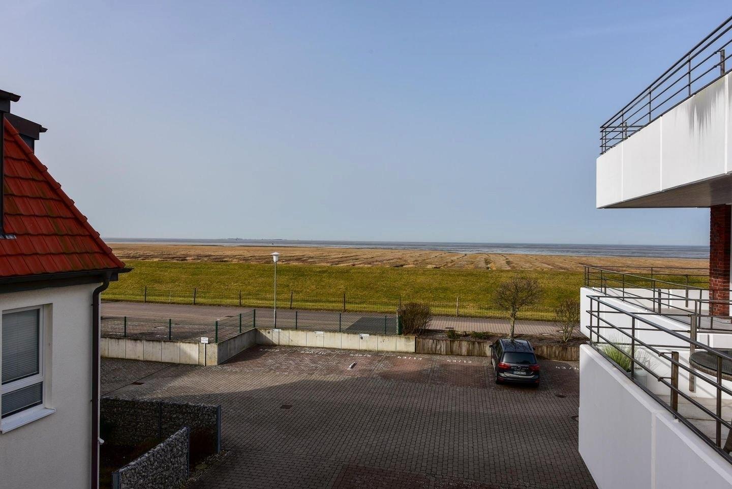 Der Wohnbereich ist mit einer Essecke, einer Couch mit Sessel, TV und WLAN. Vom Wohnbereich haben Sie Zugang zum Balkon, von dem Sie einen tollen Ausblick auf das Wattenmeer, das Vogelschutzgebiet und die Insel Neuwerk genießen.