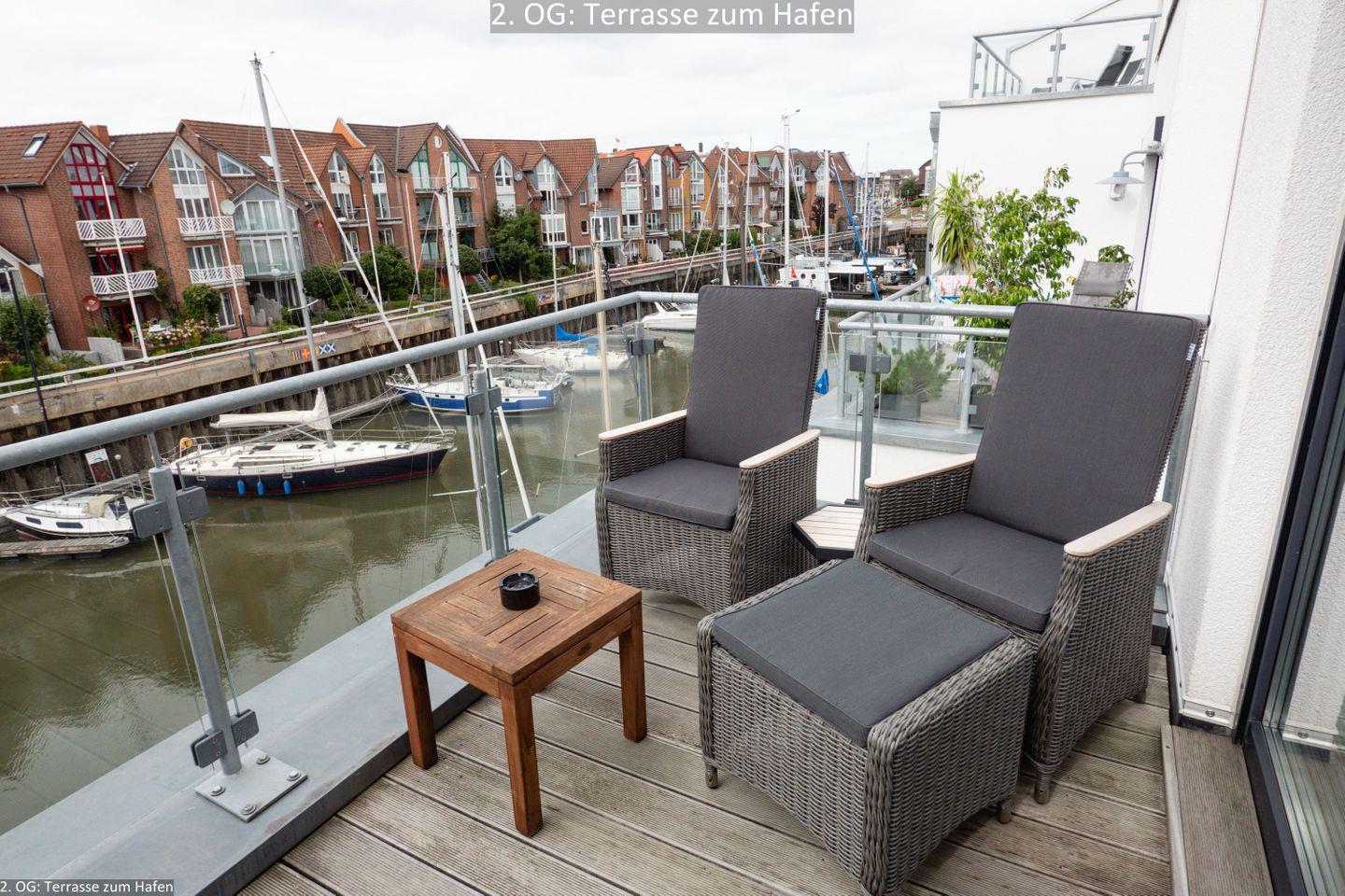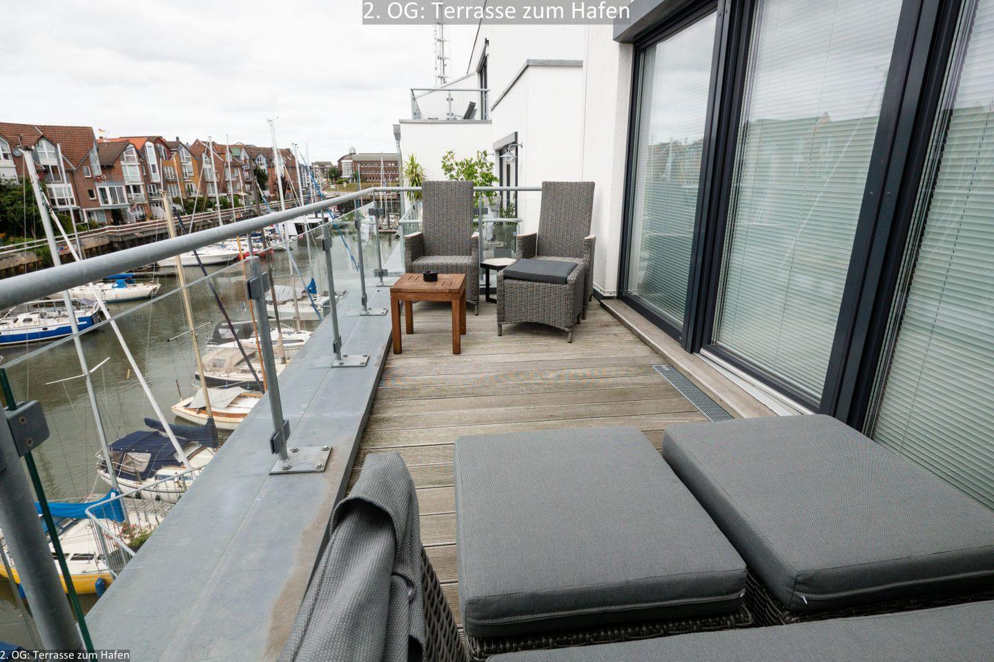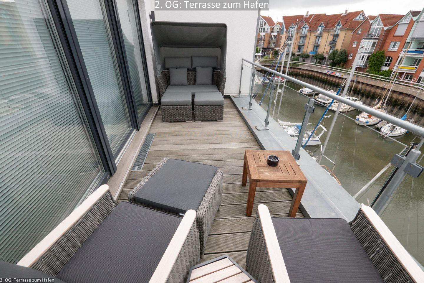 Über den Wohnbereich im Erdgeschoss gelangen die Urlaubsgäste auf die Terrasse, die mit einem großen Holztisch (220/160x90) mit sechs Stühlen sowie einem Hocker bestückt ist. Auf der Dachterrasse im 2. Obergeschoss können es sich die Urlaubsgäste auf gemütlichen und variabel einsetzbaren Lounge-Möbeln gemütlich machen. Sowohl von der Terrasse im Erdgeschoss als auch von der Dachterrasse haben Sie einen wunderschönen Blick in die Marina. Die weitere kleinere Terrasse zur gegenüberliegenden Hafenseite ist mit 2 Stühlen und einem kleinen Tisch ausgestattet und bietet sich z.B. für ein kleines Frühstück an.