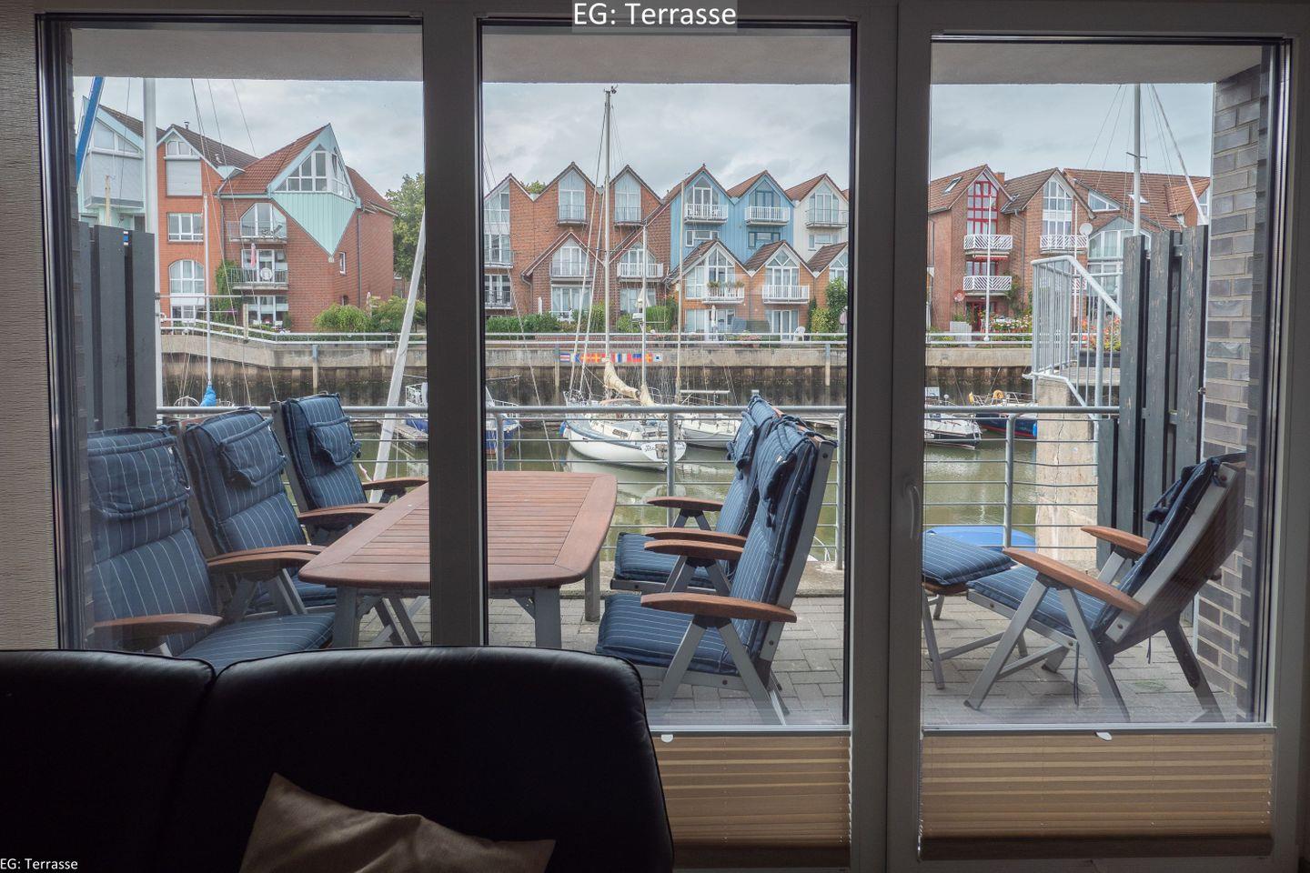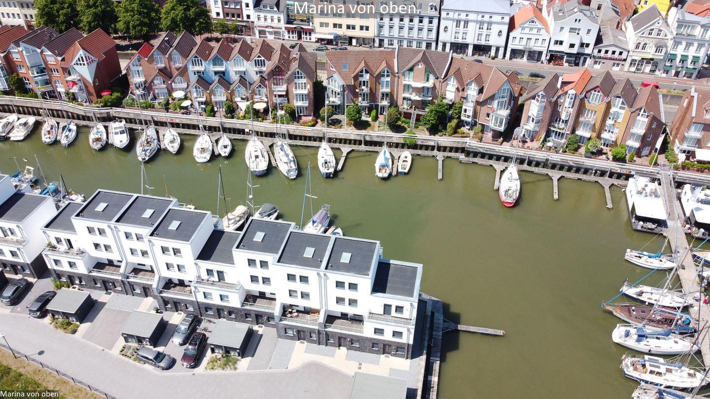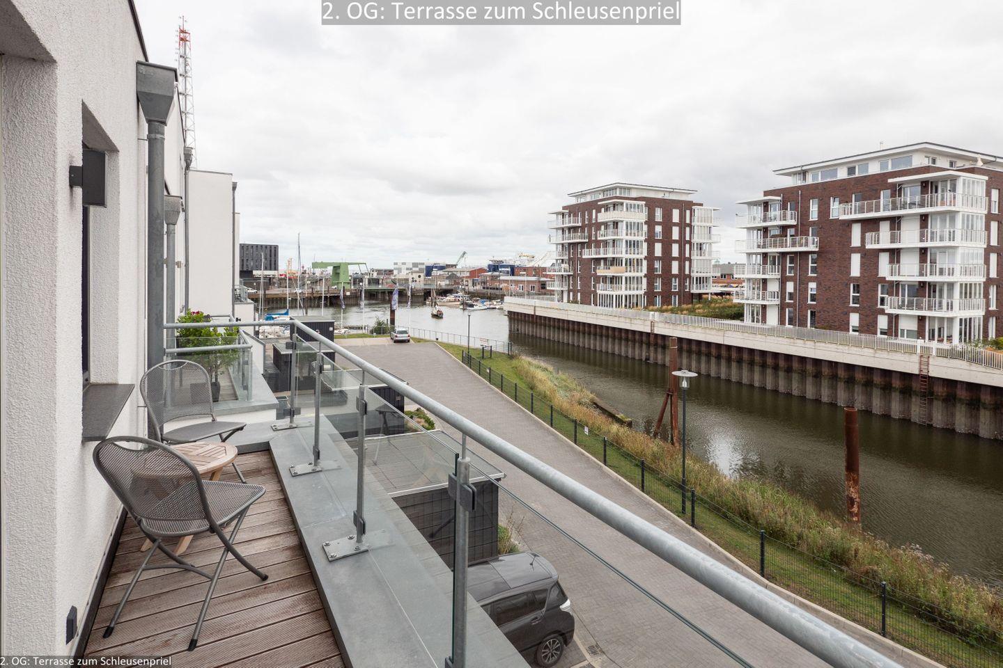 Über den Wohnbereich im Erdgeschoss gelangen die Urlaubsgäste auf die Terrasse, die mit einem großen Holztisch (220/160x90) mit sechs Stühlen sowie einem Hocker bestückt ist. Auf der Dachterrasse im 2. Obergeschoss können es sich die Urlaubsgäste auf gemütlichen und variabel einsetzbaren Lounge-Möbeln gemütlich machen. Sowohl von der Terrasse im Erdgeschoss als auch von der Dachterrasse haben Sie einen wunderschönen Blick in die Marina. Die weitere kleinere Terrasse zur gegenüberliegenden Hafenseite ist mit 2 Stühlen und einem kleinen Tisch ausgestattet und bietet sich z.B. für ein kleines Frühstück an.