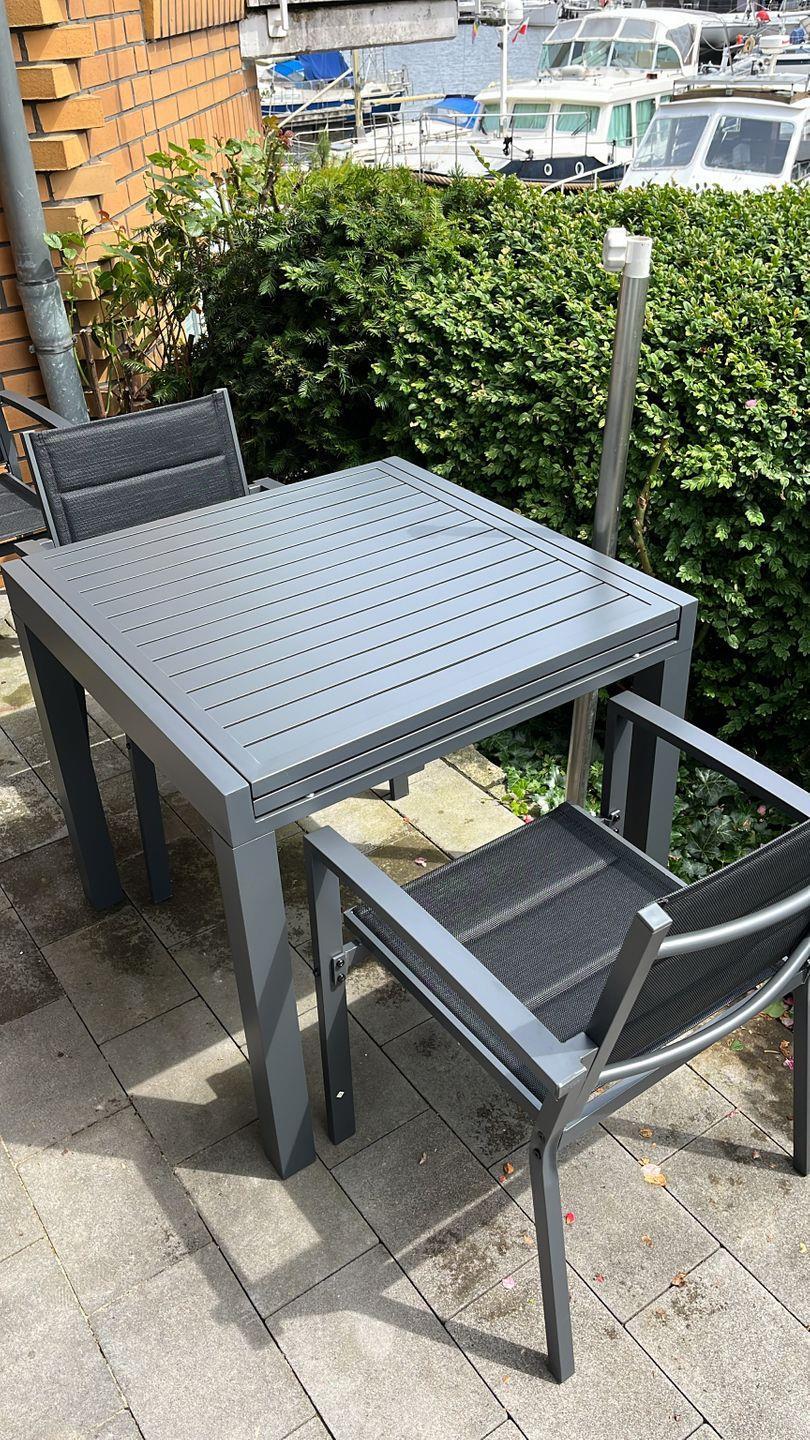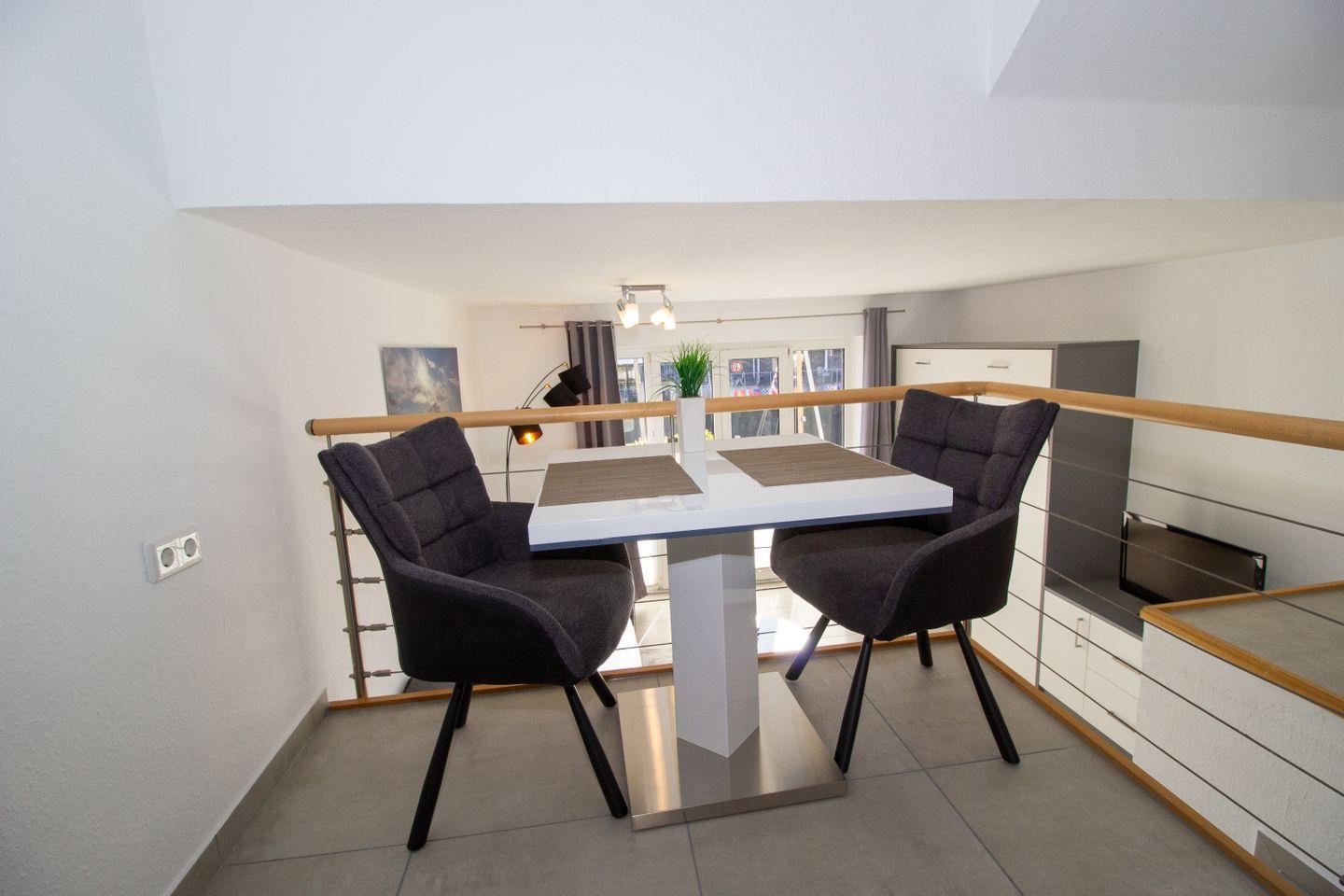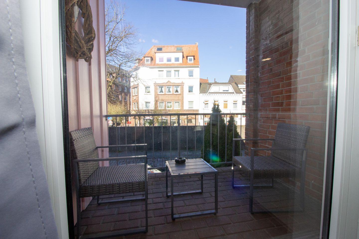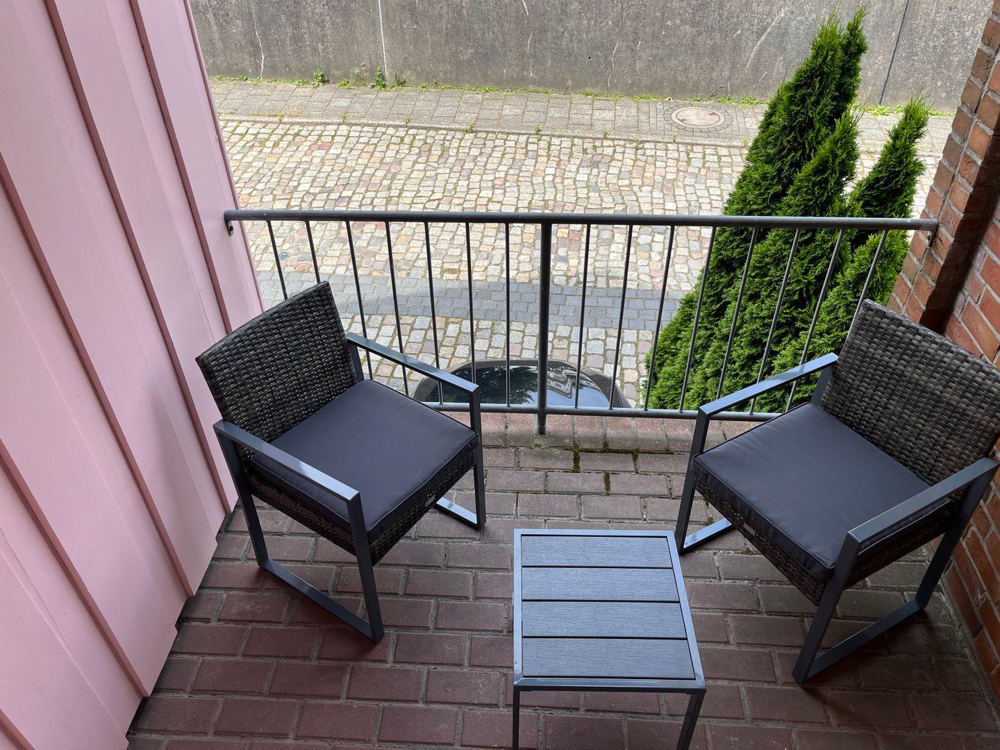 Auf der Terrasse können sich unsere Gäste auf zwei Hochlehnstühlen zurücklehnen und den Ausblick auf den Yachthafen genießen. Zudem gelangt man über den Kochbereich auf einen Balkon, der ebenfalls mit gemütlichen Balkonmöbeln bestückt ist.