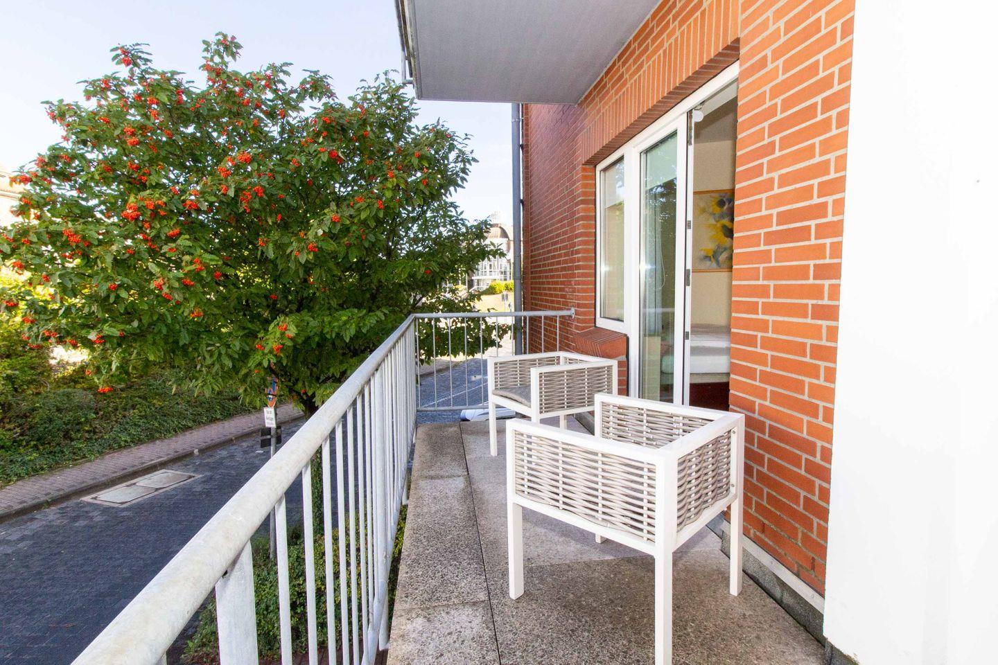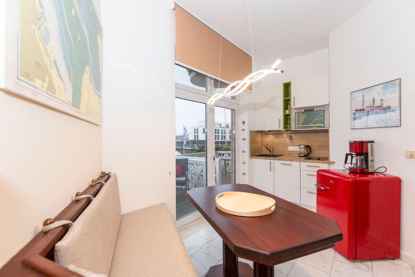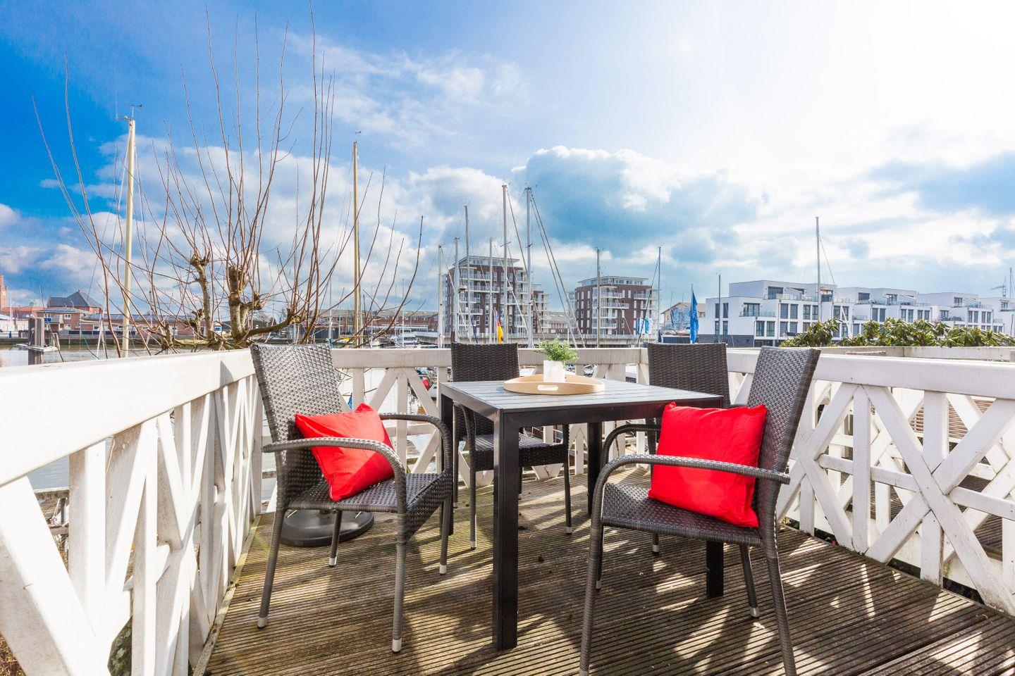 Ob mit dem Morgenkaffee, Nachmittags mit einem Stückchen Kuchen oder Abends bei einem kühlen Gläschen Wein, der Balkon mit dem Blick in den Yachthafen lädt immer zum Verweilen ein.