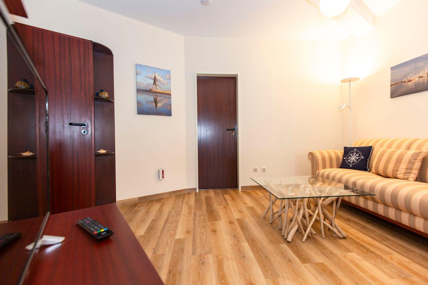 Haus "Marina", Typ B, Whg.Nr. 94, bis 2 Pers., Hochparterre links, Lage am Yachthafen, ca. 45 qm Größe, Wohn-/Essbereich, sep. Schlafzimmer mit Doppelbett (Matratze dreiteilig), Dusche/WC, Küchenzeile mit Geschirrspüler, Mikrowelle, 2-Platten-Herd, Kabel-TV, WLAN-Router, Balkon, Haustier sind erlaubt, Nichtraucherwohnung.