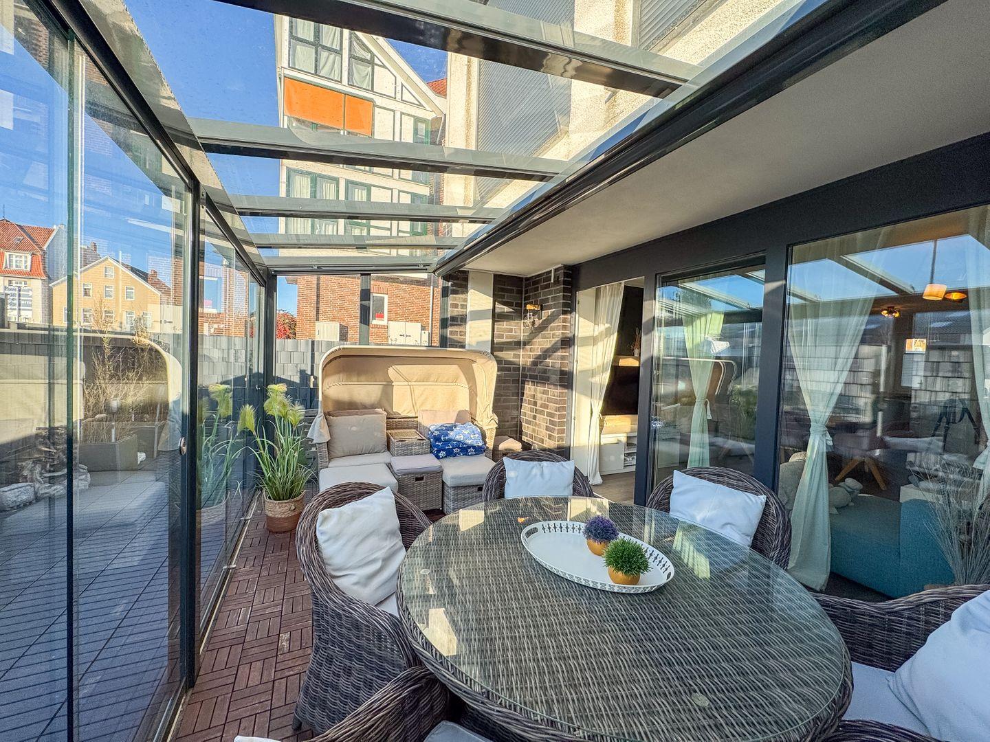 Im 2. OG befinden sich zusätzliche ein gemütlicher Nordbalkon und eine verglaste Loggia Richtung Süden, ausgestattet mit Liegen und einem Kicker zur Entspannung und Unterhaltung.