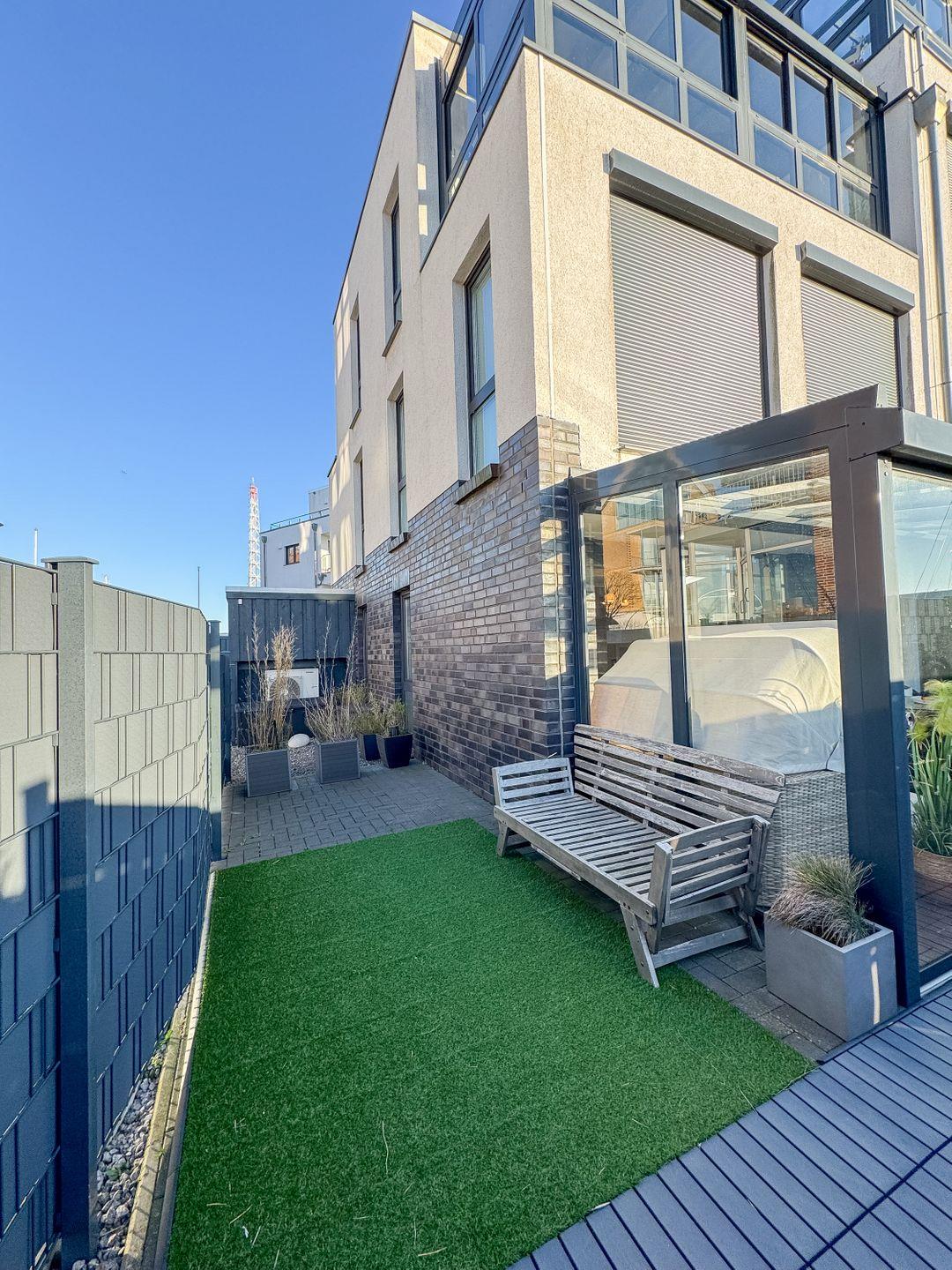 Ein besonderes Highlight ist der lichtdurchflutete Wintergarten, der das Haus zu jeder Jahreszeit mit natürlichem Licht versorgt und einen geschützten Rückzugsort bietet– ob beim Frühstück oder bei entspannten Abenden im Sonnenuntergang. Die angrenzende Terrasse läd zum Verweilen im Freien ein, wobei der Sichtschutz für die notwendige Privatsphäre sorgt.