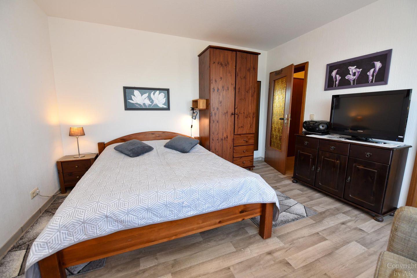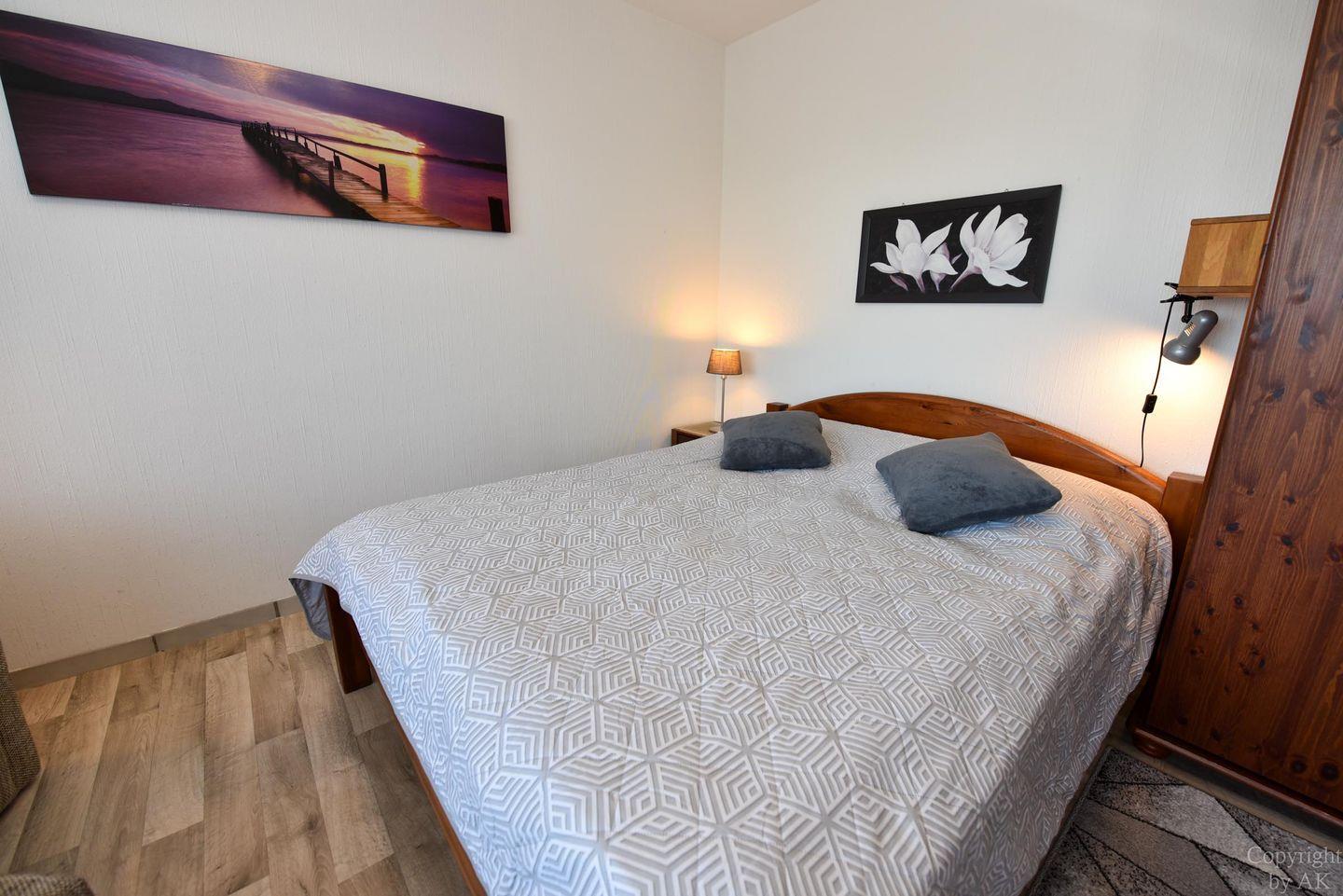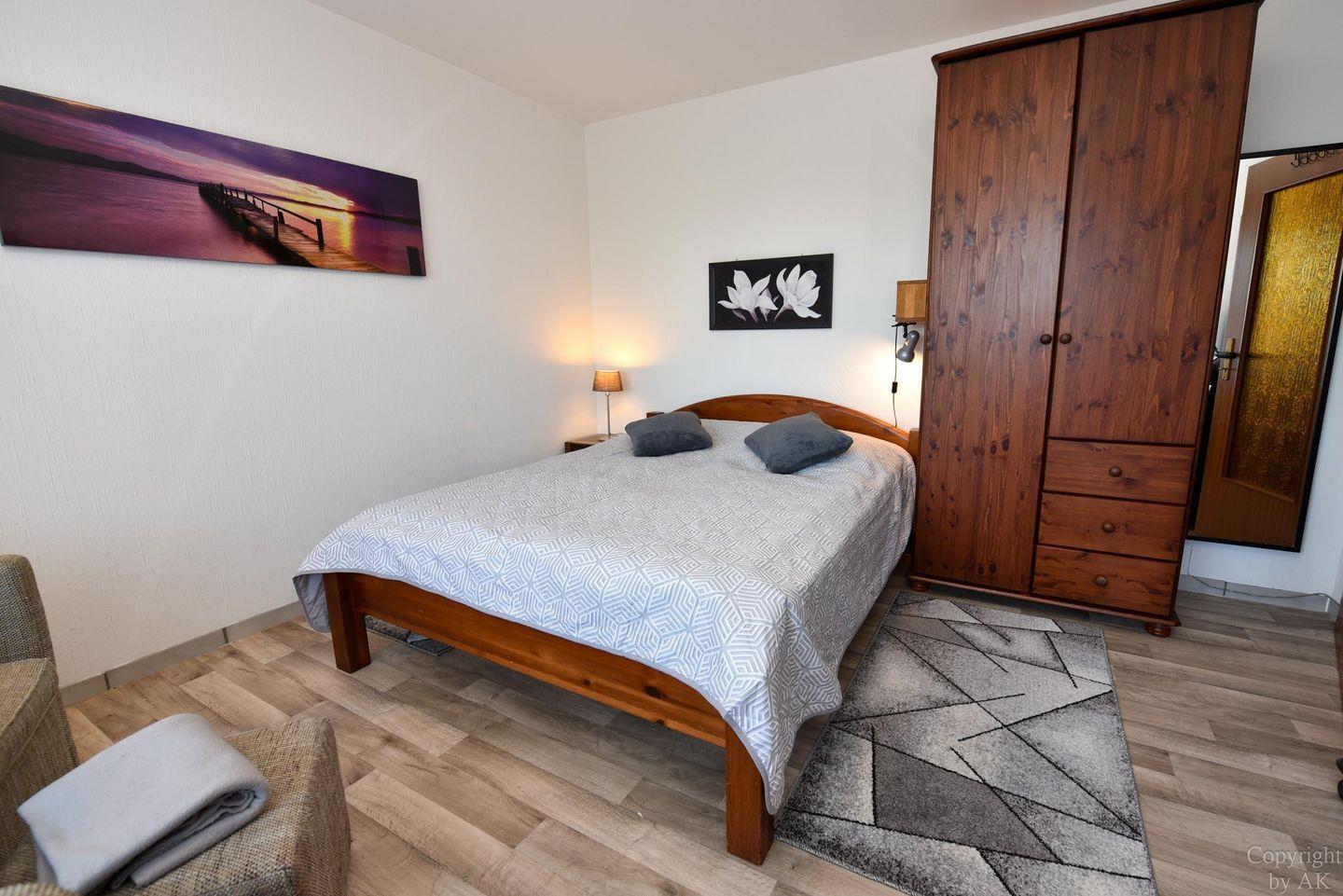 1-Zimmer-Ferienwohnung im 2. OG des Hauses LEE mit WLAN für 2 Pers. 1 Wohn-/Schlafraum mit Ehebett, 2 Sessel, 1 Hocker und 1 Kleiderschrank. W-LAN, Großer TV-Flachbildschirm, DVD-Player, CD-Player mit USB Anschluss. Separater Küchenraum, Einbauküche mit Mikrowelle, Backofen, Geschirrspüler und Tisch mit 4 Stühlen. Duschbad/WC und kleiner Abstellraum. Möblierter Balkon, Spielrasen, Spielgerät und Sandkiste auf dem Grundstück, PKW-Stellplatz. Schwimmbadnutzung kostenfrei!