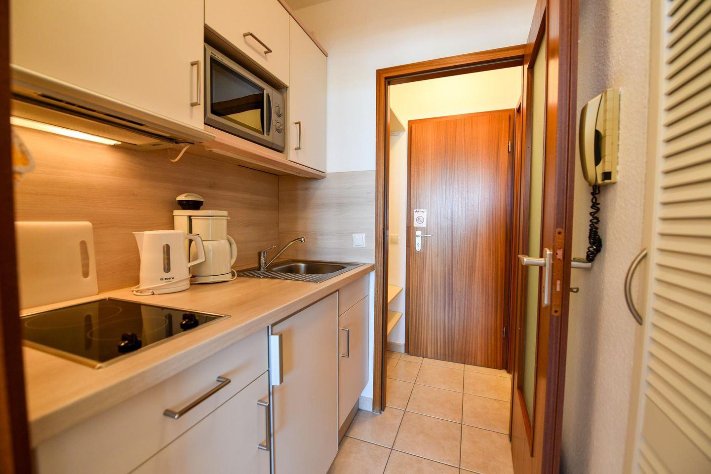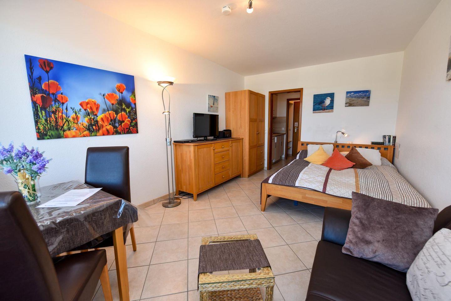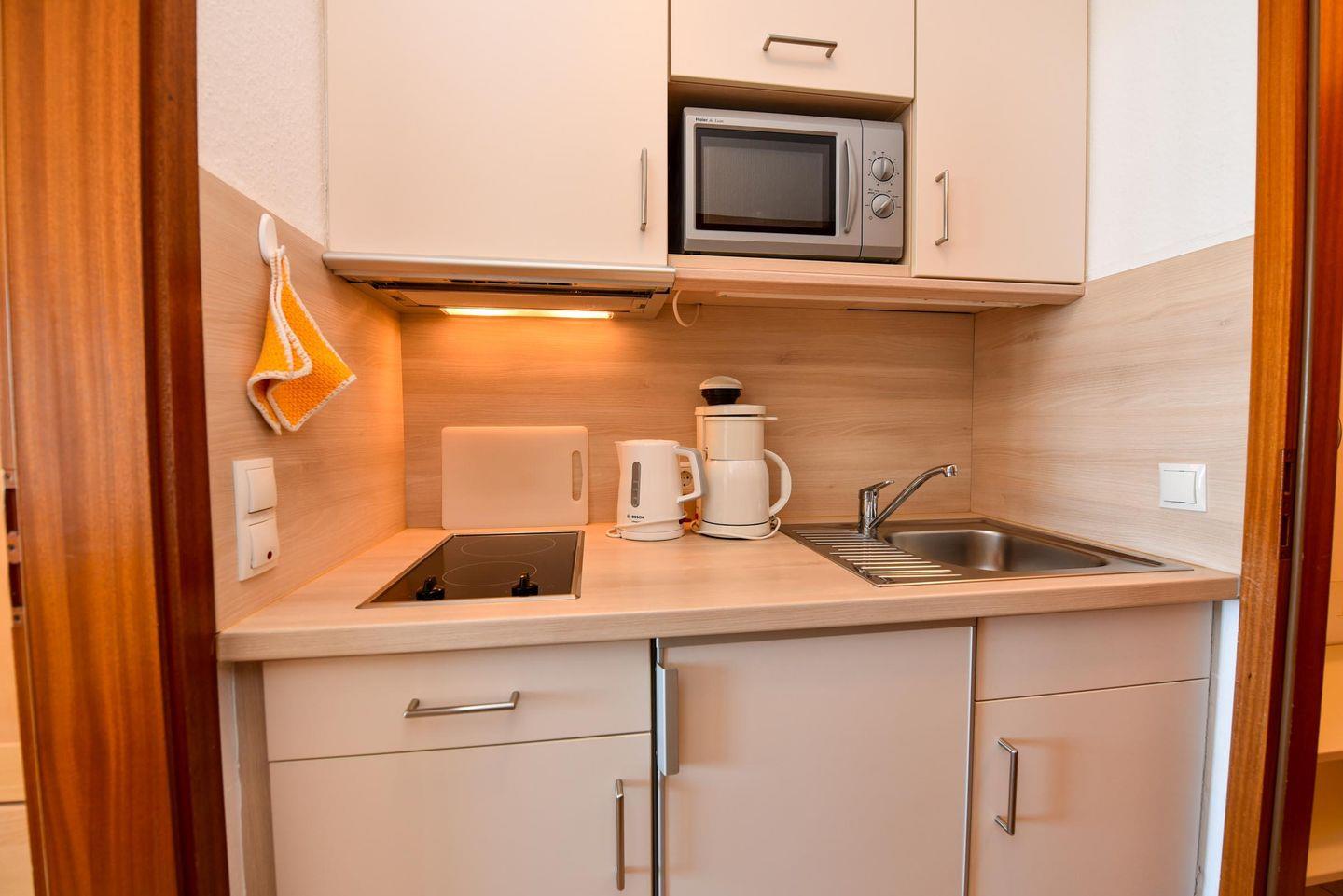 In der gut ausgestatteten Küchennische finden Sie eine Mikrowelle und einen 2-Plattenherd, sodass Sie sich schnell und einfach eine warme Mahlzeit zubereiten können. Das Duschbad mit WC rundet den Komfort des Appartements ab. Ein Kabel-Flachbild-TV sorgt für Unterhaltung am Abend.