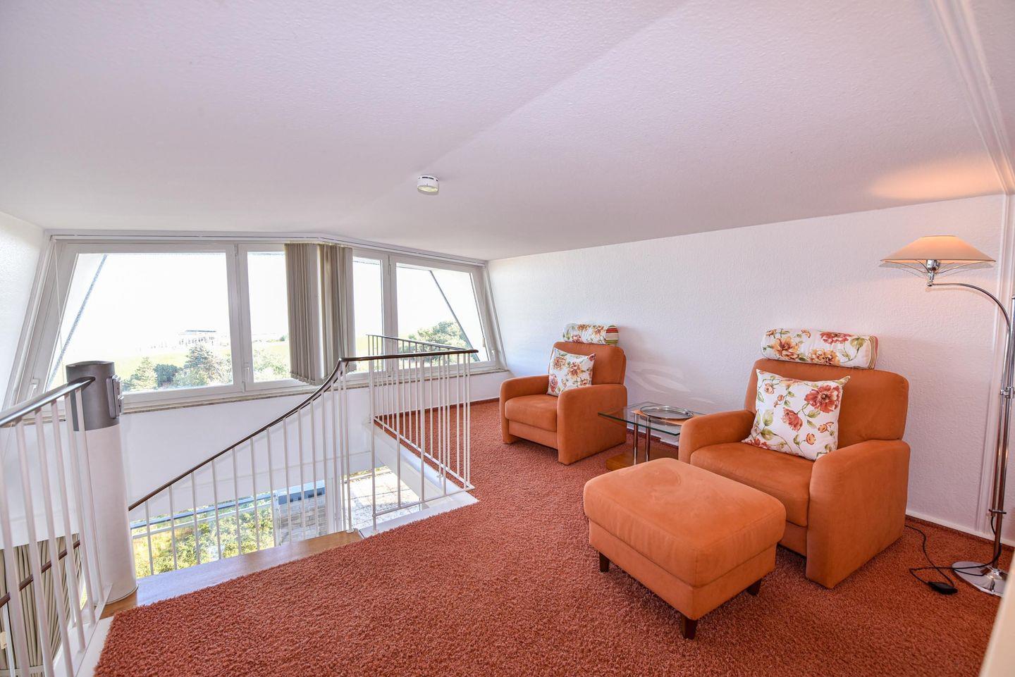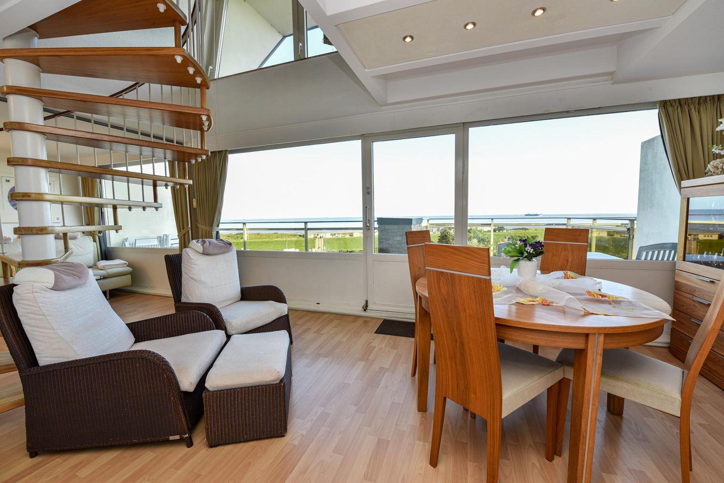 2 Zimmer Penthouse-Wohnung im 5. OG mit großer Dachterasse und Panorama-Seesicht. Vom Ess- und Wohnraum, sowie von der Empore, schauen Sie auf den Weltschifffahrtsweg und das UNESCO Weltnaturerbe Wattenmeer. Der Wohnraum, trennbar mit Schlafcouch, ist u.a. mit gemütlichen Sesseln uns einem Esstisch für 4 Personen ausgestattet. Es gibt eine komfortable Küchenzeile mit Mikrowelle und Kühlschrank*** . Auf der Schlafempore, welche Kopfhöhe 165 bis 175 cm hat, befinden sich zwei großzügige Betten (120cm x 200cm). Das helle Badezimmer verfügt über eine Badewanne und eine Dusche, sowie 2 Waschbecken. Der zu dieser Wohnung gehörende Tiefgaragenstellplatz hat eine Einstellhöhe 190cm
