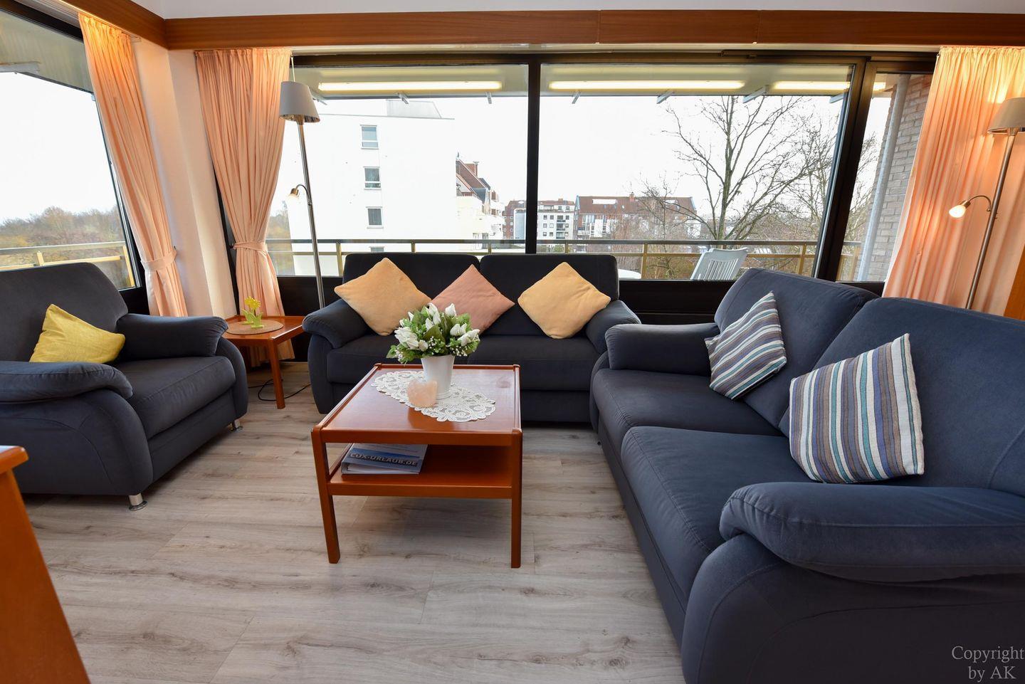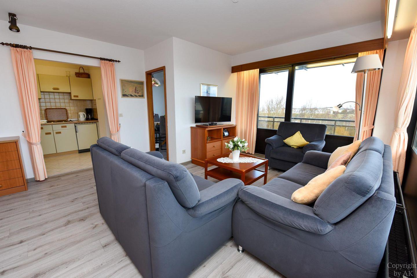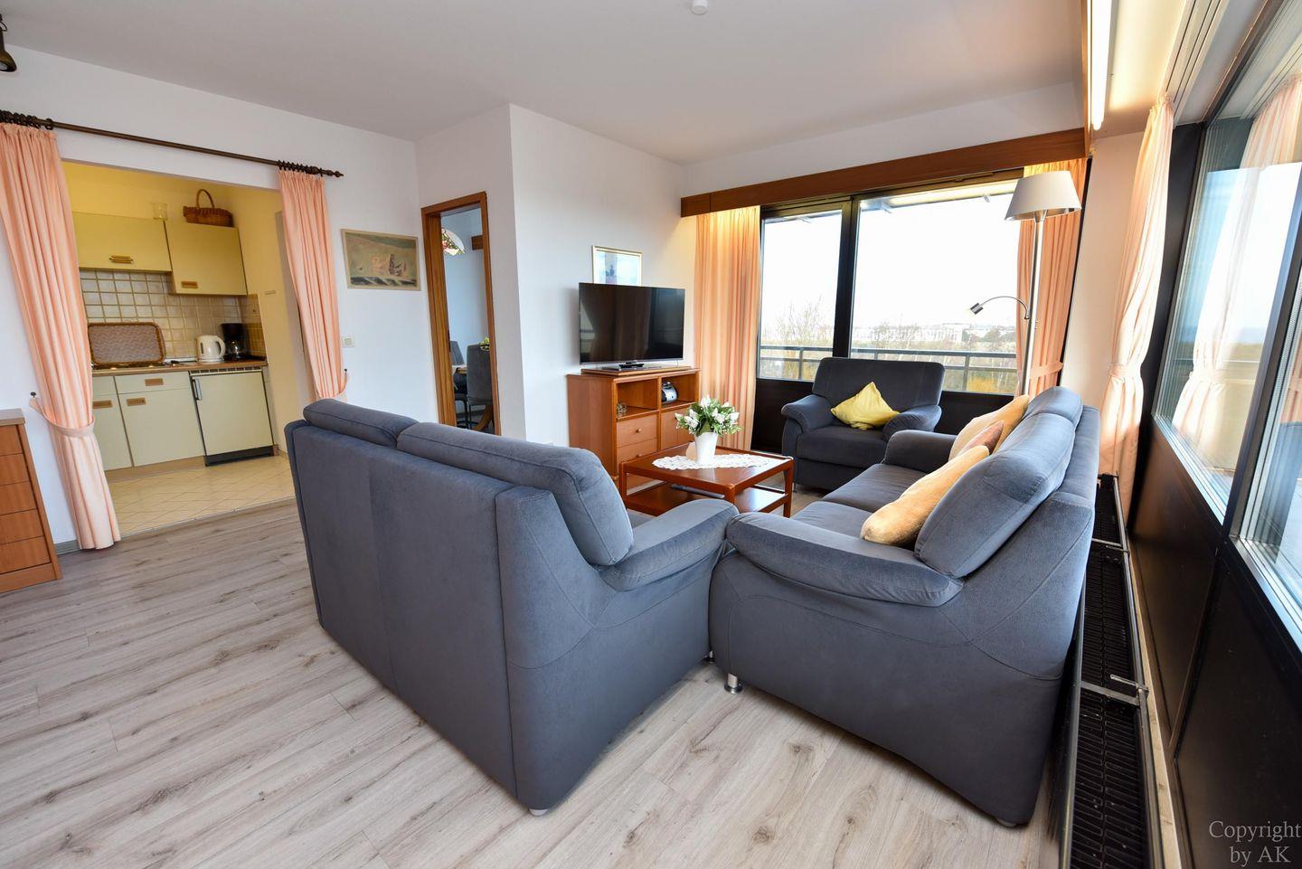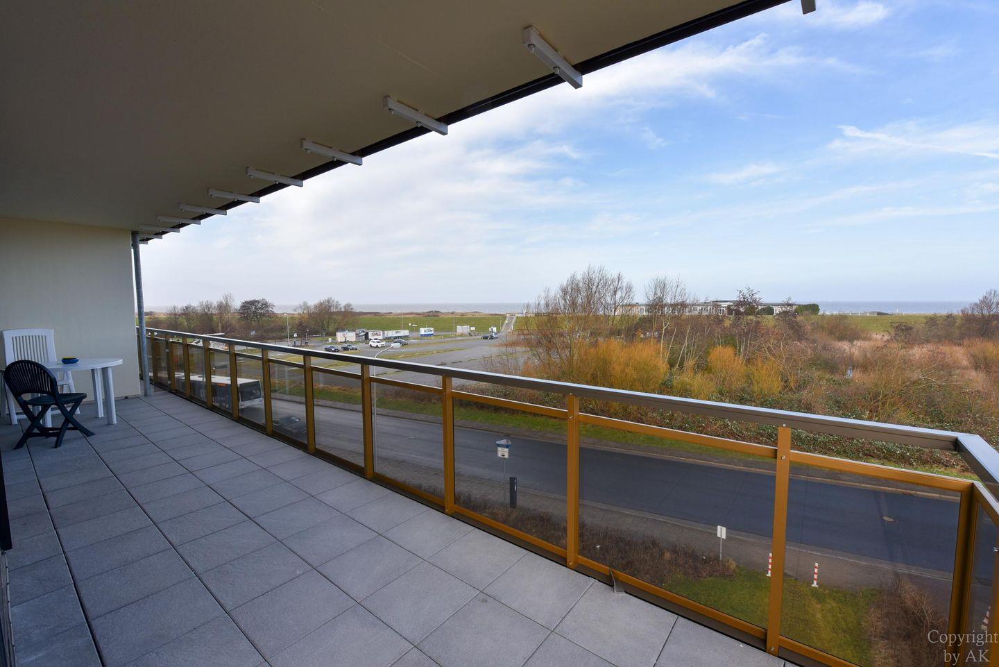 3-Zimmer Appartement für 2-4 Personen im 3. OG mit großem Balkon und Blick zum Weltschifffahrtsweg. Im Wohnbereich befinden sich u.a. zwei Schrankbetten, ein Sofa, Sessel und ein Tisch. Zugang zum großen Balkon haben Sie über zwei Türen. Es gibt ein Esszimmer mit Seeblick, welches für vier Personen ausgelegt ist und Zugang zum Balkon hat. Der dritte Raum ist der Schlafraum mit zwei Einzelbetten. Vom Wohnbereich geht es zur Küche, in der es auch eine Mikrowelle gibt. Das Appartement verfügt über ein Wannen-/ Duschbad mit WC. Der kostenlose Tiefgaragenstellplatz hat eine Einstellhöhe bis 149 cm.